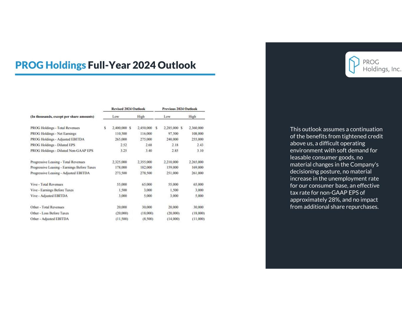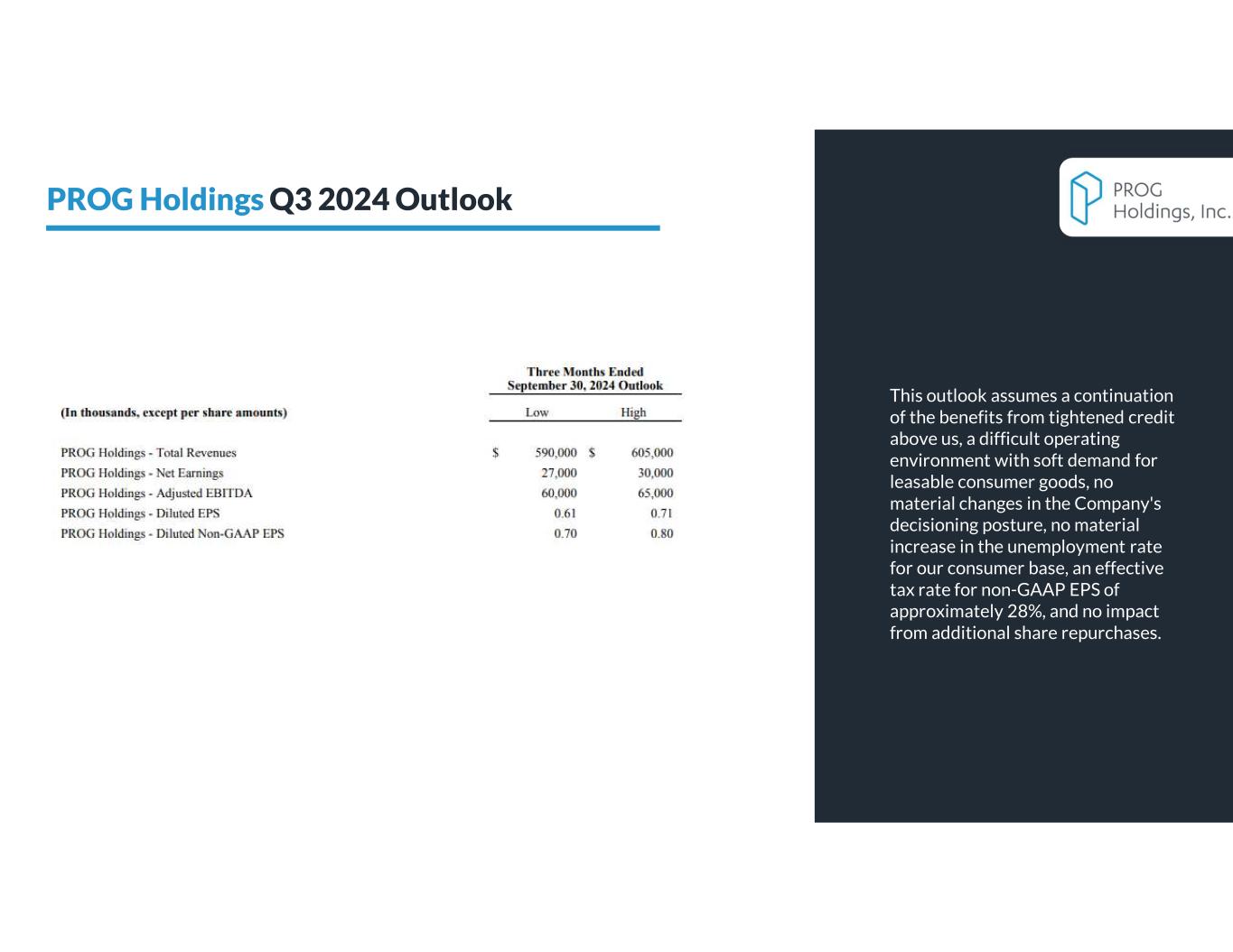 PROG Holdings is updating its full year 2024 outlook for revenue and earnings as well as providing its outlook for revenues, net earnings, adjusted EBITDA, GAAP diluted EPS and non-GAAP diluted EPS for the third quarter of 2024. This outlook assumes a continuation of the benefits from tightened credit above us, a difficult operating environment with soft demand for leasable consumer goods, no material changes in the Company's decisioning posture, no material increase in the unemployment rate for our consumer base, an effective tax rate for non-GAAP EPS of approximately 28%, and no impact from additional share repurchases.