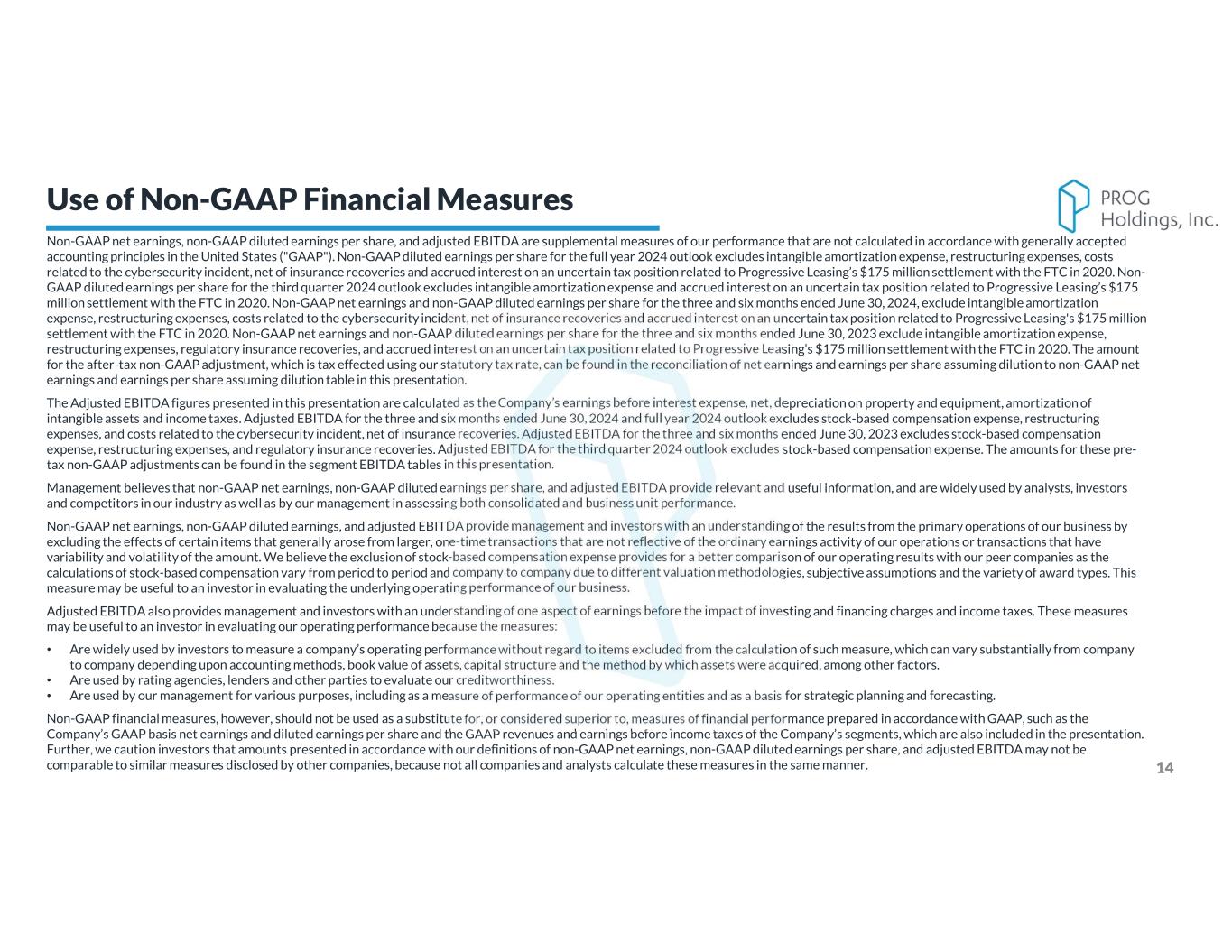 Non-GAAP net earnings, non-GAAP diluted earnings per share, and adjusted EBITDA are supplemental measures of our performance that are not calculated in accordance with generally accepted accounting principles in the United States ("GAAP"). Non-GAAP diluted earnings per share for the full year 2024 outlook excludes intangible amortization expense, restructuring expenses, costs related to the cybersecurity incident, net of insurance recoveries and accrued interest on an uncertain tax position related to Progressive Leasing’s $175 million settlement with the FTC in 2020. Non- GAAP diluted earnings per share for the third quarter 2024 outlook excludes intangible amortization expense and accrued interest on an uncertain tax position related to Progressive Leasing’s $175 million settlement with the FTC in 2020. Non-GAAP net earnings and non-GAAP diluted earnings per share for the three and six months ended June 30, 2024, exclude intangible amortization expense, restructuring expenses, costs related to the cybersecurity incident, net of insurance recoveries and accrued interest on an uncertain tax position related to Progressive Leasing's $175 million settlement with the FTC in 2020. Non-GAAP net earnings and non-GAAP diluted earnings per share for the three and six months ended June 30, 2023 exclude intangible amortization expense, restructuring expenses, regulatory insurance recoveries, and accrued interest on an uncertain tax position related to Progressive Leasing’s $175 million settlement with the FTC in 2020. The amount for the after-tax non-GAAP adjustment, which is tax effected using our statutory tax rate, can be found in the reconciliation of net earnings and earnings per share assuming dilution to non-GAAP net earnings and earnings per share assuming dilution table in this presentation. The Adjusted EBITDA figures presented in this presentation are calculated as the Company’s earnings before interest expense, net, depreciation on property and equipment, amortization of intangible assets and income taxes. Adjusted EBITDA for the three and six months ended June 30, 2024 and full year 2024 outlook excludes stock-based compensation expense, restructuring expenses, and costs related to the cybersecurity incident, net of insurance recoveries. Adjusted EBITDA for the three and six months ended June 30, 2023 excludes stock-based compensation expense, restructuring expenses, and regulatory insurance recoveries. Adjusted EBITDA for the third quarter 2024 outlook excludes stock-based compensation expense. The amounts for these pre- tax non-GAAP adjustments can be found in the segment EBITDA tables in this presentation. Management believes that non-GAAP net earnings, non-GAAP diluted earnings per share, and adjusted EBITDA provide relevant and useful information, and are widely used by analysts, investors and competitors in our industry as well as by our management in assessing both consolidated and business unit performance. Non-GAAP net earnings, non-GAAP diluted earnings, and adjusted EBITDA provide management and investors with an understanding of the results from the primary operations of our business by excluding the effects of certain items that generally arose from larger, one-time transactions that are not reflective of the ordinary earnings activity of our operations or transactions that have variability and volatility of the amount. We believe the exclusion of stock-based compensation expense provides for a better comparison of our operating results with our peer companies as the calculations of stock-based compensation vary from period to period and company to company due to different valuation methodologies, subjective assumptions and the variety of award types. This measure may be useful to an investor in evaluating the underlying operating performance of our business. Adjusted EBITDA also provides management and investors with an understanding of one aspect of earnings before the impact of investing and financing charges and income taxes. These measures may be useful to an investor in evaluating our operating performance because the measures: • Are widely used by investors to measure a company’s operating performance without regard to items excluded from the calculation of such measure, which can vary substantially from company to company depending upon accounting methods, book value of assets, capital structure and the method by which assets were acquired, among other factors. • Are used by rating agencies, lenders and other parties to evaluate our creditworthiness. • Are used by our management for various purposes, including as a measure of performance of our operating entities and as a basis for strategic planning and forecasting. Non-GAAP financial measures, however, should not be used as a substitute for, or considered superior to, measures of financial performance prepared in accordance with GAAP, such as the Company’s GAAP basis net earnings and diluted earnings per share and the GAAP revenues and earnings before income taxes of the Company’s segments, which are also included in the presentation. Further, we caution investors that amounts presented in accordance with our definitions of non-GAAP net earnings, non-GAAP diluted earnings per share, and adjusted EBITDA may not be comparable to similar measures disclosed by other companies, because not all companies and analysts calculate these measures in the same manner. 14 Use of Non-GAAP Financial Measures