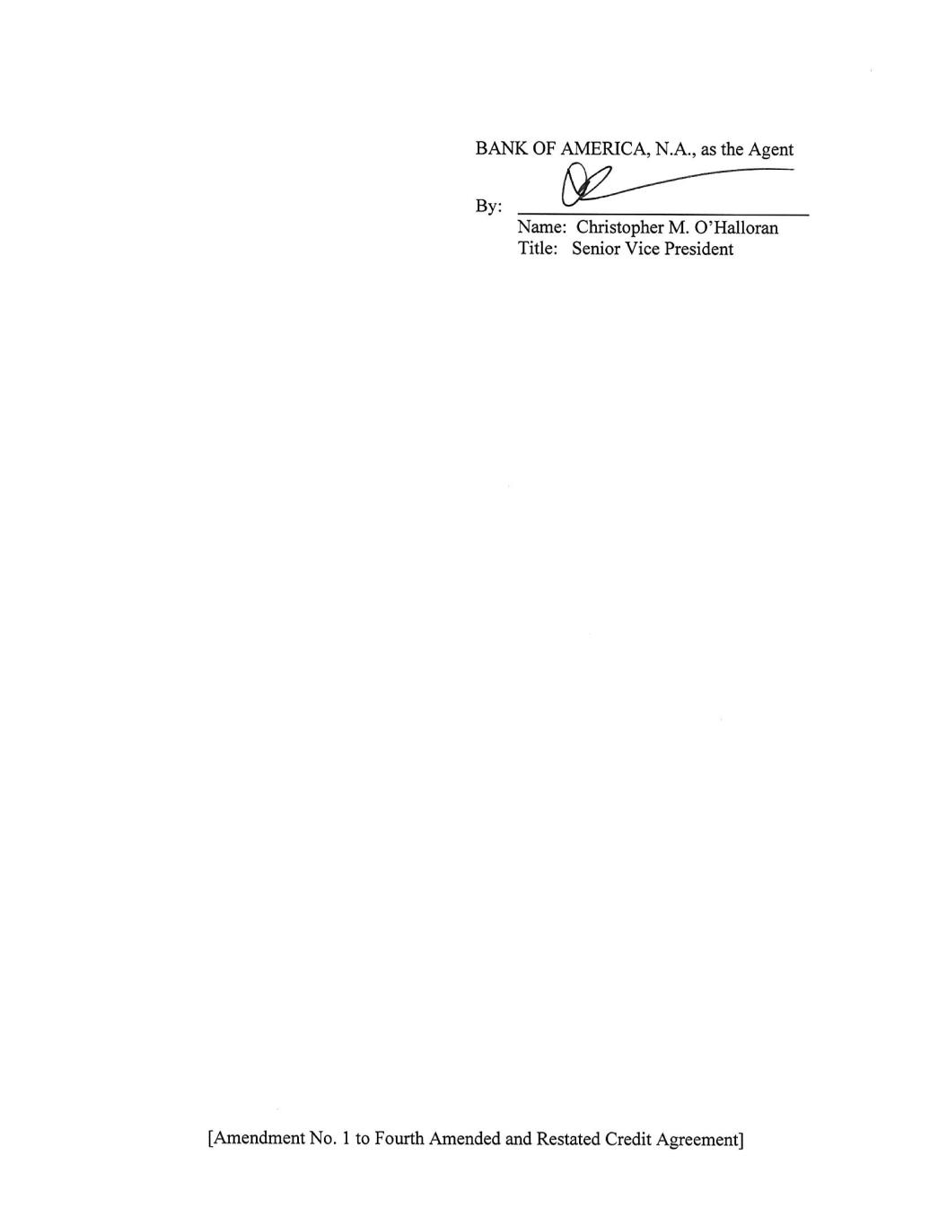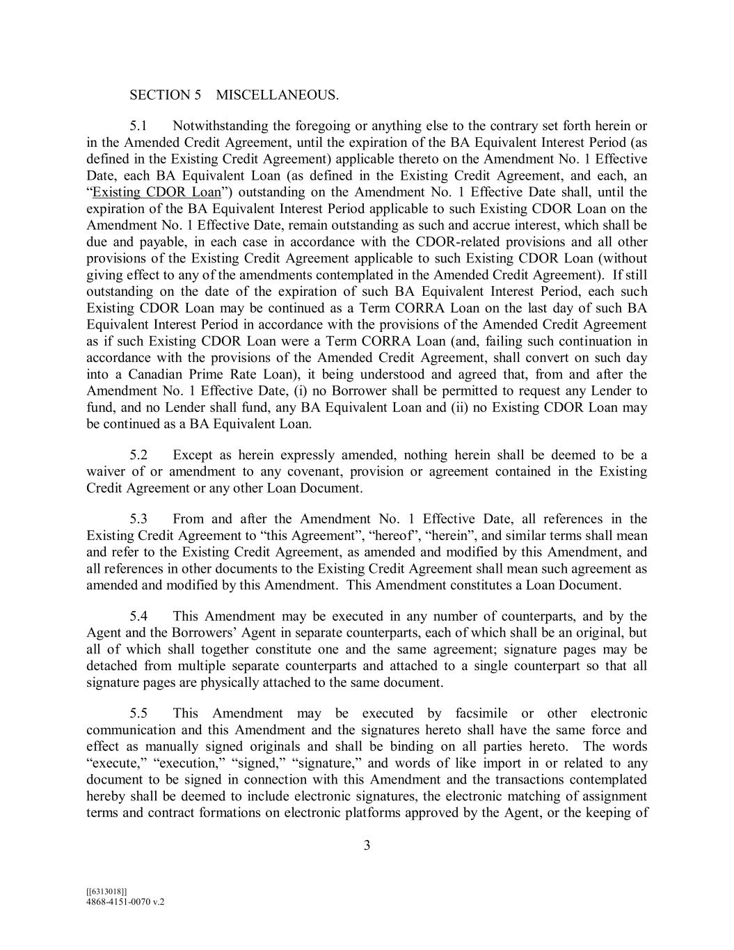 3 [[6313018]] 4868-4151-0070 v.2 SECTION 5 MISCELLANEOUS. 5.1 Notwithstanding the foregoing or anything else to the contrary set forth herein or in the Amended Credit Agreement, until the expiration of the BA Equivalent Interest Period (as defined in the Existing Credit Agreement) applicable thereto on the Amendment No. 1 Effective Date, each BA Equivalent Loan (as defined in the Existing Credit Agreement, and each, an “Existing CDOR Loan”) outstanding on the Amendment No. 1 Effective Date shall, until the expiration of the BA Equivalent Interest Period applicable to such Existing CDOR Loan on the Amendment No. 1 Effective Date, remain outstanding as such and accrue interest, which shall be due and payable, in each case in accordance with the CDOR-related provisions and all other provisions of the Existing Credit Agreement applicable to such Existing CDOR Loan (without giving effect to any of the amendments contemplated in the Amended Credit Agreement). If still outstanding on the date of the expiration of such BA Equivalent Interest Period, each such Existing CDOR Loan may be continued as a Term CORRA Loan on the last day of such BA Equivalent Interest Period in accordance with the provisions of the Amended Credit Agreement as if such Existing CDOR Loan were a Term CORRA Loan (and, failing such continuation in accordance with the provisions of the Amended Credit Agreement, shall convert on such day into a Canadian Prime Rate Loan), it being understood and agreed that, from and after the Amendment No. 1 Effective Date, (i) no Borrower shall be permitted to request any Lender to fund, and no Lender shall fund, any BA Equivalent Loan and (ii) no Existing CDOR Loan may be continued as a BA Equivalent Loan. 5.2 Except as herein expressly amended, nothing herein shall be deemed to be a waiver of or amendment to any covenant, provision or agreement contained in the Existing Credit Agreement or any other Loan Document. 5.3 From and after the Amendment No. 1 Effective Date, all references in the Existing Credit Agreement to “this Agreement”, “hereof”, “herein”, and similar terms shall mean and refer to the Existing Credit Agreement, as amended and modified by this Amendment, and all references in other documents to the Existing Credit Agreement shall mean such agreement as amended and modified by this Amendment. This Amendment constitutes a Loan Document. 5.4 This Amendment may be executed in any number of counterparts, and by the Agent and the Borrowers’ Agent in separate counterparts, each of which shall be an original, but all of which shall together constitute one and the same agreement; signature pages may be detached from multiple separate counterparts and attached to a single counterpart so that all signature pages are physically attached to the same document. 5.5 This Amendment may be executed by facsimile or other electronic communication and this Amendment and the signatures hereto shall have the same force and effect as manually signed originals and shall be binding on all parties hereto. The words “execute,” “execution,” “signed,” “signature,” and words of like import in or related to any document to be signed in connection with this Amendment and the transactions contemplated hereby shall be deemed to include electronic signatures, the electronic matching of assignment terms and contract formations on electronic platforms approved by the Agent, or the keeping of
