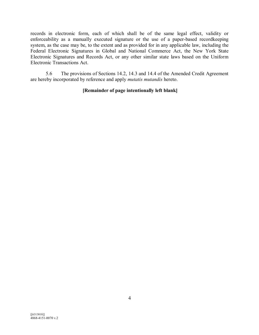 4 [[6313018]] 4868-4151-0070 v.2 records in electronic form, each of which shall be of the same legal effect, validity or enforceability as a manually executed signature or the use of a paper-based recordkeeping system, as the case may be, to the extent and as provided for in any applicable law, including the Federal Electronic Signatures in Global and National Commerce Act, the New York State Electronic Signatures and Records Act, or any other similar state laws based on the Uniform Electronic Transactions Act. 5.6 The provisions of Sections 14.2, 14.3 and 14.4 of the Amended Credit Agreement are hereby incorporated by reference and apply mutatis mutandis hereto. [Remainder of page intentionally left blank]