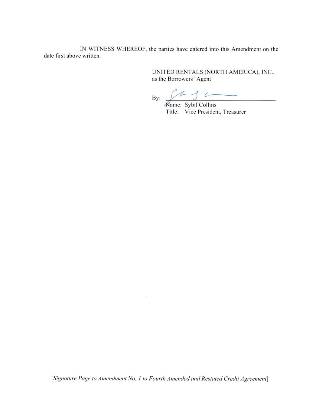 EXECUTION VERSION CONFIDENTIAL [[6313018]] 4868-4151-0070 v.2 AMENDMENT NO. 1 TO FOURTH AMENDED AND RESTATED CREDIT AGREEMENT AMENDMENT NO. 1 TO FOURTH AMENDED AND RESTATED CREDIT AGREEMENT, dated as of May 7, 2024 (this “Amendment”), to that certain Fourth Amended and Restated Credit Agreement, dated as of June 30, 2022 (as heretofore amended, restated, extended, supplemented or otherwise modified, the “Existing Credit Agreement”), among United Rentals, Inc., a Delaware corporation, as Guarantor, United Rentals (North America), Inc., a Delaware corporation, as Borrower (the “Borrowers’ Agent”), the other Borrowers party thereto, the other Guarantors party thereto, the financial institutions party thereto from time to time (the “Lenders”) and Bank of America, N.A., as agent for the Lenders (in such capacity, together with any successor in such capacity, the “Agent”), and the other parties thereto. WHEREAS, the Agent has made the determination referred to in Section 5.7(d) of the Existing Credit Agreement and, the Agent and the Borrowers’ Agent desire, in accordance with Section 5.7 of the Existing Credit Agreement and subject to the terms and conditions set forth below, to replace the BA Rate (as defined in the Existing Credit Agreement) for Canadian Revolving Loans with Term CORRA, make certain Benchmark Replacement Conforming Changes (as defined in the Existing Credit Agreement) and amend the Existing Credit Agreement on the terms set forth herein (the Existing Credit Agreement, as so amended, the “Amended Credit Agreement”). WHEREAS, in accordance with Section 5.7 of the Existing Credit Agreement, this Amendment shall become effective without any further action or consent of any other party to the Existing Credit Agreement at 5:00 p.m., New York City time, on the fifth Business Day after April 30, 2024 (the date on which a copy of this Amendment is provided to the Lenders), unless, prior to such time, Lenders constituting the Required Lenders have delivered to the Agent written notice that such Required Lenders object to this Amendment. NOW, THEREFORE, in consideration of the premises and the mutual covenants herein contained, for good and valuable consideration, the receipt and sufficiency of which are hereby acknowledged, it is agreed as follows: SECTION 1 CAPITALIZED TERMS. 1.1 Capitalized terms used but not defined herein shall have the respective meanings assigned to such terms in the Amended Credit Agreement. SECTION 2 AMENDMENT TO THE EXISTING CREDIT AGREEMENT. 2.1 Effective as of the Amendment No. 1 Effective Date (as defined below): (a) the Existing Credit Agreement is hereby amended by inserting the language indicated in single underlined text (indicated textually in the same manner as the following examples: single-underlined text or single-underlined text) in Exhibit A hereto and by deleting the language indicated by strikethrough text (indicated textually in Exhibit 10(b)