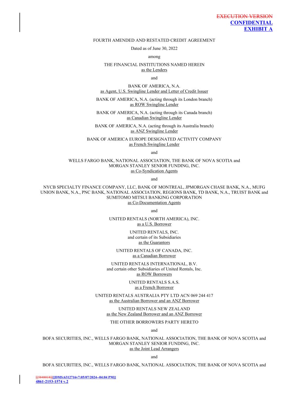 EXECUTION VERSION CONFIDENTIAL EXHIBIT A FOURTH AMENDED AND RESTATED CREDIT AGREEMENT Dated as of June 30, 2022 among THE FINANCIAL INSTITUTIONS NAMED HEREIN as the Lenders and BANK OF AMERICA, N.A. as Agent, U.S. Swingline Lender and Letter of Credit Issuer BANK OF AMERICA, N.A. (acting through its London branch) as ROW Swingline Lender BANK OF AMERICA, N.A. (acting through its Canada branch) as Canadian Swingline Lender BANK OF AMERICA, N.A. (acting through its Australia branch) as ANZ Swingline Lender BANK OF AMERICA EUROPE DESIGNATED ACTIVITY COMPANY as French Swingline Lender and WELLS FARGO BANK, NATIONAL ASSOCIATION, THE BANK OF NOVA SCOTIA and MORGAN STANLEY SENIOR FUNDING, INC. as Co-Syndication Agents and NYCB SPECIALTY FINANCE COMPANY, LLC, BANK OF MONTREAL, JPMORGAN CHASE BANK, N.A., MUFG UNION BANK, N.A., PNC BANK, NATIONAL ASSOCIATION, REGIONS BANK, TD BANK, N.A., TRUIST BANK and SUMITOMO MITSUI BANKING CORPORATION as Co-Documentation Agents and UNITED RENTALS (NORTH AMERICA), INC. as a U.S. Borrower UNITED RENTALS, INC. and certain of its Subsidiaries as the Guarantors UNITED RENTALS OF CANADA, INC. as a Canadian Borrower UNITED RENTALS INTERNATIONAL, B.V. and certain other Subsidiaries of United Rentals, Inc. as ROW Borrowers UNITED RENTALS S.A.S. as a French Borrower UNITED RENTALS AUSTRALIA PTY LTD ACN 069 244 417 as the Australian Borrower and an ANZ Borrower UNITED RENTALS NEW ZEALAND as the New Zealand Borrower and an ANZ Borrower THE OTHER BORROWERS PARTY HERETO and BOFA SECURITIES, INC., WELLS FARGO BANK, NATIONAL ASSOCIATION, THE BANK OF NOVA SCOTIA and MORGAN STANLEY SENIOR FUNDING, INC. as the Joint Lead Arrangers and BOFA SECURITIES, INC., WELLS FARGO BANK, NATIONAL ASSOCIATION, THE BANK OF NOVA SCOTIA and [[5848018]][[DMS:6312716v7:05/07/2024--04:04 PM]] 4861-2153-1574 v.2