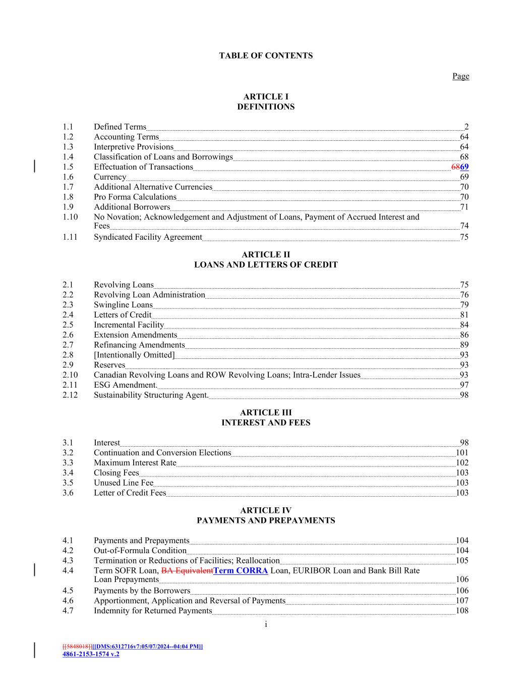 TABLE OF CONTENTS Page ARTICLE I DEFINITIONS 1.1 Defined Terms 2 1.2 Accounting Terms 64 1.3 Interpretive Provisions 64 1.4 Classification of Loans and Borrowings 68 1.5 Effectuation of Transactions 6869 1.6 Currency 69 1.7 Additional Alternative Currencies 70 1.8 Pro Forma Calculations 70 1.9 Additional Borrowers 71 1.10 No Novation; Acknowledgement and Adjustment of Loans, Payment of Accrued Interest and Fees 74 1.11 Syndicated Facility Agreement 75 ARTICLE II LOANS AND LETTERS OF CREDIT 2.1 Revolving Loans 75 2.2 Revolving Loan Administration 76 2.3 Swingline Loans 79 2.4 Letters of Credit 81 2.5 Incremental Facility 84 2.6 Extension Amendments 86 2.7 Refinancing Amendments 89 2.8 [Intentionally Omitted] 93 2.9 Reserves 93 2.10 Canadian Revolving Loans and ROW Revolving Loans; Intra-Lender Issues 93 2.11 ESG Amendment. 97 2.12 Sustainability Structuring Agent. 98 ARTICLE III INTEREST AND FEES 3.1 Interest 98 3.2 Continuation and Conversion Elections 101 3.3 Maximum Interest Rate 102 3.4 Closing Fees 103 3.5 Unused Line Fee 103 3.6 Letter of Credit Fees 103 ARTICLE IV PAYMENTS AND PREPAYMENTS 4.1 Payments and Prepayments 104 4.2 Out-of-Formula Condition 104 4.3 Termination or Reductions of Facilities; Reallocation 105 4.4 Term SOFR Loan, BA EquivalentTerm CORRA Loan, EURIBOR Loan and Bank Bill Rate Loan Prepayments 106 4.5 Payments by the Borrowers 106 4.6 Apportionment, Application and Reversal of Payments 107 4.7 Indemnity for Returned Payments 108 i [[5848018]][[DMS:6312716v7:05/07/2024--04:04 PM]] 4861-2153-1574 v.2