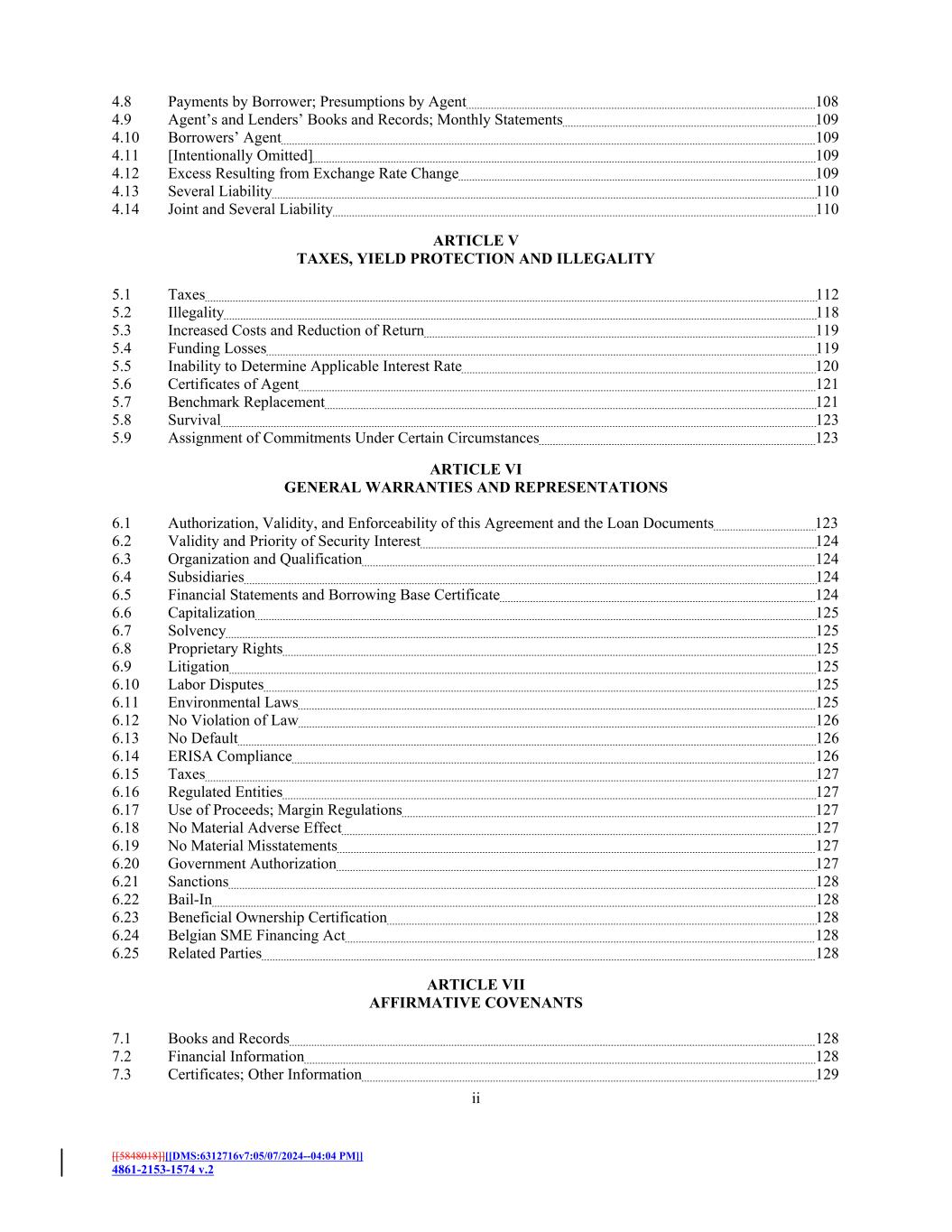 4.8 Payments by Borrower; Presumptions by Agent 108 4.9 Agent’s and Lenders’ Books and Records; Monthly Statements 109 4.10 Borrowers’ Agent 109 4.11 [Intentionally Omitted] 109 4.12 Excess Resulting from Exchange Rate Change 109 4.13 Several Liability 110 4.14 Joint and Several Liability 110 ARTICLE V TAXES, YIELD PROTECTION AND ILLEGALITY 5.1 Taxes 112 5.2 Illegality 118 5.3 Increased Costs and Reduction of Return 119 5.4 Funding Losses 119 5.5 Inability to Determine Applicable Interest Rate 120 5.6 Certificates of Agent 121 5.7 Benchmark Replacement 121 5.8 Survival 123 5.9 Assignment of Commitments Under Certain Circumstances 123 ARTICLE VI GENERAL WARRANTIES AND REPRESENTATIONS 6.1 Authorization, Validity, and Enforceability of this Agreement and the Loan Documents 123 6.2 Validity and Priority of Security Interest 124 6.3 Organization and Qualification 124 6.4 Subsidiaries 124 6.5 Financial Statements and Borrowing Base Certificate 124 6.6 Capitalization 125 6.7 Solvency 125 6.8 Proprietary Rights 125 6.9 Litigation 125 6.10 Labor Disputes 125 6.11 Environmental Laws 125 6.12 No Violation of Law 126 6.13 No Default 126 6.14 ERISA Compliance 126 6.15 Taxes 127 6.16 Regulated Entities 127 6.17 Use of Proceeds; Margin Regulations 127 6.18 No Material Adverse Effect 127 6.19 No Material Misstatements 127 6.20 Government Authorization 127 6.21 Sanctions 128 6.22 Bail-In 128 6.23 Beneficial Ownership Certification 128 6.24 Belgian SME Financing Act 128 6.25 Related Parties 128 ARTICLE VII AFFIRMATIVE COVENANTS 7.1 Books and Records 128 7.2 Financial Information 128 7.3 Certificates; Other Information 129 ii [[5848018]][[DMS:6312716v7:05/07/2024--04:04 PM]] 4861-2153-1574 v.2