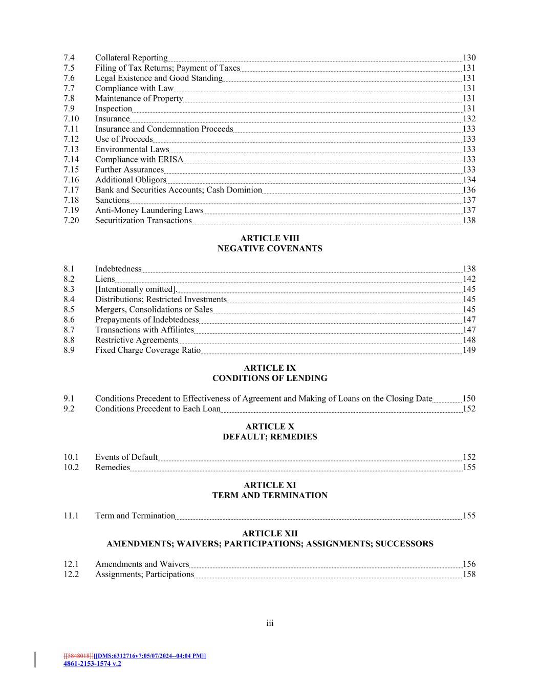 7.4 Collateral Reporting 130 7.5 Filing of Tax Returns; Payment of Taxes 131 7.6 Legal Existence and Good Standing 131 7.7 Compliance with Law 131 7.8 Maintenance of Property 131 7.9 Inspection 131 7.10 Insurance 132 7.11 Insurance and Condemnation Proceeds 133 7.12 Use of Proceeds 133 7.13 Environmental Laws 133 7.14 Compliance with ERISA 133 7.15 Further Assurances 133 7.16 Additional Obligors 134 7.17 Bank and Securities Accounts; Cash Dominion 136 7.18 Sanctions 137 7.19 Anti-Money Laundering Laws 137 7.20 Securitization Transactions 138 ARTICLE VIII NEGATIVE COVENANTS 8.1 Indebtedness 138 8.2 Liens 142 8.3 [Intentionally omitted]. 145 8.4 Distributions; Restricted Investments 145 8.5 Mergers, Consolidations or Sales 145 8.6 Prepayments of Indebtedness 147 8.7 Transactions with Affiliates 147 8.8 Restrictive Agreements 148 8.9 Fixed Charge Coverage Ratio 149 ARTICLE IX CONDITIONS OF LENDING 9.1 Conditions Precedent to Effectiveness of Agreement and Making of Loans on the Closing Date 150 9.2 Conditions Precedent to Each Loan 152 ARTICLE X DEFAULT; REMEDIES 10.1 Events of Default 152 10.2 Remedies 155 ARTICLE XI TERM AND TERMINATION 11.1 Term and Termination 155 ARTICLE XII AMENDMENTS; WAIVERS; PARTICIPATIONS; ASSIGNMENTS; SUCCESSORS 12.1 Amendments and Waivers 156 12.2 Assignments; Participations 158 iii [[5848018]][[DMS:6312716v7:05/07/2024--04:04 PM]] 4861-2153-1574 v.2