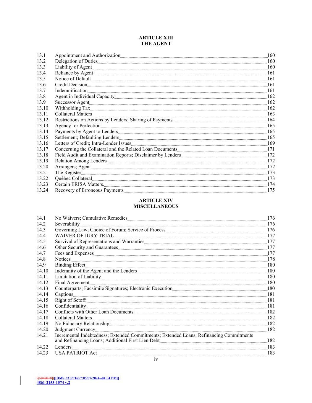 ARTICLE XIII THE AGENT 13.1 Appointment and Authorization 160 13.2 Delegation of Duties 160 13.3 Liability of Agent 160 13.4 Reliance by Agent 161 13.5 Notice of Default 161 13.6 Credit Decision 161 13.7 Indemnification 161 13.8 Agent in Individual Capacity 162 13.9 Successor Agent 162 13.10 Withholding Tax 162 13.11 Collateral Matters 163 13.12 Restrictions on Actions by Lenders; Sharing of Payments 164 13.13 Agency for Perfection 165 13.14 Payments by Agent to Lenders 165 13.15 Settlement; Defaulting Lenders 165 13.16 Letters of Credit; Intra-Lender Issues 169 13.17 Concerning the Collateral and the Related Loan Documents 171 13.18 Field Audit and Examination Reports; Disclaimer by Lenders 172 13.19 Relation Among Lenders 172 13.20 Arrangers; Agent 172 13.21 The Register 173 13.22 Québec Collateral 173 13.23 Certain ERISA Matters. 174 13.24 Recovery of Erroneous Payments 175 ARTICLE XIV MISCELLANEOUS 14.1 No Waivers; Cumulative Remedies 176 14.2 Severability 176 14.3 Governing Law; Choice of Forum; Service of Process 176 14.4 WAIVER OF JURY TRIAL 177 14.5 Survival of Representations and Warranties 177 14.6 Other Security and Guarantees 177 14.7 Fees and Expenses 177 14.8 Notices 178 14.9 Binding Effect 180 14.10 Indemnity of the Agent and the Lenders 180 14.11 Limitation of Liability 180 14.12 Final Agreement 180 14.13 Counterparts; Facsimile Signatures; Electronic Execution 180 14.14 Captions 181 14.15 Right of Setoff 181 14.16 Confidentiality 181 14.17 Conflicts with Other Loan Documents 182 14.18 Collateral Matters 182 14.19 No Fiduciary Relationship 182 14.20 Judgment Currency 182 14.21 Incremental Indebtedness; Extended Commitments; Extended Loans; Refinancing Commitments and Refinancing Loans; Additional First Lien Debt 182 14.22 Lenders 183 14.23 USA PATRIOT Act 183 iv [[5848018]][[DMS:6312716v7:05/07/2024--04:04 PM]] 4861-2153-1574 v.2