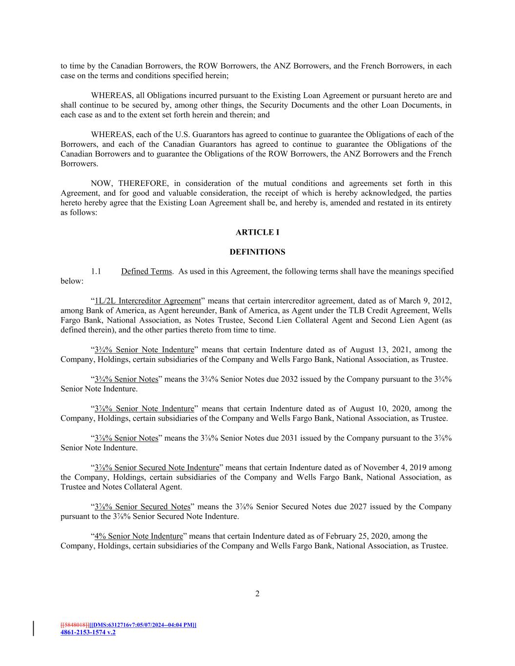 to time by the Canadian Borrowers, the ROW Borrowers, the ANZ Borrowers, and the French Borrowers, in each case on the terms and conditions specified herein; WHEREAS, all Obligations incurred pursuant to the Existing Loan Agreement or pursuant hereto are and shall continue to be secured by, among other things, the Security Documents and the other Loan Documents, in each case as and to the extent set forth herein and therein; and WHEREAS, each of the U.S. Guarantors has agreed to continue to guarantee the Obligations of each of the Borrowers, and each of the Canadian Guarantors has agreed to continue to guarantee the Obligations of the Canadian Borrowers and to guarantee the Obligations of the ROW Borrowers, the ANZ Borrowers and the French Borrowers. NOW, THEREFORE, in consideration of the mutual conditions and agreements set forth in this Agreement, and for good and valuable consideration, the receipt of which is hereby acknowledged, the parties hereto hereby agree that the Existing Loan Agreement shall be, and hereby is, amended and restated in its entirety as follows: ARTICLE I DEFINITIONS 1.1 Defined Terms. As used in this Agreement, the following terms shall have the meanings specified below: “1L/2L Intercreditor Agreement” means that certain intercreditor agreement, dated as of March 9, 2012, among Bank of America, as Agent hereunder, Bank of America, as Agent under the TLB Credit Agreement, Wells Fargo Bank, National Association, as Notes Trustee, Second Lien Collateral Agent and Second Lien Agent (as defined therein), and the other parties thereto from time to time. “3¾% Senior Note Indenture” means that certain Indenture dated as of August 13, 2021, among the Company, Holdings, certain subsidiaries of the Company and Wells Fargo Bank, National Association, as Trustee. “3¾% Senior Notes” means the 3¾% Senior Notes due 2032 issued by the Company pursuant to the 3¾% Senior Note Indenture. “3⅞% Senior Note Indenture” means that certain Indenture dated as of August 10, 2020, among the Company, Holdings, certain subsidiaries of the Company and Wells Fargo Bank, National Association, as Trustee. “3⅞% Senior Notes” means the 3⅞% Senior Notes due 2031 issued by the Company pursuant to the 3⅞% Senior Note Indenture. “3⅞% Senior Secured Note Indenture” means that certain Indenture dated as of November 4, 2019 among the Company, Holdings, certain subsidiaries of the Company and Wells Fargo Bank, National Association, as Trustee and Notes Collateral Agent. “3⅞% Senior Secured Notes” means the 3⅞% Senior Secured Notes due 2027 issued by the Company pursuant to the 3⅞% Senior Secured Note Indenture. “4% Senior Note Indenture” means that certain Indenture dated as of February 25, 2020, among the Company, Holdings, certain subsidiaries of the Company and Wells Fargo Bank, National Association, as Trustee. 2 [[5848018]][[DMS:6312716v7:05/07/2024--04:04 PM]] 4861-2153-1574 v.2