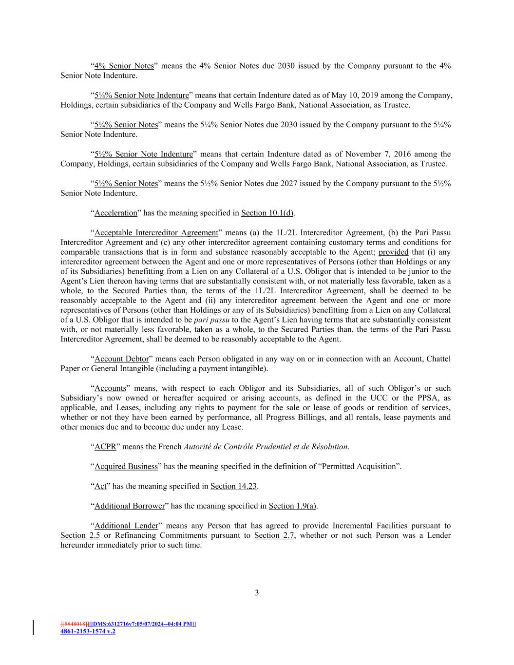 “4% Senior Notes” means the 4% Senior Notes due 2030 issued by the Company pursuant to the 4% Senior Note Indenture. “5¼% Senior Note Indenture” means that certain Indenture dated as of May 10, 2019 among the Company, Holdings, certain subsidiaries of the Company and Wells Fargo Bank, National Association, as Trustee. “5¼% Senior Notes” means the 5¼% Senior Notes due 2030 issued by the Company pursuant to the 5¼% Senior Note Indenture. “5½% Senior Note Indenture” means that certain Indenture dated as of November 7, 2016 among the Company, Holdings, certain subsidiaries of the Company and Wells Fargo Bank, National Association, as Trustee. “5½% Senior Notes” means the 5½% Senior Notes due 2027 issued by the Company pursuant to the 5½% Senior Note Indenture. “Acceleration” has the meaning specified in Section 10.1(d). “Acceptable Intercreditor Agreement” means (a) the 1L/2L Intercreditor Agreement, (b) the Pari Passu Intercreditor Agreement and (c) any other intercreditor agreement containing customary terms and conditions for comparable transactions that is in form and substance reasonably acceptable to the Agent; provided that (i) any intercreditor agreement between the Agent and one or more representatives of Persons (other than Holdings or any of its Subsidiaries) benefitting from a Lien on any Collateral of a U.S. Obligor that is intended to be junior to the Agent’s Lien thereon having terms that are substantially consistent with, or not materially less favorable, taken as a whole, to the Secured Parties than, the terms of the 1L/2L Intercreditor Agreement, shall be deemed to be reasonably acceptable to the Agent and (ii) any intercreditor agreement between the Agent and one or more representatives of Persons (other than Holdings or any of its Subsidiaries) benefitting from a Lien on any Collateral of a U.S. Obligor that is intended to be pari passu to the Agent’s Lien having terms that are substantially consistent with, or not materially less favorable, taken as a whole, to the Secured Parties than, the terms of the Pari Passu Intercreditor Agreement, shall be deemed to be reasonably acceptable to the Agent. “Account Debtor” means each Person obligated in any way on or in connection with an Account, Chattel Paper or General Intangible (including a payment intangible). “Accounts” means, with respect to each Obligor and its Subsidiaries, all of such Obligor’s or such Subsidiary’s now owned or hereafter acquired or arising accounts, as defined in the UCC or the PPSA, as applicable, and Leases, including any rights to payment for the sale or lease of goods or rendition of services, whether or not they have been earned by performance, all Progress Billings, and all rentals, lease payments and other monies due and to become due under any Lease. “ACPR” means the French Autorité de Contrôle Prudentiel et de Résolution. “Acquired Business” has the meaning specified in the definition of “Permitted Acquisition”. “Act” has the meaning specified in Section 14.23. “Additional Borrower” has the meaning specified in Section 1.9(a). “Additional Lender” means any Person that has agreed to provide Incremental Facilities pursuant to Section 2.5 or Refinancing Commitments pursuant to Section 2.7, whether or not such Person was a Lender hereunder immediately prior to such time. 3 [[5848018]][[DMS:6312716v7:05/07/2024--04:04 PM]] 4861-2153-1574 v.2