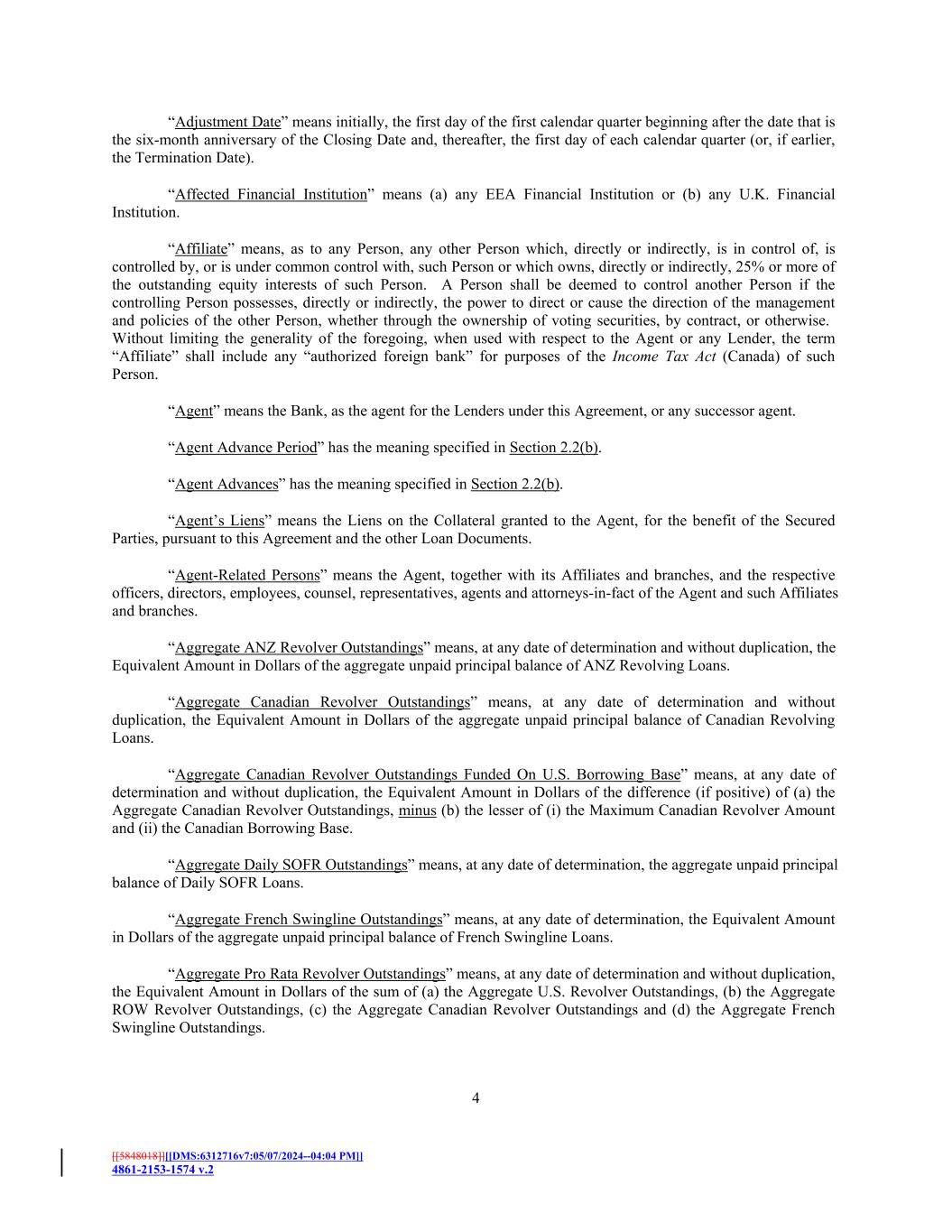 “Adjustment Date” means initially, the first day of the first calendar quarter beginning after the date that is the six-month anniversary of the Closing Date and, thereafter, the first day of each calendar quarter (or, if earlier, the Termination Date). “Affected Financial Institution” means (a) any EEA Financial Institution or (b) any U.K. Financial Institution. “Affiliate” means, as to any Person, any other Person which, directly or indirectly, is in control of, is controlled by, or is under common control with, such Person or which owns, directly or indirectly, 25% or more of the outstanding equity interests of such Person. A Person shall be deemed to control another Person if the controlling Person possesses, directly or indirectly, the power to direct or cause the direction of the management and policies of the other Person, whether through the ownership of voting securities, by contract, or otherwise. Without limiting the generality of the foregoing, when used with respect to the Agent or any Lender, the term “Affiliate” shall include any “authorized foreign bank” for purposes of the Income Tax Act (Canada) of such Person. “Agent” means the Bank, as the agent for the Lenders under this Agreement, or any successor agent. “Agent Advance Period” has the meaning specified in Section 2.2(b). “Agent Advances” has the meaning specified in Section 2.2(b). “Agent’s Liens” means the Liens on the Collateral granted to the Agent, for the benefit of the Secured Parties, pursuant to this Agreement and the other Loan Documents. “Agent-Related Persons” means the Agent, together with its Affiliates and branches, and the respective officers, directors, employees, counsel, representatives, agents and attorneys-in-fact of the Agent and such Affiliates and branches. “Aggregate ANZ Revolver Outstandings” means, at any date of determination and without duplication, the Equivalent Amount in Dollars of the aggregate unpaid principal balance of ANZ Revolving Loans. “Aggregate Canadian Revolver Outstandings” means, at any date of determination and without duplication, the Equivalent Amount in Dollars of the aggregate unpaid principal balance of Canadian Revolving Loans. “Aggregate Canadian Revolver Outstandings Funded On U.S. Borrowing Base” means, at any date of determination and without duplication, the Equivalent Amount in Dollars of the difference (if positive) of (a) the Aggregate Canadian Revolver Outstandings, minus (b) the lesser of (i) the Maximum Canadian Revolver Amount and (ii) the Canadian Borrowing Base. “Aggregate Daily SOFR Outstandings” means, at any date of determination, the aggregate unpaid principal balance of Daily SOFR Loans. “Aggregate French Swingline Outstandings” means, at any date of determination, the Equivalent Amount in Dollars of the aggregate unpaid principal balance of French Swingline Loans. “Aggregate Pro Rata Revolver Outstandings” means, at any date of determination and without duplication, the Equivalent Amount in Dollars of the sum of (a) the Aggregate U.S. Revolver Outstandings, (b) the Aggregate ROW Revolver Outstandings, (c) the Aggregate Canadian Revolver Outstandings and (d) the Aggregate French Swingline Outstandings. 4 [[5848018]][[DMS:6312716v7:05/07/2024--04:04 PM]] 4861-2153-1574 v.2