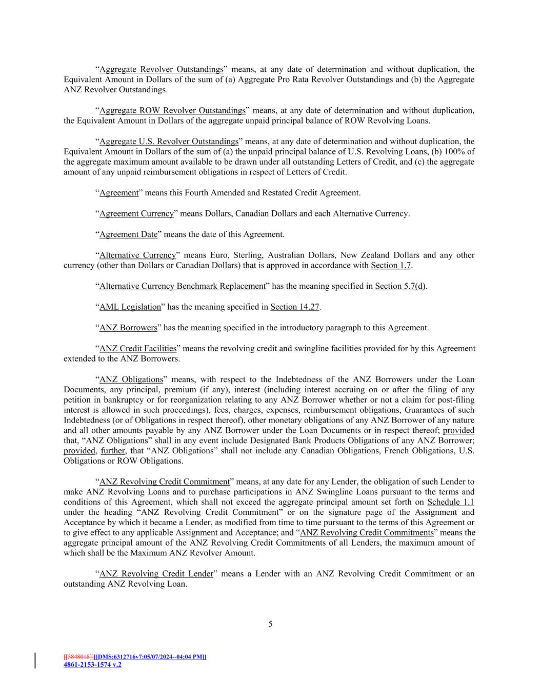 “Aggregate Revolver Outstandings” means, at any date of determination and without duplication, the Equivalent Amount in Dollars of the sum of (a) Aggregate Pro Rata Revolver Outstandings and (b) the Aggregate ANZ Revolver Outstandings. “Aggregate ROW Revolver Outstandings” means, at any date of determination and without duplication, the Equivalent Amount in Dollars of the aggregate unpaid principal balance of ROW Revolving Loans. “Aggregate U.S. Revolver Outstandings” means, at any date of determination and without duplication, the Equivalent Amount in Dollars of the sum of (a) the unpaid principal balance of U.S. Revolving Loans, (b) 100% of the aggregate maximum amount available to be drawn under all outstanding Letters of Credit, and (c) the aggregate amount of any unpaid reimbursement obligations in respect of Letters of Credit. “Agreement” means this Fourth Amended and Restated Credit Agreement. “Agreement Currency” means Dollars, Canadian Dollars and each Alternative Currency. “Agreement Date” means the date of this Agreement. “Alternative Currency” means Euro, Sterling, Australian Dollars, New Zealand Dollars and any other currency (other than Dollars or Canadian Dollars) that is approved in accordance with Section 1.7. “Alternative Currency Benchmark Replacement” has the meaning specified in Section 5.7(d). “AML Legislation” has the meaning specified in Section 14.27. “ANZ Borrowers” has the meaning specified in the introductory paragraph to this Agreement. “ANZ Credit Facilities” means the revolving credit and swingline facilities provided for by this Agreement extended to the ANZ Borrowers. “ANZ Obligations” means, with respect to the Indebtedness of the ANZ Borrowers under the Loan Documents, any principal, premium (if any), interest (including interest accruing on or after the filing of any petition in bankruptcy or for reorganization relating to any ANZ Borrower whether or not a claim for post-filing interest is allowed in such proceedings), fees, charges, expenses, reimbursement obligations, Guarantees of such Indebtedness (or of Obligations in respect thereof), other monetary obligations of any ANZ Borrower of any nature and all other amounts payable by any ANZ Borrower under the Loan Documents or in respect thereof; provided that, “ANZ Obligations” shall in any event include Designated Bank Products Obligations of any ANZ Borrower; provided, further, that “ANZ Obligations” shall not include any Canadian Obligations, French Obligations, U.S. Obligations or ROW Obligations. “ANZ Revolving Credit Commitment” means, at any date for any Lender, the obligation of such Lender to make ANZ Revolving Loans and to purchase participations in ANZ Swingline Loans pursuant to the terms and conditions of this Agreement, which shall not exceed the aggregate principal amount set forth on Schedule 1.1 under the heading “ANZ Revolving Credit Commitment” or on the signature page of the Assignment and Acceptance by which it became a Lender, as modified from time to time pursuant to the terms of this Agreement or to give effect to any applicable Assignment and Acceptance; and “ANZ Revolving Credit Commitments” means the aggregate principal amount of the ANZ Revolving Credit Commitments of all Lenders, the maximum amount of which shall be the Maximum ANZ Revolver Amount. “ANZ Revolving Credit Lender” means a Lender with an ANZ Revolving Credit Commitment or an outstanding ANZ Revolving Loan. 5 [[5848018]][[DMS:6312716v7:05/07/2024--04:04 PM]] 4861-2153-1574 v.2