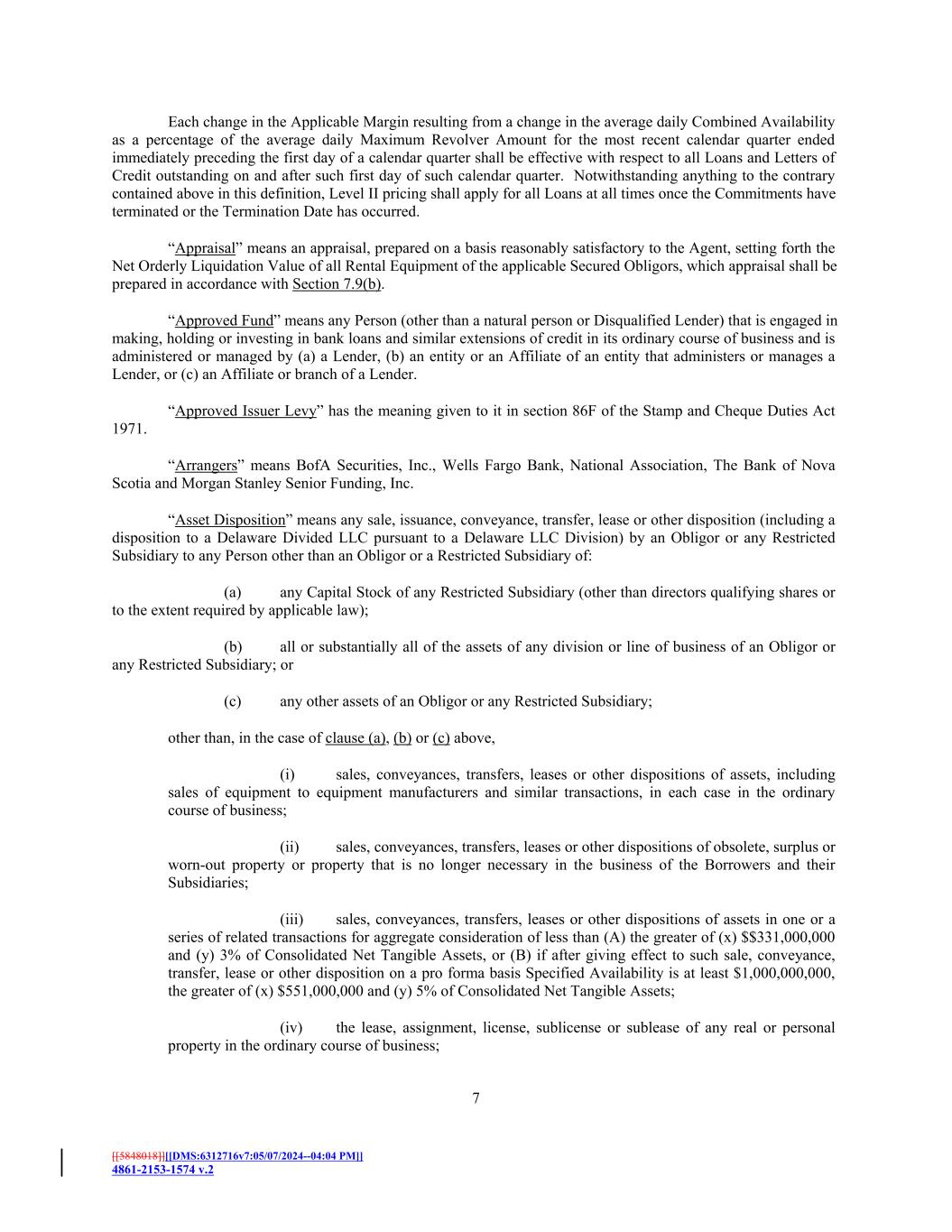 Each change in the Applicable Margin resulting from a change in the average daily Combined Availability as a percentage of the average daily Maximum Revolver Amount for the most recent calendar quarter ended immediately preceding the first day of a calendar quarter shall be effective with respect to all Loans and Letters of Credit outstanding on and after such first day of such calendar quarter. Notwithstanding anything to the contrary contained above in this definition, Level II pricing shall apply for all Loans at all times once the Commitments have terminated or the Termination Date has occurred. “Appraisal” means an appraisal, prepared on a basis reasonably satisfactory to the Agent, setting forth the Net Orderly Liquidation Value of all Rental Equipment of the applicable Secured Obligors, which appraisal shall be prepared in accordance with Section 7.9(b). “Approved Fund” means any Person (other than a natural person or Disqualified Lender) that is engaged in making, holding or investing in bank loans and similar extensions of credit in its ordinary course of business and is administered or managed by (a) a Lender, (b) an entity or an Affiliate of an entity that administers or manages a Lender, or (c) an Affiliate or branch of a Lender. “Approved Issuer Levy” has the meaning given to it in section 86F of the Stamp and Cheque Duties Act 1971. “Arrangers” means BofA Securities, Inc., Wells Fargo Bank, National Association, The Bank of Nova Scotia and Morgan Stanley Senior Funding, Inc. “Asset Disposition” means any sale, issuance, conveyance, transfer, lease or other disposition (including a disposition to a Delaware Divided LLC pursuant to a Delaware LLC Division) by an Obligor or any Restricted Subsidiary to any Person other than an Obligor or a Restricted Subsidiary of: (a) any Capital Stock of any Restricted Subsidiary (other than directors qualifying shares or to the extent required by applicable law); (b) all or substantially all of the assets of any division or line of business of an Obligor or any Restricted Subsidiary; or (c) any other assets of an Obligor or any Restricted Subsidiary; other than, in the case of clause (a), (b) or (c) above, (i) sales, conveyances, transfers, leases or other dispositions of assets, including sales of equipment to equipment manufacturers and similar transactions, in each case in the ordinary course of business; (ii) sales, conveyances, transfers, leases or other dispositions of obsolete, surplus or worn-out property or property that is no longer necessary in the business of the Borrowers and their Subsidiaries; (iii) sales, conveyances, transfers, leases or other dispositions of assets in one or a series of related transactions for aggregate consideration of less than (A) the greater of (x) $$331,000,000 and (y) 3% of Consolidated Net Tangible Assets, or (B) if after giving effect to such sale, conveyance, transfer, lease or other disposition on a pro forma basis Specified Availability is at least $1,000,000,000, the greater of (x) $551,000,000 and (y) 5% of Consolidated Net Tangible Assets; (iv) the lease, assignment, license, sublicense or sublease of any real or personal property in the ordinary course of business; 7 [[5848018]][[DMS:6312716v7:05/07/2024--04:04 PM]] 4861-2153-1574 v.2