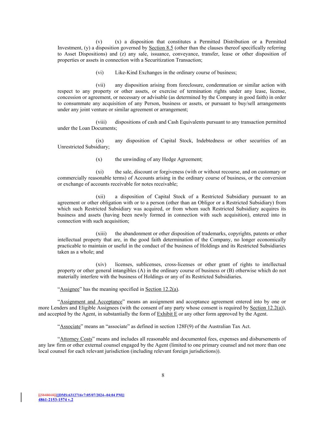 (v) (x) a disposition that constitutes a Permitted Distribution or a Permitted Investment, (y) a disposition governed by Section 8.5 (other than the clauses thereof specifically referring to Asset Dispositions) and (z) any sale, issuance, conveyance, transfer, lease or other disposition of properties or assets in connection with a Securitization Transaction; (vi) Like-Kind Exchanges in the ordinary course of business; (vii) any disposition arising from foreclosure, condemnation or similar action with respect to any property or other assets, or exercise of termination rights under any lease, license, concession or agreement, or necessary or advisable (as determined by the Company in good faith) in order to consummate any acquisition of any Person, business or assets, or pursuant to buy/sell arrangements under any joint venture or similar agreement or arrangement; (viii) dispositions of cash and Cash Equivalents pursuant to any transaction permitted under the Loan Documents; (ix) any disposition of Capital Stock, Indebtedness or other securities of an Unrestricted Subsidiary; (x) the unwinding of any Hedge Agreement; (xi) the sale, discount or forgiveness (with or without recourse, and on customary or commercially reasonable terms) of Accounts arising in the ordinary course of business, or the conversion or exchange of accounts receivable for notes receivable; (xii) a disposition of Capital Stock of a Restricted Subsidiary pursuant to an agreement or other obligation with or to a person (other than an Obligor or a Restricted Subsidiary) from which such Restricted Subsidiary was acquired, or from whom such Restricted Subsidiary acquires its business and assets (having been newly formed in connection with such acquisition), entered into in connection with such acquisition; (xiii) the abandonment or other disposition of trademarks, copyrights, patents or other intellectual property that are, in the good faith determination of the Company, no longer economically practicable to maintain or useful in the conduct of the business of Holdings and its Restricted Subsidiaries taken as a whole; and (xiv) licenses, sublicenses, cross-licenses or other grant of rights to intellectual property or other general intangibles (A) in the ordinary course of business or (B) otherwise which do not materially interfere with the business of Holdings or any of its Restricted Subsidiaries. “Assignee” has the meaning specified in Section 12.2(a). “Assignment and Acceptance” means an assignment and acceptance agreement entered into by one or more Lenders and Eligible Assignees (with the consent of any party whose consent is required by Section 12.2(a)), and accepted by the Agent, in substantially the form of Exhibit E or any other form approved by the Agent. “Associate” means an “associate” as defined in section 128F(9) of the Australian Tax Act. “Attorney Costs” means and includes all reasonable and documented fees, expenses and disbursements of any law firm or other external counsel engaged by the Agent (limited to one primary counsel and not more than one local counsel for each relevant jurisdiction (including relevant foreign jurisdictions)). 8 [[5848018]][[DMS:6312716v7:05/07/2024--04:04 PM]] 4861-2153-1574 v.2