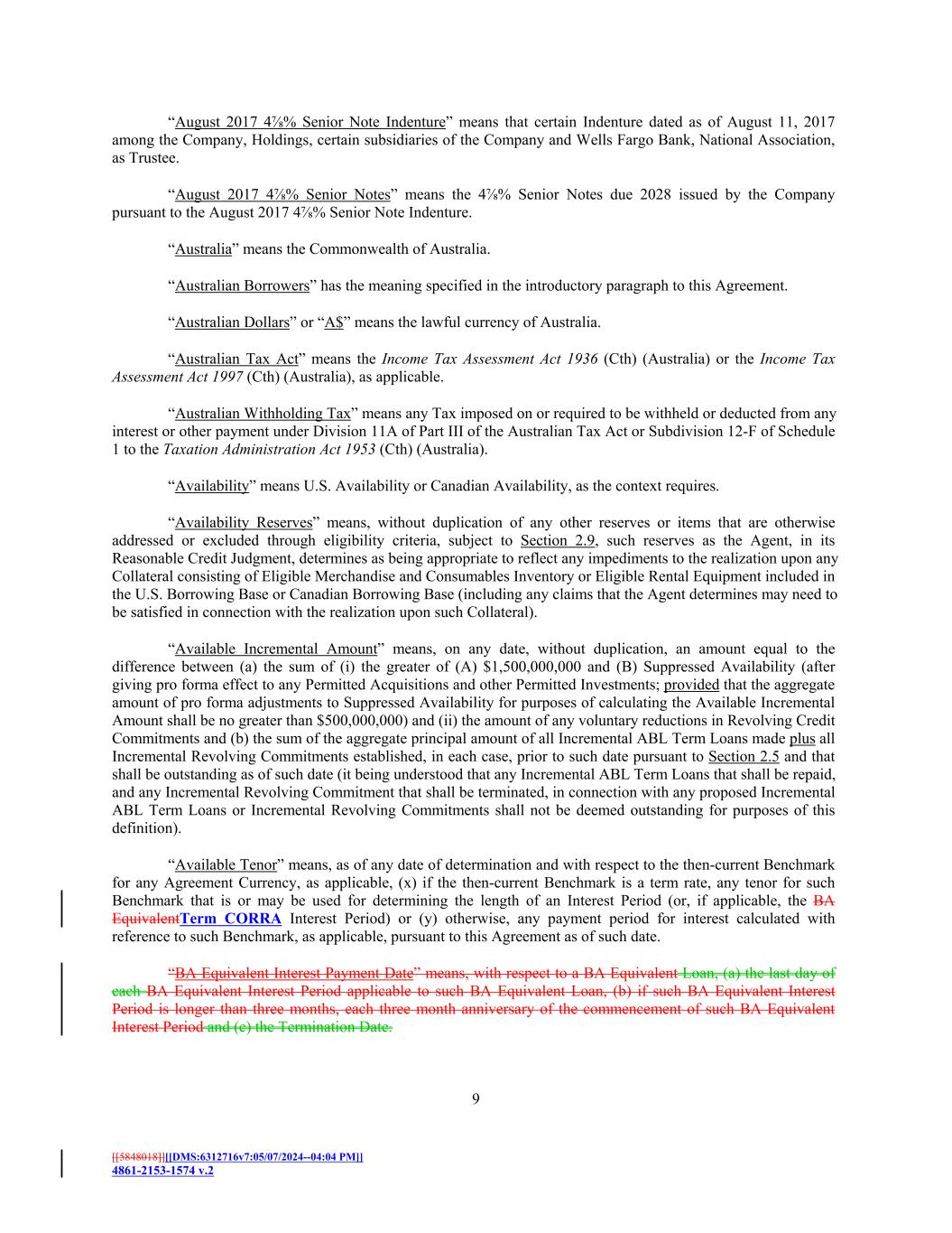 “August 2017 4⅞% Senior Note Indenture” means that certain Indenture dated as of August 11, 2017 among the Company, Holdings, certain subsidiaries of the Company and Wells Fargo Bank, National Association, as Trustee. “August 2017 4⅞% Senior Notes” means the 4⅞% Senior Notes due 2028 issued by the Company pursuant to the August 2017 4⅞% Senior Note Indenture. “Australia” means the Commonwealth of Australia. “Australian Borrowers” has the meaning specified in the introductory paragraph to this Agreement. “Australian Dollars” or “A$” means the lawful currency of Australia. “Australian Tax Act” means the Income Tax Assessment Act 1936 (Cth) (Australia) or the Income Tax Assessment Act 1997 (Cth) (Australia), as applicable. “Australian Withholding Tax” means any Tax imposed on or required to be withheld or deducted from any interest or other payment under Division 11A of Part III of the Australian Tax Act or Subdivision 12-F of Schedule 1 to the Taxation Administration Act 1953 (Cth) (Australia). “Availability” means U.S. Availability or Canadian Availability, as the context requires. “Availability Reserves” means, without duplication of any other reserves or items that are otherwise addressed or excluded through eligibility criteria, subject to Section 2.9, such reserves as the Agent, in its Reasonable Credit Judgment, determines as being appropriate to reflect any impediments to the realization upon any Collateral consisting of Eligible Merchandise and Consumables Inventory or Eligible Rental Equipment included in the U.S. Borrowing Base or Canadian Borrowing Base (including any claims that the Agent determines may need to be satisfied in connection with the realization upon such Collateral). “Available Incremental Amount” means, on any date, without duplication, an amount equal to the difference between (a) the sum of (i) the greater of (A) $1,500,000,000 and (B) Suppressed Availability (after giving pro forma effect to any Permitted Acquisitions and other Permitted Investments; provided that the aggregate amount of pro forma adjustments to Suppressed Availability for purposes of calculating the Available Incremental Amount shall be no greater than $500,000,000) and (ii) the amount of any voluntary reductions in Revolving Credit Commitments and (b) the sum of the aggregate principal amount of all Incremental ABL Term Loans made plus all Incremental Revolving Commitments established, in each case, prior to such date pursuant to Section 2.5 and that shall be outstanding as of such date (it being understood that any Incremental ABL Term Loans that shall be repaid, and any Incremental Revolving Commitment that shall be terminated, in connection with any proposed Incremental ABL Term Loans or Incremental Revolving Commitments shall not be deemed outstanding for purposes of this definition). “Available Tenor” means, as of any date of determination and with respect to the then-current Benchmark for any Agreement Currency, as applicable, (x) if the then-current Benchmark is a term rate, any tenor for such Benchmark that is or may be used for determining the length of an Interest Period (or, if applicable, the BA EquivalentTerm CORRA Interest Period) or (y) otherwise, any payment period for interest calculated with reference to such Benchmark, as applicable, pursuant to this Agreement as of such date. “BA Equivalent Interest Payment Date” means, with respect to a BA Equivalent Loan, (a) the last day of each BA Equivalent Interest Period applicable to such BA Equivalent Loan, (b) if such BA Equivalent Interest Period is longer than three months, each three month anniversary of the commencement of such BA Equivalent Interest Period and (c) the Termination Date. 9 [[5848018]][[DMS:6312716v7:05/07/2024--04:04 PM]] 4861-2153-1574 v.2