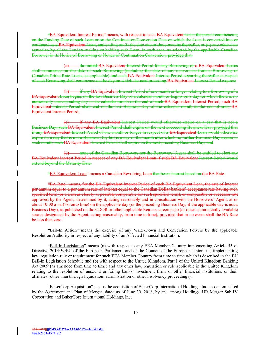 “BA Equivalent Interest Period” means, with respect to each BA Equivalent Loan, the period commencing on the Funding Date of such Loan or on the Continuation/Conversion Date on which the Loan is converted into or continued as a BA Equivalent Loan, and ending on (i) the date one or three months thereafter, or (ii) any other date agreed to by all the Lenders making or holding such Loan, in each case, as selected by the applicable Canadian Borrower in its Notice of Borrowing or Notice of Continuation/Conversion, provided that: (a) the initial BA Equivalent Interest Period for any Borrowing of a BA Equivalent Loans shall commence on the date of such Borrowing (including the date of any conversion from a Borrowing of Canadian Prime Rate Loans, as applicable) and each BA Equivalent Interest Period occurring thereafter in respect of such Borrowing shall commence on the day on which the next preceding BA Equivalent Interest Period expires; (b) if any BA Equivalent Interest Period of one month or longer relating to a Borrowing of a BA Equivalent Loan begins on the last Business Day of a calendar month or begins on a day for which there is no numerically corresponding day in the calendar month at the end of such BA Equivalent Interest Period, such BA Equivalent Interest Period shall end on the last Business Day of the calendar month at the end of such BA Equivalent Interest Period; (c) if any BA Equivalent Interest Period would otherwise expire on a day that is not a Business Day, such BA Equivalent Interest Period shall expire on the next succeeding Business Day, provided that if any BA Equivalent Interest Period of one month or longer in respect of a BA Equivalent Loan would otherwise expire on a day that is not a Business Day but is a day of the month after which no further Business Day occurs in such month, such BA Equivalent Interest Period shall expire on the next preceding Business Day; and (d) none of the Canadian Borrowers nor the Borrowers’ Agent shall be entitled to elect any BA Equivalent Interest Period in respect of any BA Equivalent Loan if such BA Equivalent Interest Period would extend beyond the Maturity Date. “BA Equivalent Loan” means a Canadian Revolving Loan that bears interest based on the BA Rate. “BA Rate” means, for the BA Equivalent Interest Period of each BA Equivalent Loan, the rate of interest per annum equal to a per annum rate of interest equal to the Canadian Dollar bankers’ acceptance rate having such specified term (or a term as closely as possible comparable for such specified term), or comparable or successor rate approved by the Agent, determined by it, acting reasonably and in consultation with the Borrowers’ Agent, at or about 10:00 a.m. (Toronto time) on the applicable day (or the preceding Business Day, if the applicable day is not a Business Day), as published on the CDOR or other applicable Reuters screen page (or other commercially available source designated by the Agent, acting reasonably, from time to time); provided that in no event shall the BA Rate be less than zero. “Bail-In Action” means the exercise of any Write-Down and Conversion Powers by the applicable Resolution Authority in respect of any liability of an Affected Financial Institution. “Bail-In Legislation” means (a) with respect to any EEA Member Country implementing Article 55 of Directive 2014/59/EU of the European Parliament and of the Council of the European Union, the implementing law, regulation rule or requirement for such EEA Member Country from time to time which is described in the EU Bail-In Legislation Schedule and (b) with respect to the United Kingdom, Part I of the United Kingdom Banking Act 2009 (as amended from time to time) and any other law, regulation or rule applicable in the United Kingdom relating to the resolution of unsound or failing banks, investment firms or other financial institutions or their affiliates (other than through liquidation, administration or other insolvency proceedings). “BakerCorp Acquisition” means the acquisition of BakerCorp International Holdings, Inc. as contemplated by the Agreement and Plan of Merger, dated as of June 30, 2018, by and among Holdings, UR Merger Sub IV Corporation and BakerCorp International Holdings, Inc. 10 [[5848018]][[DMS:6312716v7:05/07/2024--04:04 PM]] 4861-2153-1574 v.2