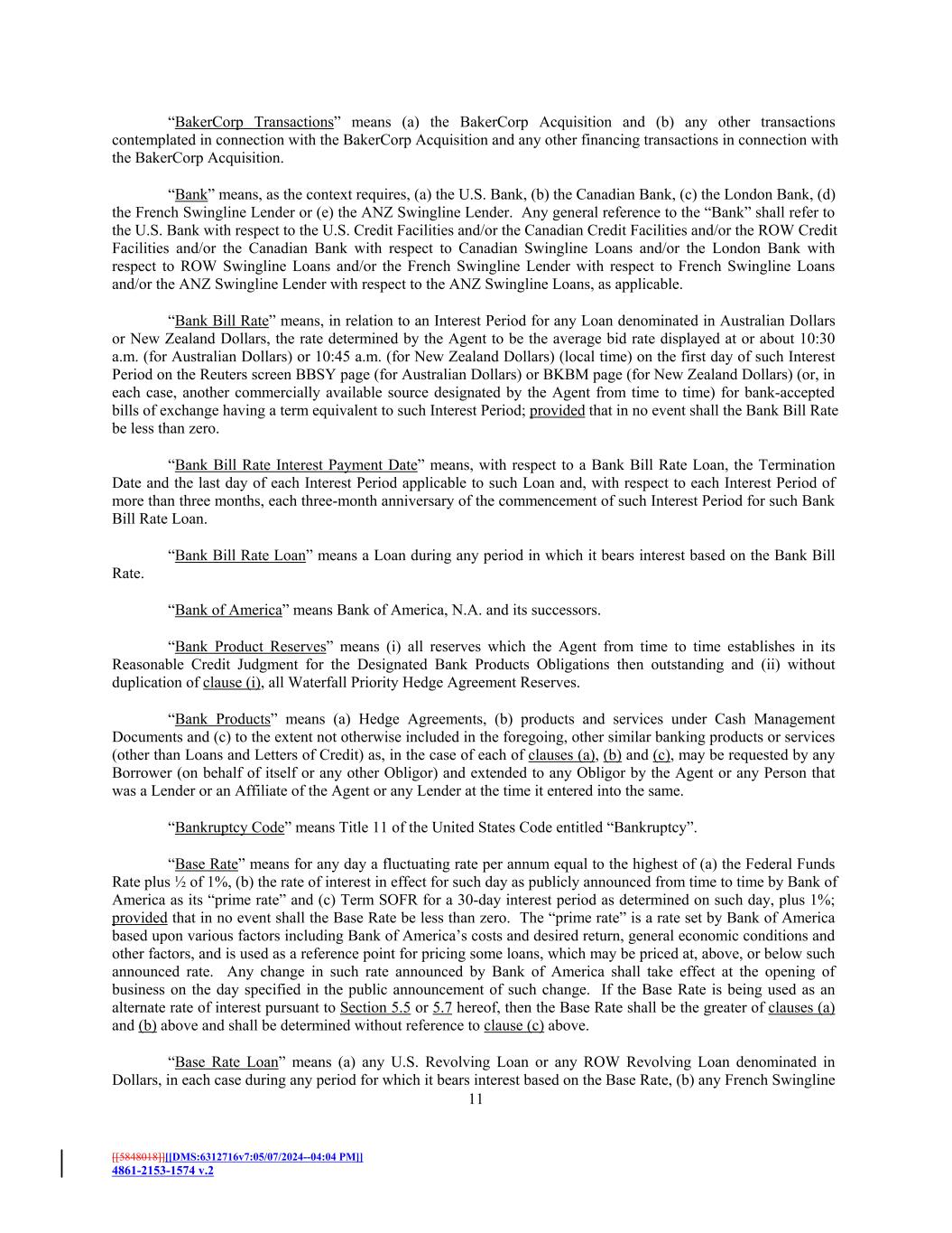 “BakerCorp Transactions” means (a) the BakerCorp Acquisition and (b) any other transactions contemplated in connection with the BakerCorp Acquisition and any other financing transactions in connection with the BakerCorp Acquisition. “Bank” means, as the context requires, (a) the U.S. Bank, (b) the Canadian Bank, (c) the London Bank, (d) the French Swingline Lender or (e) the ANZ Swingline Lender. Any general reference to the “Bank” shall refer to the U.S. Bank with respect to the U.S. Credit Facilities and/or the Canadian Credit Facilities and/or the ROW Credit Facilities and/or the Canadian Bank with respect to Canadian Swingline Loans and/or the London Bank with respect to ROW Swingline Loans and/or the French Swingline Lender with respect to French Swingline Loans and/or the ANZ Swingline Lender with respect to the ANZ Swingline Loans, as applicable. “Bank Bill Rate” means, in relation to an Interest Period for any Loan denominated in Australian Dollars or New Zealand Dollars, the rate determined by the Agent to be the average bid rate displayed at or about 10:30 a.m. (for Australian Dollars) or 10:45 a.m. (for New Zealand Dollars) (local time) on the first day of such Interest Period on the Reuters screen BBSY page (for Australian Dollars) or BKBM page (for New Zealand Dollars) (or, in each case, another commercially available source designated by the Agent from time to time) for bank-accepted bills of exchange having a term equivalent to such Interest Period; provided that in no event shall the Bank Bill Rate be less than zero. “Bank Bill Rate Interest Payment Date” means, with respect to a Bank Bill Rate Loan, the Termination Date and the last day of each Interest Period applicable to such Loan and, with respect to each Interest Period of more than three months, each three-month anniversary of the commencement of such Interest Period for such Bank Bill Rate Loan. “Bank Bill Rate Loan” means a Loan during any period in which it bears interest based on the Bank Bill Rate. “Bank of America” means Bank of America, N.A. and its successors. “Bank Product Reserves” means (i) all reserves which the Agent from time to time establishes in its Reasonable Credit Judgment for the Designated Bank Products Obligations then outstanding and (ii) without duplication of clause (i), all Waterfall Priority Hedge Agreement Reserves. “Bank Products” means (a) Hedge Agreements, (b) products and services under Cash Management Documents and (c) to the extent not otherwise included in the foregoing, other similar banking products or services (other than Loans and Letters of Credit) as, in the case of each of clauses (a), (b) and (c), may be requested by any Borrower (on behalf of itself or any other Obligor) and extended to any Obligor by the Agent or any Person that was a Lender or an Affiliate of the Agent or any Lender at the time it entered into the same. “Bankruptcy Code” means Title 11 of the United States Code entitled “Bankruptcy”. “Base Rate” means for any day a fluctuating rate per annum equal to the highest of (a) the Federal Funds Rate plus ½ of 1%, (b) the rate of interest in effect for such day as publicly announced from time to time by Bank of America as its “prime rate” and (c) Term SOFR for a 30-day interest period as determined on such day, plus 1%; provided that in no event shall the Base Rate be less than zero. The “prime rate” is a rate set by Bank of America based upon various factors including Bank of America’s costs and desired return, general economic conditions and other factors, and is used as a reference point for pricing some loans, which may be priced at, above, or below such announced rate. Any change in such rate announced by Bank of America shall take effect at the opening of business on the day specified in the public announcement of such change. If the Base Rate is being used as an alternate rate of interest pursuant to Section 5.5 or 5.7 hereof, then the Base Rate shall be the greater of clauses (a) and (b) above and shall be determined without reference to clause (c) above. “Base Rate Loan” means (a) any U.S. Revolving Loan or any ROW Revolving Loan denominated in Dollars, in each case during any period for which it bears interest based on the Base Rate, (b) any French Swingline 11 [[5848018]][[DMS:6312716v7:05/07/2024--04:04 PM]] 4861-2153-1574 v.2