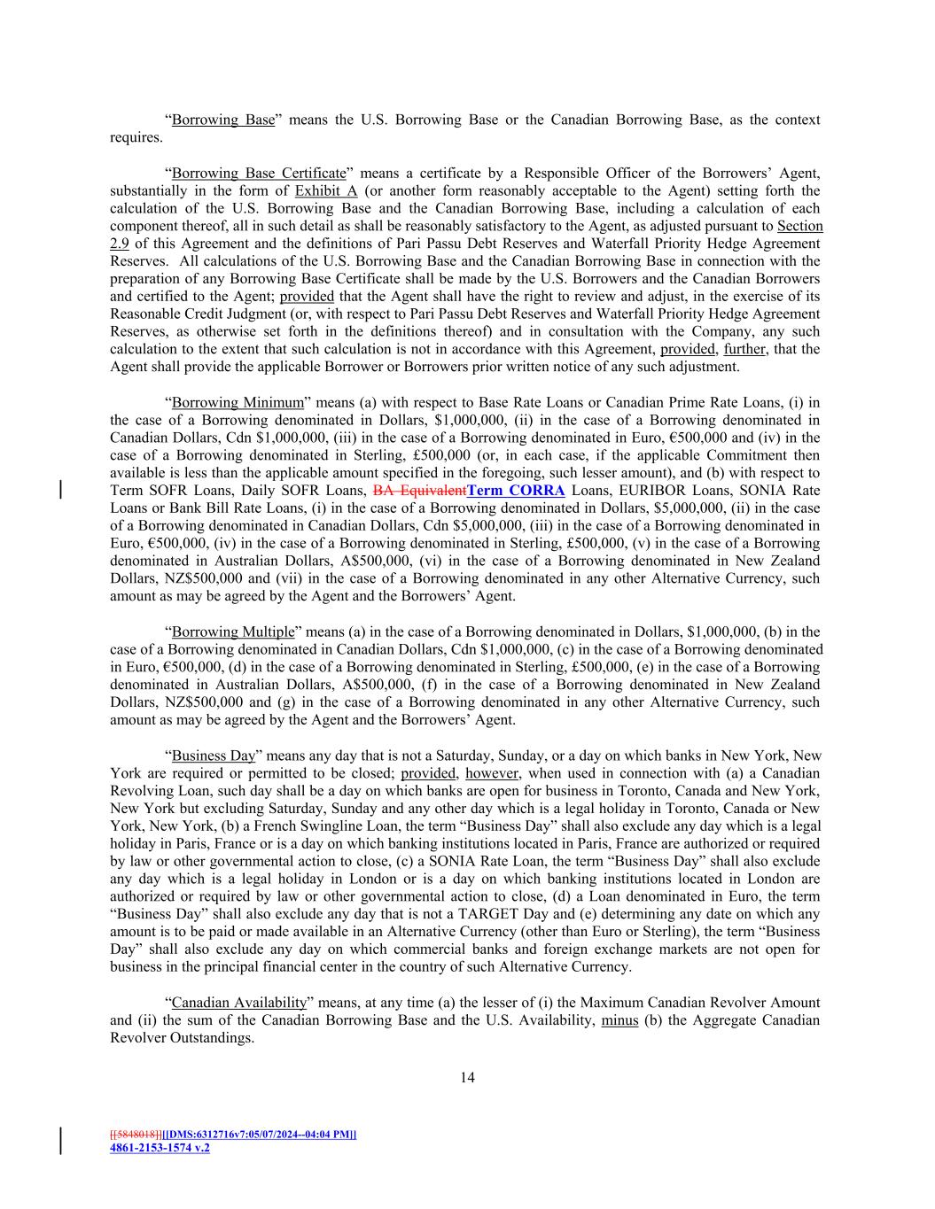 “Borrowing Base” means the U.S. Borrowing Base or the Canadian Borrowing Base, as the context requires. “Borrowing Base Certificate” means a certificate by a Responsible Officer of the Borrowers’ Agent, substantially in the form of Exhibit A (or another form reasonably acceptable to the Agent) setting forth the calculation of the U.S. Borrowing Base and the Canadian Borrowing Base, including a calculation of each component thereof, all in such detail as shall be reasonably satisfactory to the Agent, as adjusted pursuant to Section 2.9 of this Agreement and the definitions of Pari Passu Debt Reserves and Waterfall Priority Hedge Agreement Reserves. All calculations of the U.S. Borrowing Base and the Canadian Borrowing Base in connection with the preparation of any Borrowing Base Certificate shall be made by the U.S. Borrowers and the Canadian Borrowers and certified to the Agent; provided that the Agent shall have the right to review and adjust, in the exercise of its Reasonable Credit Judgment (or, with respect to Pari Passu Debt Reserves and Waterfall Priority Hedge Agreement Reserves, as otherwise set forth in the definitions thereof) and in consultation with the Company, any such calculation to the extent that such calculation is not in accordance with this Agreement, provided, further, that the Agent shall provide the applicable Borrower or Borrowers prior written notice of any such adjustment. “Borrowing Minimum” means (a) with respect to Base Rate Loans or Canadian Prime Rate Loans, (i) in the case of a Borrowing denominated in Dollars, $1,000,000, (ii) in the case of a Borrowing denominated in Canadian Dollars, Cdn $1,000,000, (iii) in the case of a Borrowing denominated in Euro, €500,000 and (iv) in the case of a Borrowing denominated in Sterling, £500,000 (or, in each case, if the applicable Commitment then available is less than the applicable amount specified in the foregoing, such lesser amount), and (b) with respect to Term SOFR Loans, Daily SOFR Loans, BA EquivalentTerm CORRA Loans, EURIBOR Loans, SONIA Rate Loans or Bank Bill Rate Loans, (i) in the case of a Borrowing denominated in Dollars, $5,000,000, (ii) in the case of a Borrowing denominated in Canadian Dollars, Cdn $5,000,000, (iii) in the case of a Borrowing denominated in Euro, €500,000, (iv) in the case of a Borrowing denominated in Sterling, £500,000, (v) in the case of a Borrowing denominated in Australian Dollars, A$500,000, (vi) in the case of a Borrowing denominated in New Zealand Dollars, NZ$500,000 and (vii) in the case of a Borrowing denominated in any other Alternative Currency, such amount as may be agreed by the Agent and the Borrowers’ Agent. “Borrowing Multiple” means (a) in the case of a Borrowing denominated in Dollars, $1,000,000, (b) in the case of a Borrowing denominated in Canadian Dollars, Cdn $1,000,000, (c) in the case of a Borrowing denominated in Euro, €500,000, (d) in the case of a Borrowing denominated in Sterling, £500,000, (e) in the case of a Borrowing denominated in Australian Dollars, A$500,000, (f) in the case of a Borrowing denominated in New Zealand Dollars, NZ$500,000 and (g) in the case of a Borrowing denominated in any other Alternative Currency, such amount as may be agreed by the Agent and the Borrowers’ Agent. “Business Day” means any day that is not a Saturday, Sunday, or a day on which banks in New York, New York are required or permitted to be closed; provided, however, when used in connection with (a) a Canadian Revolving Loan, such day shall be a day on which banks are open for business in Toronto, Canada and New York, New York but excluding Saturday, Sunday and any other day which is a legal holiday in Toronto, Canada or New York, New York, (b) a French Swingline Loan, the term “Business Day” shall also exclude any day which is a legal holiday in Paris, France or is a day on which banking institutions located in Paris, France are authorized or required by law or other governmental action to close, (c) a SONIA Rate Loan, the term “Business Day” shall also exclude any day which is a legal holiday in London or is a day on which banking institutions located in London are authorized or required by law or other governmental action to close, (d) a Loan denominated in Euro, the term “Business Day” shall also exclude any day that is not a TARGET Day and (e) determining any date on which any amount is to be paid or made available in an Alternative Currency (other than Euro or Sterling), the term “Business Day” shall also exclude any day on which commercial banks and foreign exchange markets are not open for business in the principal financial center in the country of such Alternative Currency. “Canadian Availability” means, at any time (a) the lesser of (i) the Maximum Canadian Revolver Amount and (ii) the sum of the Canadian Borrowing Base and the U.S. Availability, minus (b) the Aggregate Canadian Revolver Outstandings. 14 [[5848018]][[DMS:6312716v7:05/07/2024--04:04 PM]] 4861-2153-1574 v.2