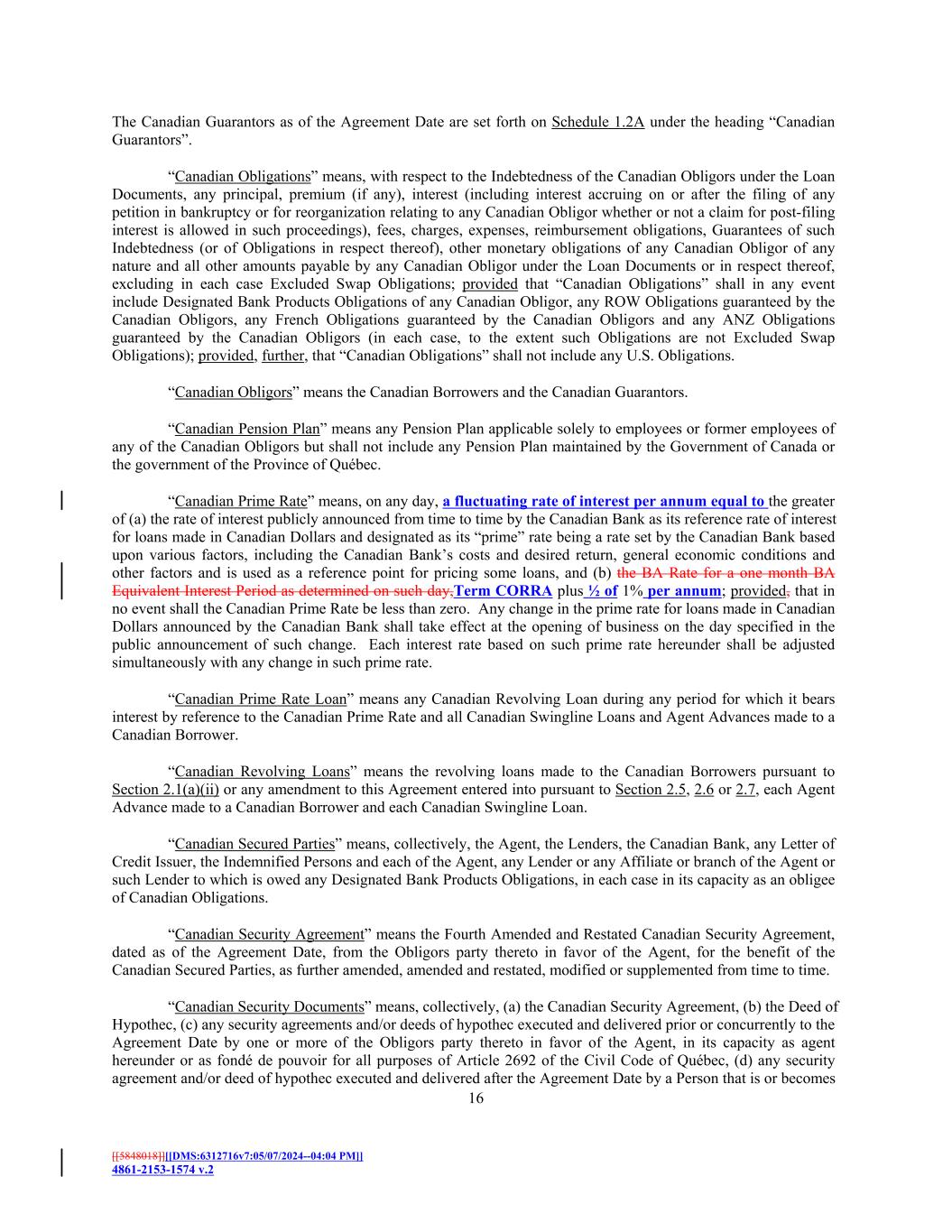 The Canadian Guarantors as of the Agreement Date are set forth on Schedule 1.2A under the heading “Canadian Guarantors”. “Canadian Obligations” means, with respect to the Indebtedness of the Canadian Obligors under the Loan Documents, any principal, premium (if any), interest (including interest accruing on or after the filing of any petition in bankruptcy or for reorganization relating to any Canadian Obligor whether or not a claim for post-filing interest is allowed in such proceedings), fees, charges, expenses, reimbursement obligations, Guarantees of such Indebtedness (or of Obligations in respect thereof), other monetary obligations of any Canadian Obligor of any nature and all other amounts payable by any Canadian Obligor under the Loan Documents or in respect thereof, excluding in each case Excluded Swap Obligations; provided that “Canadian Obligations” shall in any event include Designated Bank Products Obligations of any Canadian Obligor, any ROW Obligations guaranteed by the Canadian Obligors, any French Obligations guaranteed by the Canadian Obligors and any ANZ Obligations guaranteed by the Canadian Obligors (in each case, to the extent such Obligations are not Excluded Swap Obligations); provided, further, that “Canadian Obligations” shall not include any U.S. Obligations. “Canadian Obligors” means the Canadian Borrowers and the Canadian Guarantors. “Canadian Pension Plan” means any Pension Plan applicable solely to employees or former employees of any of the Canadian Obligors but shall not include any Pension Plan maintained by the Government of Canada or the government of the Province of Québec. “Canadian Prime Rate” means, on any day, a fluctuating rate of interest per annum equal to the greater of (a) the rate of interest publicly announced from time to time by the Canadian Bank as its reference rate of interest for loans made in Canadian Dollars and designated as its “prime” rate being a rate set by the Canadian Bank based upon various factors, including the Canadian Bank’s costs and desired return, general economic conditions and other factors and is used as a reference point for pricing some loans, and (b) the BA Rate for a one month BA Equivalent Interest Period as determined on such day,Term CORRA plus ½ of 1% per annum; provided, that in no event shall the Canadian Prime Rate be less than zero. Any change in the prime rate for loans made in Canadian Dollars announced by the Canadian Bank shall take effect at the opening of business on the day specified in the public announcement of such change. Each interest rate based on such prime rate hereunder shall be adjusted simultaneously with any change in such prime rate. “Canadian Prime Rate Loan” means any Canadian Revolving Loan during any period for which it bears interest by reference to the Canadian Prime Rate and all Canadian Swingline Loans and Agent Advances made to a Canadian Borrower. “Canadian Revolving Loans” means the revolving loans made to the Canadian Borrowers pursuant to Section 2.1(a)(ii) or any amendment to this Agreement entered into pursuant to Section 2.5, 2.6 or 2.7, each Agent Advance made to a Canadian Borrower and each Canadian Swingline Loan. “Canadian Secured Parties” means, collectively, the Agent, the Lenders, the Canadian Bank, any Letter of Credit Issuer, the Indemnified Persons and each of the Agent, any Lender or any Affiliate or branch of the Agent or such Lender to which is owed any Designated Bank Products Obligations, in each case in its capacity as an obligee of Canadian Obligations. “Canadian Security Agreement” means the Fourth Amended and Restated Canadian Security Agreement, dated as of the Agreement Date, from the Obligors party thereto in favor of the Agent, for the benefit of the Canadian Secured Parties, as further amended, amended and restated, modified or supplemented from time to time. “Canadian Security Documents” means, collectively, (a) the Canadian Security Agreement, (b) the Deed of Hypothec, (c) any security agreements and/or deeds of hypothec executed and delivered prior or concurrently to the Agreement Date by one or more of the Obligors party thereto in favor of the Agent, in its capacity as agent hereunder or as fondé de pouvoir for all purposes of Article 2692 of the Civil Code of Québec, (d) any security agreement and/or deed of hypothec executed and delivered after the Agreement Date by a Person that is or becomes 16 [[5848018]][[DMS:6312716v7:05/07/2024--04:04 PM]] 4861-2153-1574 v.2