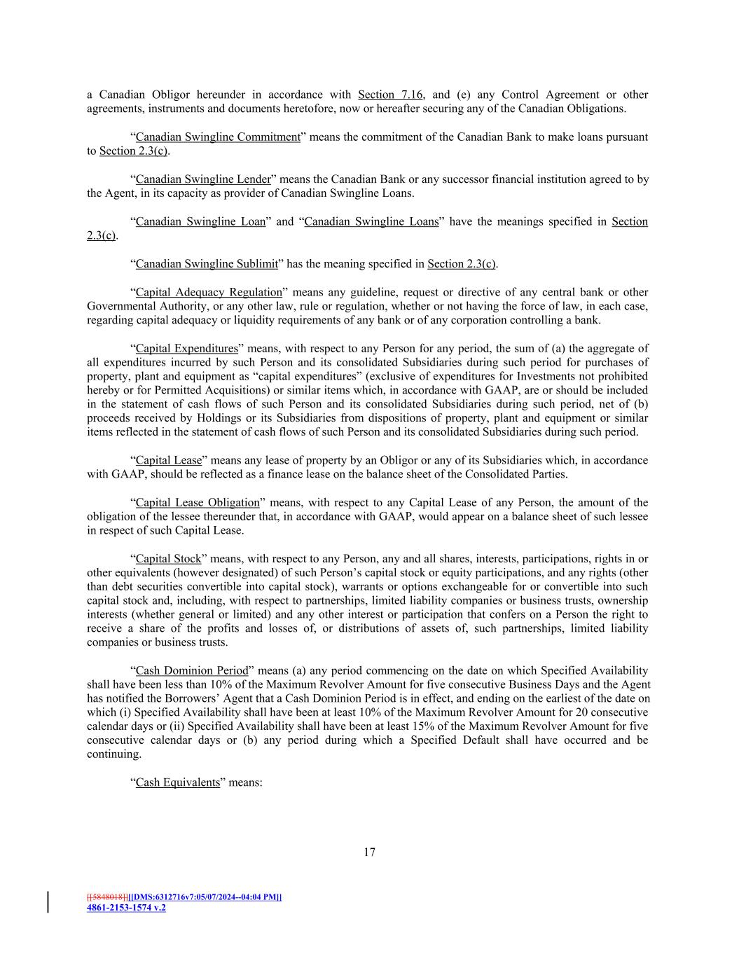 a Canadian Obligor hereunder in accordance with Section 7.16, and (e) any Control Agreement or other agreements, instruments and documents heretofore, now or hereafter securing any of the Canadian Obligations. “Canadian Swingline Commitment” means the commitment of the Canadian Bank to make loans pursuant to Section 2.3(c). “Canadian Swingline Lender” means the Canadian Bank or any successor financial institution agreed to by the Agent, in its capacity as provider of Canadian Swingline Loans. “Canadian Swingline Loan” and “Canadian Swingline Loans” have the meanings specified in Section 2.3(c). “Canadian Swingline Sublimit” has the meaning specified in Section 2.3(c). “Capital Adequacy Regulation” means any guideline, request or directive of any central bank or other Governmental Authority, or any other law, rule or regulation, whether or not having the force of law, in each case, regarding capital adequacy or liquidity requirements of any bank or of any corporation controlling a bank. “Capital Expenditures” means, with respect to any Person for any period, the sum of (a) the aggregate of all expenditures incurred by such Person and its consolidated Subsidiaries during such period for purchases of property, plant and equipment as “capital expenditures” (exclusive of expenditures for Investments not prohibited hereby or for Permitted Acquisitions) or similar items which, in accordance with GAAP, are or should be included in the statement of cash flows of such Person and its consolidated Subsidiaries during such period, net of (b) proceeds received by Holdings or its Subsidiaries from dispositions of property, plant and equipment or similar items reflected in the statement of cash flows of such Person and its consolidated Subsidiaries during such period. “Capital Lease” means any lease of property by an Obligor or any of its Subsidiaries which, in accordance with GAAP, should be reflected as a finance lease on the balance sheet of the Consolidated Parties. “Capital Lease Obligation” means, with respect to any Capital Lease of any Person, the amount of the obligation of the lessee thereunder that, in accordance with GAAP, would appear on a balance sheet of such lessee in respect of such Capital Lease. “Capital Stock” means, with respect to any Person, any and all shares, interests, participations, rights in or other equivalents (however designated) of such Person’s capital stock or equity participations, and any rights (other than debt securities convertible into capital stock), warrants or options exchangeable for or convertible into such capital stock and, including, with respect to partnerships, limited liability companies or business trusts, ownership interests (whether general or limited) and any other interest or participation that confers on a Person the right to receive a share of the profits and losses of, or distributions of assets of, such partnerships, limited liability companies or business trusts. “Cash Dominion Period” means (a) any period commencing on the date on which Specified Availability shall have been less than 10% of the Maximum Revolver Amount for five consecutive Business Days and the Agent has notified the Borrowers’ Agent that a Cash Dominion Period is in effect, and ending on the earliest of the date on which (i) Specified Availability shall have been at least 10% of the Maximum Revolver Amount for 20 consecutive calendar days or (ii) Specified Availability shall have been at least 15% of the Maximum Revolver Amount for five consecutive calendar days or (b) any period during which a Specified Default shall have occurred and be continuing. “Cash Equivalents” means: 17 [[5848018]][[DMS:6312716v7:05/07/2024--04:04 PM]] 4861-2153-1574 v.2