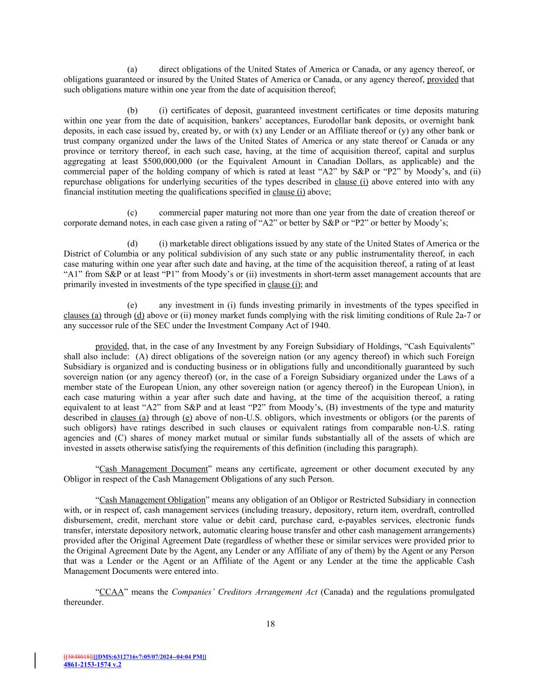 (a) direct obligations of the United States of America or Canada, or any agency thereof, or obligations guaranteed or insured by the United States of America or Canada, or any agency thereof, provided that such obligations mature within one year from the date of acquisition thereof; (b) (i) certificates of deposit, guaranteed investment certificates or time deposits maturing within one year from the date of acquisition, bankers’ acceptances, Eurodollar bank deposits, or overnight bank deposits, in each case issued by, created by, or with (x) any Lender or an Affiliate thereof or (y) any other bank or trust company organized under the laws of the United States of America or any state thereof or Canada or any province or territory thereof, in each such case, having, at the time of acquisition thereof, capital and surplus aggregating at least $500,000,000 (or the Equivalent Amount in Canadian Dollars, as applicable) and the commercial paper of the holding company of which is rated at least “A2” by S&P or “P2” by Moody’s, and (ii) repurchase obligations for underlying securities of the types described in clause (i) above entered into with any financial institution meeting the qualifications specified in clause (i) above; (c) commercial paper maturing not more than one year from the date of creation thereof or corporate demand notes, in each case given a rating of “A2” or better by S&P or “P2” or better by Moody’s; (d) (i) marketable direct obligations issued by any state of the United States of America or the District of Columbia or any political subdivision of any such state or any public instrumentality thereof, in each case maturing within one year after such date and having, at the time of the acquisition thereof, a rating of at least “A1” from S&P or at least “P1” from Moody’s or (ii) investments in short-term asset management accounts that are primarily invested in investments of the type specified in clause (i); and (e) any investment in (i) funds investing primarily in investments of the types specified in clauses (a) through (d) above or (ii) money market funds complying with the risk limiting conditions of Rule 2a-7 or any successor rule of the SEC under the Investment Company Act of 1940. provided, that, in the case of any Investment by any Foreign Subsidiary of Holdings, “Cash Equivalents” shall also include: (A) direct obligations of the sovereign nation (or any agency thereof) in which such Foreign Subsidiary is organized and is conducting business or in obligations fully and unconditionally guaranteed by such sovereign nation (or any agency thereof) (or, in the case of a Foreign Subsidiary organized under the Laws of a member state of the European Union, any other sovereign nation (or agency thereof) in the European Union), in each case maturing within a year after such date and having, at the time of the acquisition thereof, a rating equivalent to at least “A2” from S&P and at least “P2” from Moody’s, (B) investments of the type and maturity described in clauses (a) through (e) above of non-U.S. obligors, which investments or obligors (or the parents of such obligors) have ratings described in such clauses or equivalent ratings from comparable non-U.S. rating agencies and (C) shares of money market mutual or similar funds substantially all of the assets of which are invested in assets otherwise satisfying the requirements of this definition (including this paragraph). “Cash Management Document” means any certificate, agreement or other document executed by any Obligor in respect of the Cash Management Obligations of any such Person. “Cash Management Obligation” means any obligation of an Obligor or Restricted Subsidiary in connection with, or in respect of, cash management services (including treasury, depository, return item, overdraft, controlled disbursement, credit, merchant store value or debit card, purchase card, e-payables services, electronic funds transfer, interstate depository network, automatic clearing house transfer and other cash management arrangements) provided after the Original Agreement Date (regardless of whether these or similar services were provided prior to the Original Agreement Date by the Agent, any Lender or any Affiliate of any of them) by the Agent or any Person that was a Lender or the Agent or an Affiliate of the Agent or any Lender at the time the applicable Cash Management Documents were entered into. “CCAA” means the Companies’ Creditors Arrangement Act (Canada) and the regulations promulgated thereunder. 18 [[5848018]][[DMS:6312716v7:05/07/2024--04:04 PM]] 4861-2153-1574 v.2