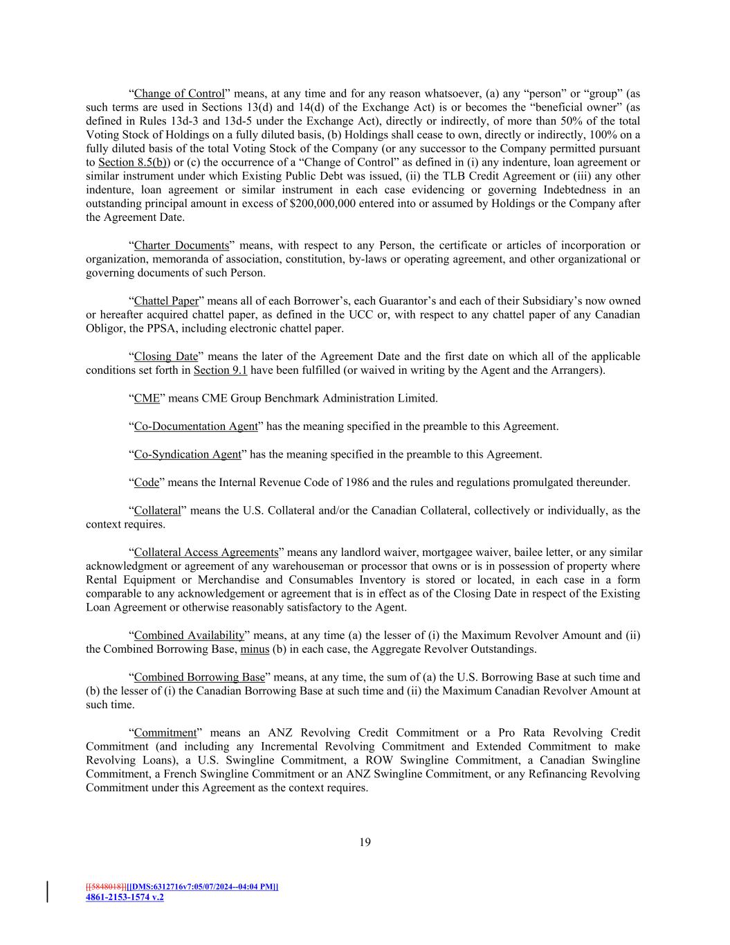 “Change of Control” means, at any time and for any reason whatsoever, (a) any “person” or “group” (as such terms are used in Sections 13(d) and 14(d) of the Exchange Act) is or becomes the “beneficial owner” (as defined in Rules 13d-3 and 13d-5 under the Exchange Act), directly or indirectly, of more than 50% of the total Voting Stock of Holdings on a fully diluted basis, (b) Holdings shall cease to own, directly or indirectly, 100% on a fully diluted basis of the total Voting Stock of the Company (or any successor to the Company permitted pursuant to Section 8.5(b)) or (c) the occurrence of a “Change of Control” as defined in (i) any indenture, loan agreement or similar instrument under which Existing Public Debt was issued, (ii) the TLB Credit Agreement or (iii) any other indenture, loan agreement or similar instrument in each case evidencing or governing Indebtedness in an outstanding principal amount in excess of $200,000,000 entered into or assumed by Holdings or the Company after the Agreement Date. “Charter Documents” means, with respect to any Person, the certificate or articles of incorporation or organization, memoranda of association, constitution, by-laws or operating agreement, and other organizational or governing documents of such Person. “Chattel Paper” means all of each Borrower’s, each Guarantor’s and each of their Subsidiary’s now owned or hereafter acquired chattel paper, as defined in the UCC or, with respect to any chattel paper of any Canadian Obligor, the PPSA, including electronic chattel paper. “Closing Date” means the later of the Agreement Date and the first date on which all of the applicable conditions set forth in Section 9.1 have been fulfilled (or waived in writing by the Agent and the Arrangers). “CME” means CME Group Benchmark Administration Limited. “Co-Documentation Agent” has the meaning specified in the preamble to this Agreement. “Co-Syndication Agent” has the meaning specified in the preamble to this Agreement. “Code” means the Internal Revenue Code of 1986 and the rules and regulations promulgated thereunder. “Collateral” means the U.S. Collateral and/or the Canadian Collateral, collectively or individually, as the context requires. “Collateral Access Agreements” means any landlord waiver, mortgagee waiver, bailee letter, or any similar acknowledgment or agreement of any warehouseman or processor that owns or is in possession of property where Rental Equipment or Merchandise and Consumables Inventory is stored or located, in each case in a form comparable to any acknowledgement or agreement that is in effect as of the Closing Date in respect of the Existing Loan Agreement or otherwise reasonably satisfactory to the Agent. “Combined Availability” means, at any time (a) the lesser of (i) the Maximum Revolver Amount and (ii) the Combined Borrowing Base, minus (b) in each case, the Aggregate Revolver Outstandings. “Combined Borrowing Base” means, at any time, the sum of (a) the U.S. Borrowing Base at such time and (b) the lesser of (i) the Canadian Borrowing Base at such time and (ii) the Maximum Canadian Revolver Amount at such time. “Commitment” means an ANZ Revolving Credit Commitment or a Pro Rata Revolving Credit Commitment (and including any Incremental Revolving Commitment and Extended Commitment to make Revolving Loans), a U.S. Swingline Commitment, a ROW Swingline Commitment, a Canadian Swingline Commitment, a French Swingline Commitment or an ANZ Swingline Commitment, or any Refinancing Revolving Commitment under this Agreement as the context requires. 19 [[5848018]][[DMS:6312716v7:05/07/2024--04:04 PM]] 4861-2153-1574 v.2