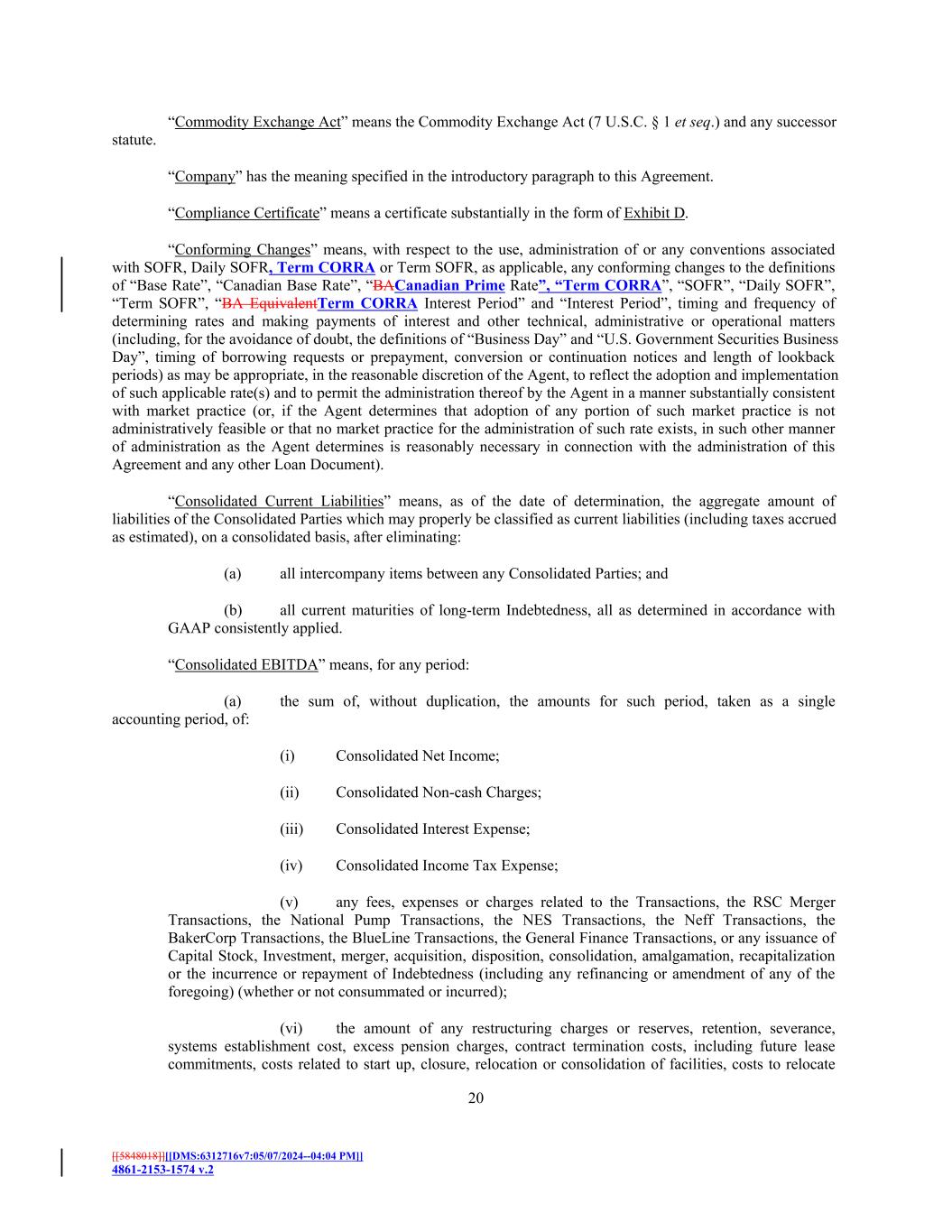 “Commodity Exchange Act” means the Commodity Exchange Act (7 U.S.C. § 1 et seq.) and any successor statute. “Company” has the meaning specified in the introductory paragraph to this Agreement. “Compliance Certificate” means a certificate substantially in the form of Exhibit D. “Conforming Changes” means, with respect to the use, administration of or any conventions associated with SOFR, Daily SOFR, Term CORRA or Term SOFR, as applicable, any conforming changes to the definitions of “Base Rate”, “Canadian Base Rate”, “BACanadian Prime Rate”, “Term CORRA”, “SOFR”, “Daily SOFR”, “Term SOFR”, “BA EquivalentTerm CORRA Interest Period” and “Interest Period”, timing and frequency of determining rates and making payments of interest and other technical, administrative or operational matters (including, for the avoidance of doubt, the definitions of “Business Day” and “U.S. Government Securities Business Day”, timing of borrowing requests or prepayment, conversion or continuation notices and length of lookback periods) as may be appropriate, in the reasonable discretion of the Agent, to reflect the adoption and implementation of such applicable rate(s) and to permit the administration thereof by the Agent in a manner substantially consistent with market practice (or, if the Agent determines that adoption of any portion of such market practice is not administratively feasible or that no market practice for the administration of such rate exists, in such other manner of administration as the Agent determines is reasonably necessary in connection with the administration of this Agreement and any other Loan Document). “Consolidated Current Liabilities” means, as of the date of determination, the aggregate amount of liabilities of the Consolidated Parties which may properly be classified as current liabilities (including taxes accrued as estimated), on a consolidated basis, after eliminating: (a) all intercompany items between any Consolidated Parties; and (b) all current maturities of long-term Indebtedness, all as determined in accordance with GAAP consistently applied. “Consolidated EBITDA” means, for any period: (a) the sum of, without duplication, the amounts for such period, taken as a single accounting period, of: (i) Consolidated Net Income; (ii) Consolidated Non-cash Charges; (iii) Consolidated Interest Expense; (iv) Consolidated Income Tax Expense; (v) any fees, expenses or charges related to the Transactions, the RSC Merger Transactions, the National Pump Transactions, the NES Transactions, the Neff Transactions, the BakerCorp Transactions, the BlueLine Transactions, the General Finance Transactions, or any issuance of Capital Stock, Investment, merger, acquisition, disposition, consolidation, amalgamation, recapitalization or the incurrence or repayment of Indebtedness (including any refinancing or amendment of any of the foregoing) (whether or not consummated or incurred); (vi) the amount of any restructuring charges or reserves, retention, severance, systems establishment cost, excess pension charges, contract termination costs, including future lease commitments, costs related to start up, closure, relocation or consolidation of facilities, costs to relocate 20 [[5848018]][[DMS:6312716v7:05/07/2024--04:04 PM]] 4861-2153-1574 v.2