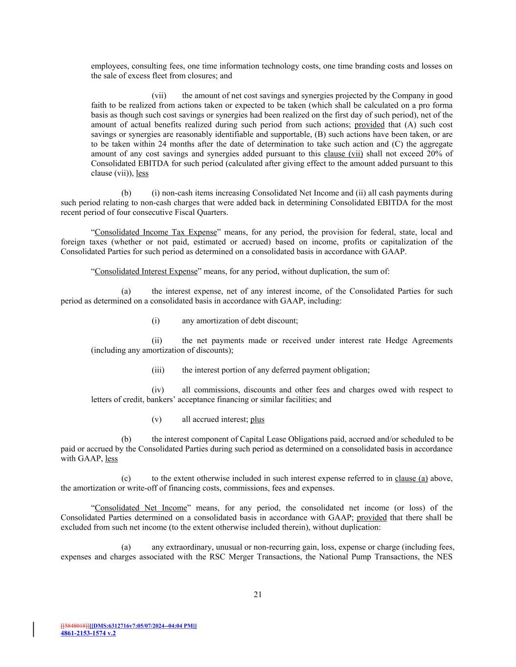 employees, consulting fees, one time information technology costs, one time branding costs and losses on the sale of excess fleet from closures; and (vii) the amount of net cost savings and synergies projected by the Company in good faith to be realized from actions taken or expected to be taken (which shall be calculated on a pro forma basis as though such cost savings or synergies had been realized on the first day of such period), net of the amount of actual benefits realized during such period from such actions; provided that (A) such cost savings or synergies are reasonably identifiable and supportable, (B) such actions have been taken, or are to be taken within 24 months after the date of determination to take such action and (C) the aggregate amount of any cost savings and synergies added pursuant to this clause (vii) shall not exceed 20% of Consolidated EBITDA for such period (calculated after giving effect to the amount added pursuant to this clause (vii)), less (b) (i) non-cash items increasing Consolidated Net Income and (ii) all cash payments during such period relating to non-cash charges that were added back in determining Consolidated EBITDA for the most recent period of four consecutive Fiscal Quarters. “Consolidated Income Tax Expense” means, for any period, the provision for federal, state, local and foreign taxes (whether or not paid, estimated or accrued) based on income, profits or capitalization of the Consolidated Parties for such period as determined on a consolidated basis in accordance with GAAP. “Consolidated Interest Expense” means, for any period, without duplication, the sum of: (a) the interest expense, net of any interest income, of the Consolidated Parties for such period as determined on a consolidated basis in accordance with GAAP, including: (i) any amortization of debt discount; (ii) the net payments made or received under interest rate Hedge Agreements (including any amortization of discounts); (iii) the interest portion of any deferred payment obligation; (iv) all commissions, discounts and other fees and charges owed with respect to letters of credit, bankers’ acceptance financing or similar facilities; and (v) all accrued interest; plus (b) the interest component of Capital Lease Obligations paid, accrued and/or scheduled to be paid or accrued by the Consolidated Parties during such period as determined on a consolidated basis in accordance with GAAP, less (c) to the extent otherwise included in such interest expense referred to in clause (a) above, the amortization or write-off of financing costs, commissions, fees and expenses. “Consolidated Net Income” means, for any period, the consolidated net income (or loss) of the Consolidated Parties determined on a consolidated basis in accordance with GAAP; provided that there shall be excluded from such net income (to the extent otherwise included therein), without duplication: (a) any extraordinary, unusual or non-recurring gain, loss, expense or charge (including fees, expenses and charges associated with the RSC Merger Transactions, the National Pump Transactions, the NES 21 [[5848018]][[DMS:6312716v7:05/07/2024--04:04 PM]] 4861-2153-1574 v.2