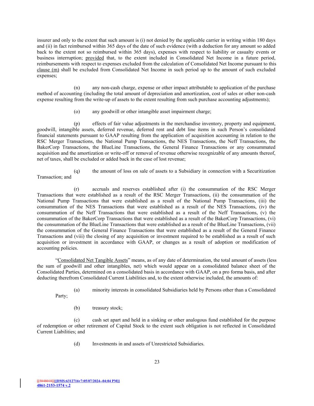 insurer and only to the extent that such amount is (i) not denied by the applicable carrier in writing within 180 days and (ii) in fact reimbursed within 365 days of the date of such evidence (with a deduction for any amount so added back to the extent not so reimbursed within 365 days), expenses with respect to liability or casualty events or business interruption; provided that, to the extent included in Consolidated Net Income in a future period, reimbursements with respect to expenses excluded from the calculation of Consolidated Net Income pursuant to this clause (m) shall be excluded from Consolidated Net Income in such period up to the amount of such excluded expenses; (n) any non-cash charge, expense or other impact attributable to application of the purchase method of accounting (including the total amount of depreciation and amortization, cost of sales or other non-cash expense resulting from the write-up of assets to the extent resulting from such purchase accounting adjustments); (o) any goodwill or other intangible asset impairment charge; (p) effects of fair value adjustments in the merchandise inventory, property and equipment, goodwill, intangible assets, deferred revenue, deferred rent and debt line items in such Person’s consolidated financial statements pursuant to GAAP resulting from the application of acquisition accounting in relation to the RSC Merger Transactions, the National Pump Transactions, the NES Transactions, the Neff Transactions, the BakerCorp Transactions, the BlueLine Transactions, the General Finance Transactions or any consummated acquisition and the amortization or write-off or removal of revenue otherwise recognizable of any amounts thereof, net of taxes, shall be excluded or added back in the case of lost revenue; (q) the amount of loss on sale of assets to a Subsidiary in connection with a Securitization Transaction; and (r) accruals and reserves established after (i) the consummation of the RSC Merger Transactions that were established as a result of the RSC Merger Transactions, (ii) the consummation of the National Pump Transactions that were established as a result of the National Pump Transactions, (iii) the consummation of the NES Transactions that were established as a result of the NES Transactions, (iv) the consummation of the Neff Transactions that were established as a result of the Neff Transactions, (v) the consummation of the BakerCorp Transactions that were established as a result of the BakerCorp Transactions, (vi) the consummation of the BlueLine Transactions that were established as a result of the BlueLine Transactions, (vii) the consummation of the General Finance Transactions that were established as a result of the General Finance Transactions and (viii) the closing of any acquisition or investment required to be established as a result of such acquisition or investment in accordance with GAAP, or changes as a result of adoption or modification of accounting policies. “Consolidated Net Tangible Assets” means, as of any date of determination, the total amount of assets (less the sum of goodwill and other intangibles, net) which would appear on a consolidated balance sheet of the Consolidated Parties, determined on a consolidated basis in accordance with GAAP, on a pro forma basis, and after deducting therefrom Consolidated Current Liabilities and, to the extent otherwise included, the amounts of: (a) minority interests in consolidated Subsidiaries held by Persons other than a Consolidated Party; (b) treasury stock; (c) cash set apart and held in a sinking or other analogous fund established for the purpose of redemption or other retirement of Capital Stock to the extent such obligation is not reflected in Consolidated Current Liabilities; and (d) Investments in and assets of Unrestricted Subsidiaries. 23 [[5848018]][[DMS:6312716v7:05/07/2024--04:04 PM]] 4861-2153-1574 v.2