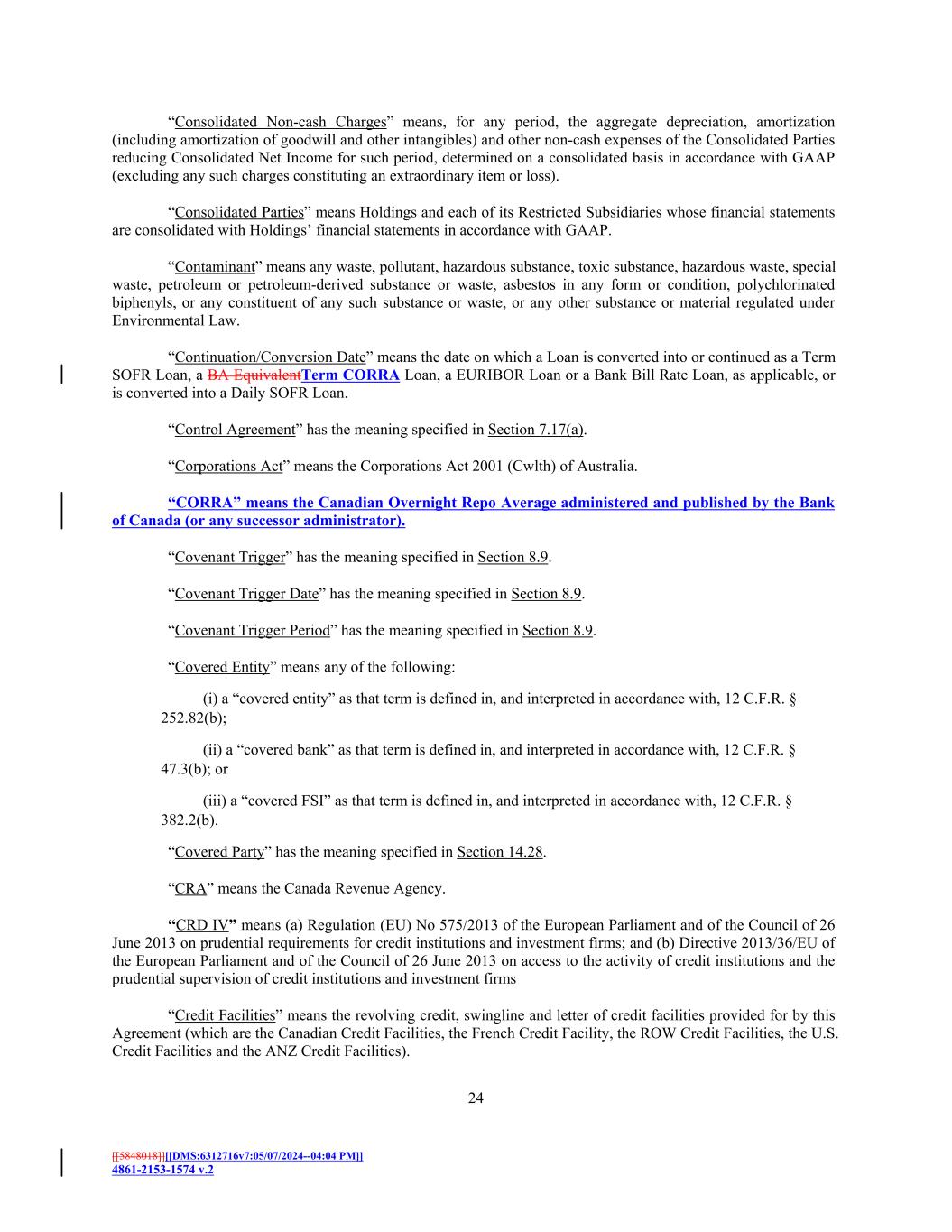 “Consolidated Non-cash Charges” means, for any period, the aggregate depreciation, amortization (including amortization of goodwill and other intangibles) and other non-cash expenses of the Consolidated Parties reducing Consolidated Net Income for such period, determined on a consolidated basis in accordance with GAAP (excluding any such charges constituting an extraordinary item or loss). “Consolidated Parties” means Holdings and each of its Restricted Subsidiaries whose financial statements are consolidated with Holdings’ financial statements in accordance with GAAP. “Contaminant” means any waste, pollutant, hazardous substance, toxic substance, hazardous waste, special waste, petroleum or petroleum-derived substance or waste, asbestos in any form or condition, polychlorinated biphenyls, or any constituent of any such substance or waste, or any other substance or material regulated under Environmental Law. “Continuation/Conversion Date” means the date on which a Loan is converted into or continued as a Term SOFR Loan, a BA EquivalentTerm CORRA Loan, a EURIBOR Loan or a Bank Bill Rate Loan, as applicable, or is converted into a Daily SOFR Loan. “Control Agreement” has the meaning specified in Section 7.17(a). “Corporations Act” means the Corporations Act 2001 (Cwlth) of Australia. “CORRA” means the Canadian Overnight Repo Average administered and published by the Bank of Canada (or any successor administrator). “Covenant Trigger” has the meaning specified in Section 8.9. “Covenant Trigger Date” has the meaning specified in Section 8.9. “Covenant Trigger Period” has the meaning specified in Section 8.9. “Covered Entity” means any of the following: (i) a “covered entity” as that term is defined in, and interpreted in accordance with, 12 C.F.R. § 252.82(b); (ii) a “covered bank” as that term is defined in, and interpreted in accordance with, 12 C.F.R. § 47.3(b); or (iii) a “covered FSI” as that term is defined in, and interpreted in accordance with, 12 C.F.R. § 382.2(b). “Covered Party” has the meaning specified in Section 14.28. “CRA” means the Canada Revenue Agency. “CRD IV” means (a) Regulation (EU) No 575/2013 of the European Parliament and of the Council of 26 June 2013 on prudential requirements for credit institutions and investment firms; and (b) Directive 2013/36/EU of the European Parliament and of the Council of 26 June 2013 on access to the activity of credit institutions and the prudential supervision of credit institutions and investment firms “Credit Facilities” means the revolving credit, swingline and letter of credit facilities provided for by this Agreement (which are the Canadian Credit Facilities, the French Credit Facility, the ROW Credit Facilities, the U.S. Credit Facilities and the ANZ Credit Facilities). 24 [[5848018]][[DMS:6312716v7:05/07/2024--04:04 PM]] 4861-2153-1574 v.2