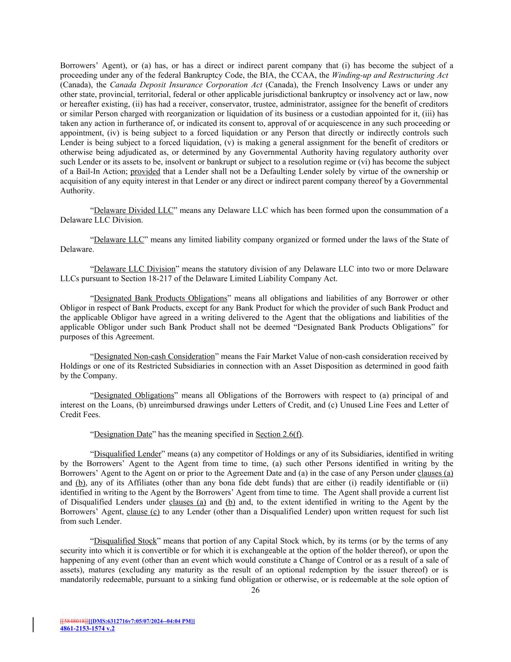 Borrowers’ Agent), or (a) has, or has a direct or indirect parent company that (i) has become the subject of a proceeding under any of the federal Bankruptcy Code, the BIA, the CCAA, the Winding-up and Restructuring Act (Canada), the Canada Deposit Insurance Corporation Act (Canada), the French Insolvency Laws or under any other state, provincial, territorial, federal or other applicable jurisdictional bankruptcy or insolvency act or law, now or hereafter existing, (ii) has had a receiver, conservator, trustee, administrator, assignee for the benefit of creditors or similar Person charged with reorganization or liquidation of its business or a custodian appointed for it, (iii) has taken any action in furtherance of, or indicated its consent to, approval of or acquiescence in any such proceeding or appointment, (iv) is being subject to a forced liquidation or any Person that directly or indirectly controls such Lender is being subject to a forced liquidation, (v) is making a general assignment for the benefit of creditors or otherwise being adjudicated as, or determined by any Governmental Authority having regulatory authority over such Lender or its assets to be, insolvent or bankrupt or subject to a resolution regime or (vi) has become the subject of a Bail-In Action; provided that a Lender shall not be a Defaulting Lender solely by virtue of the ownership or acquisition of any equity interest in that Lender or any direct or indirect parent company thereof by a Governmental Authority. “Delaware Divided LLC” means any Delaware LLC which has been formed upon the consummation of a Delaware LLC Division. “Delaware LLC” means any limited liability company organized or formed under the laws of the State of Delaware. “Delaware LLC Division” means the statutory division of any Delaware LLC into two or more Delaware LLCs pursuant to Section 18-217 of the Delaware Limited Liability Company Act. “Designated Bank Products Obligations” means all obligations and liabilities of any Borrower or other Obligor in respect of Bank Products, except for any Bank Product for which the provider of such Bank Product and the applicable Obligor have agreed in a writing delivered to the Agent that the obligations and liabilities of the applicable Obligor under such Bank Product shall not be deemed “Designated Bank Products Obligations” for purposes of this Agreement. “Designated Non-cash Consideration” means the Fair Market Value of non-cash consideration received by Holdings or one of its Restricted Subsidiaries in connection with an Asset Disposition as determined in good faith by the Company. “Designated Obligations” means all Obligations of the Borrowers with respect to (a) principal of and interest on the Loans, (b) unreimbursed drawings under Letters of Credit, and (c) Unused Line Fees and Letter of Credit Fees. “Designation Date” has the meaning specified in Section 2.6(f). “Disqualified Lender” means (a) any competitor of Holdings or any of its Subsidiaries, identified in writing by the Borrowers’ Agent to the Agent from time to time, (a) such other Persons identified in writing by the Borrowers’ Agent to the Agent on or prior to the Agreement Date and (a) in the case of any Person under clauses (a) and (b), any of its Affiliates (other than any bona fide debt funds) that are either (i) readily identifiable or (ii) identified in writing to the Agent by the Borrowers’ Agent from time to time. The Agent shall provide a current list of Disqualified Lenders under clauses (a) and (b) and, to the extent identified in writing to the Agent by the Borrowers’ Agent, clause (c) to any Lender (other than a Disqualified Lender) upon written request for such list from such Lender. “Disqualified Stock” means that portion of any Capital Stock which, by its terms (or by the terms of any security into which it is convertible or for which it is exchangeable at the option of the holder thereof), or upon the happening of any event (other than an event which would constitute a Change of Control or as a result of a sale of assets), matures (excluding any maturity as the result of an optional redemption by the issuer thereof) or is mandatorily redeemable, pursuant to a sinking fund obligation or otherwise, or is redeemable at the sole option of 26 [[5848018]][[DMS:6312716v7:05/07/2024--04:04 PM]] 4861-2153-1574 v.2