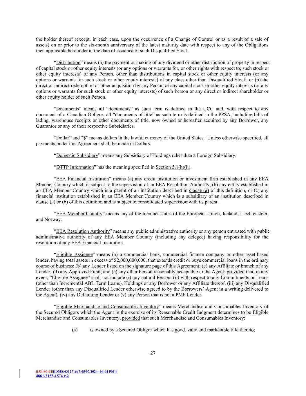 the holder thereof (except, in each case, upon the occurrence of a Change of Control or as a result of a sale of assets) on or prior to the six-month anniversary of the latest maturity date with respect to any of the Obligations then applicable hereunder at the date of issuance of such Disqualified Stock. “Distribution” means (a) the payment or making of any dividend or other distribution of property in respect of capital stock or other equity interests (or any options or warrants for, or other rights with respect to, such stock or other equity interests) of any Person, other than distributions in capital stock or other equity interests (or any options or warrants for such stock or other equity interests) of any class other than Disqualified Stock, or (b) the direct or indirect redemption or other acquisition by any Person of any capital stock or other equity interests (or any options or warrants for such stock or other equity interests) of such Person or any direct or indirect shareholder or other equity holder of such Person. “Documents” means all “documents” as such term is defined in the UCC and, with respect to any document of a Canadian Obligor, all “documents of title” as such term is defined in the PPSA, including bills of lading, warehouse receipts or other documents of title, now owned or hereafter acquired by any Borrower, any Guarantor or any of their respective Subsidiaries. “Dollar” and “$” means dollars in the lawful currency of the United States. Unless otherwise specified, all payments under this Agreement shall be made in Dollars. “Domestic Subsidiary” means any Subsidiary of Holdings other than a Foreign Subsidiary. “DTTP Information” has the meaning specified in Section 5.1(h)(ii). “EEA Financial Institution” means (a) any credit institution or investment firm established in any EEA Member Country which is subject to the supervision of an EEA Resolution Authority, (b) any entity established in an EEA Member Country which is a parent of an institution described in clause (a) of this definition, or (c) any financial institution established in an EEA Member Country which is a subsidiary of an institution described in clause (a) or (b) of this definition and is subject to consolidated supervision with its parent. “EEA Member Country” means any of the member states of the European Union, Iceland, Liechtenstein, and Norway. “EEA Resolution Authority” means any public administrative authority or any person entrusted with public administrative authority of any EEA Member Country (including any delegee) having responsibility for the resolution of any EEA Financial Institution. “Eligible Assignee” means (a) a commercial bank, commercial finance company or other asset-based lender, having total assets in excess of $2,000,000,000, that extends credit or buys commercial loans in the ordinary course of business; (b) any Lender listed on the signature page of this Agreement; (c) any Affiliate or branch of any Lender; (d) any Approved Fund; and (e) any other Person reasonably acceptable to the Agent; provided that, in any event, “Eligible Assignee” shall not include (i) any natural Person, (ii) with respect to any Commitments or Loans (other than Incremental ABL Term Loans), Holdings or any Borrower or any Affiliate thereof, (iii) any Disqualified Lender (other than any Disqualified Lender otherwise agreed to by the Borrowers’ Agent in a writing delivered to the Agent), (iv) any Defaulting Lender or (v) any Person that is not a PMP Lender. “Eligible Merchandise and Consumables Inventory” means Merchandise and Consumables Inventory of the Secured Obligors which the Agent in the exercise of its Reasonable Credit Judgment determines to be Eligible Merchandise and Consumables Inventory; provided that such Merchandise and Consumables Inventory: (a) is owned by a Secured Obligor which has good, valid and marketable title thereto; 27 [[5848018]][[DMS:6312716v7:05/07/2024--04:04 PM]] 4861-2153-1574 v.2