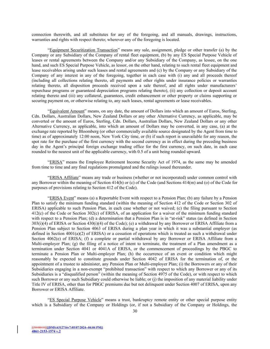 connection therewith, and all substitutes for any of the foregoing, and all manuals, drawings, instructions, warranties and rights with respect thereto; wherever any of the foregoing is located. “Equipment Securitization Transaction” means any sale, assignment, pledge or other transfer (a) by the Company or any Subsidiary of the Company of rental fleet equipment, (b) by any ES Special Purpose Vehicle of leases or rental agreements between the Company and/or any Subsidiary of the Company, as lessee, on the one hand, and such ES Special Purpose Vehicle, as lessor, on the other hand, relating to such rental fleet equipment and lease receivables arising under such leases and rental agreements and (c) by the Company or any Subsidiary of the Company of any interest in any of the foregoing, together in each case with (i) any and all proceeds thereof (including all collections relating thereto, all payments and other rights under insurance policies or warranties relating thereto, all disposition proceeds received upon a sale thereof, and all rights under manufacturers’ repurchase programs or guaranteed depreciation programs relating thereto), (ii) any collection or deposit account relating thereto and (iii) any collateral, guarantees, credit enhancement or other property or claims supporting or securing payment on, or otherwise relating to, any such leases, rental agreements or lease receivables. “Equivalent Amount” means, on any date, the amount of Dollars into which an amount of Euros, Sterling, Cdn. Dollars, Australian Dollars, New Zealand Dollars or any other Alternative Currency, as applicable, may be converted or the amount of Euros, Sterling, Cdn. Dollars, Australian Dollars, New Zealand Dollars or any other Alternative Currency, as applicable, into which an amount of Dollars may be converted, in any case, (a) at the exchange rate reported by Bloomberg (or other commercially available source designated by the Agent from time to time) as of approximately 12:00 noon, New York City time, or (b) if such report is unavailable for any reason, the spot rate for the purchase of the first currency with the second currency as in effect during the preceding business day in the Agent’s principal foreign exchange trading office for the first currency, on such date, in each case rounded to the nearest unit of the applicable currency, with 0.5 of a unit being rounded upward. “ERISA” means the Employee Retirement Income Security Act of 1974, as the same may be amended from time to time and any final regulations promulgated and the rulings issued thereunder. “ERISA Affiliate” means any trade or business (whether or not incorporated) under common control with any Borrower within the meaning of Section 414(b) or (c) of the Code (and Sections 414(m) and (o) of the Code for purposes of provisions relating to Section 412 of the Code). “ERISA Event” means (a) a Reportable Event with respect to a Pension Plan; (b) any failure by a Pension Plan to satisfy the minimum funding standard (within the meaning of Section 412 of the Code or Section 302 of ERISA) applicable to such Pension Plan, in each case whether or not waived; (c) the filing pursuant to Section 412(c) of the Code or Section 302(c) of ERISA, of an application for a waiver of the minimum funding standard with respect to a Pension Plan; (d) a determination that a Pension Plan is in “at-risk” status (as defined in Section 303(i)(4) of ERISA or Section 430(i)(4) of the Code); (e) a withdrawal by any Borrower or ERISA Affiliate from a Pension Plan subject to Section 4063 of ERISA during a plan year in which it was a substantial employer (as defined in Section 4001(a)(2) of ERISA) or a cessation of operations which is treated as such a withdrawal under Section 4062(e) of ERISA; (f) a complete or partial withdrawal by any Borrower or ERISA Affiliate from a Multi-employer Plan; (g) the filing of a notice of intent to terminate, the treatment of a Plan amendment as a termination under Section 4041 or 4041A of ERISA, or the commencement of proceedings by the PBGC to terminate a Pension Plan or Multi-employer Plan; (h) the occurrence of an event or condition which might reasonably be expected to constitute grounds under Section 4042 of ERISA for the termination of, or the appointment of a trustee to administer, any Pension Plan or Multi-employer Plan; (i) the Borrowers or any of their Subsidiaries engaging in a non-exempt “prohibited transaction” with respect to which any Borrower or any of its Subsidiaries is a “disqualified person” (within the meaning of Section 4975 of the Code), or with respect to which such Borrower or any such Subsidiary could otherwise be liable; or (j) the imposition of any material liability under Title IV of ERISA, other than for PBGC premiums due but not delinquent under Section 4007 of ERISA, upon any Borrower or ERISA Affiliate. “ES Special Purpose Vehicle” means a trust, bankruptcy remote entity or other special purpose entity which is a Subsidiary of the Company or Holdings (or, if not a Subsidiary of the Company or Holdings, the 30 [[5848018]][[DMS:6312716v7:05/07/2024--04:04 PM]] 4861-2153-1574 v.2