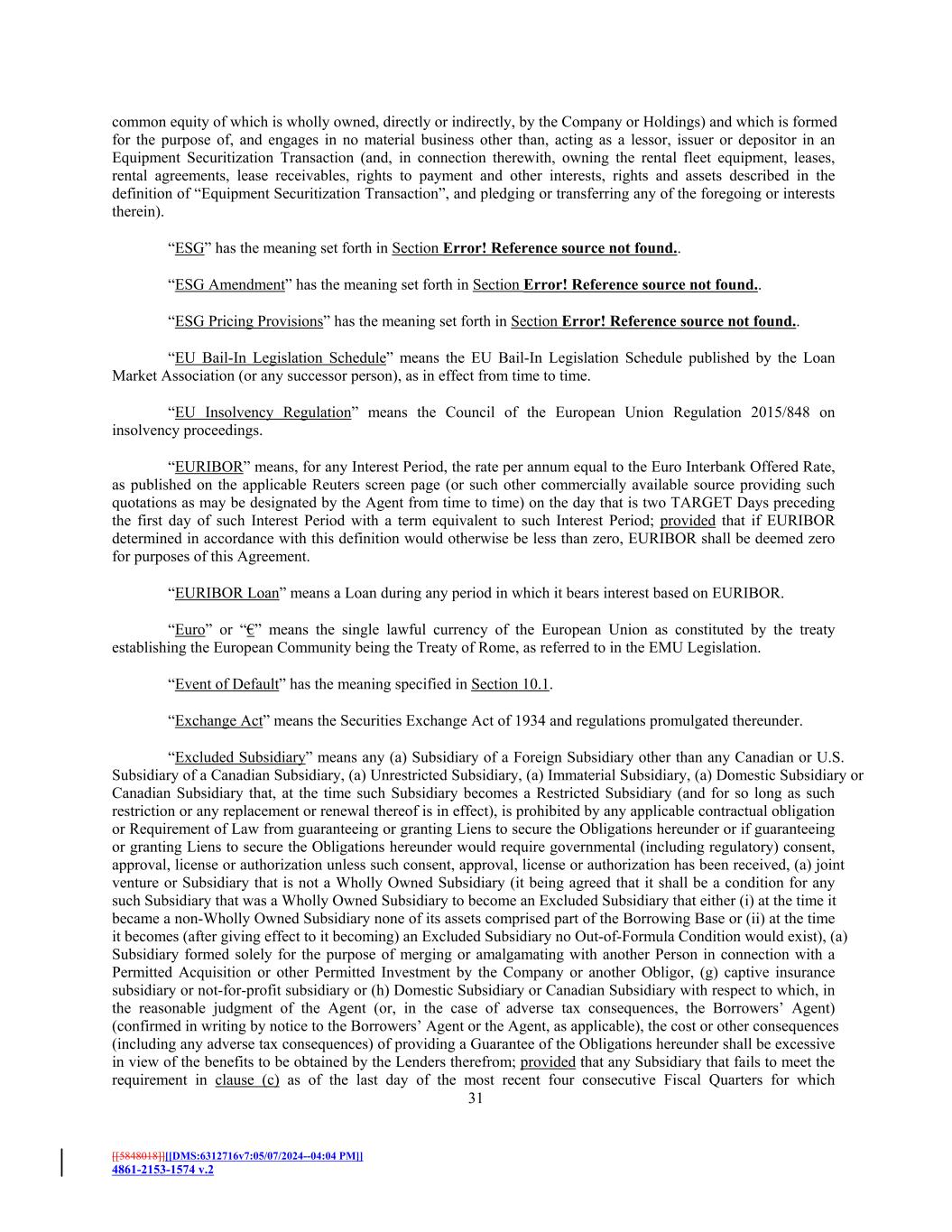 common equity of which is wholly owned, directly or indirectly, by the Company or Holdings) and which is formed for the purpose of, and engages in no material business other than, acting as a lessor, issuer or depositor in an Equipment Securitization Transaction (and, in connection therewith, owning the rental fleet equipment, leases, rental agreements, lease receivables, rights to payment and other interests, rights and assets described in the definition of “Equipment Securitization Transaction”, and pledging or transferring any of the foregoing or interests therein). “ESG” has the meaning set forth in Section Error! Reference source not found.. “ESG Amendment” has the meaning set forth in Section Error! Reference source not found.. “ESG Pricing Provisions” has the meaning set forth in Section Error! Reference source not found.. “EU Bail-In Legislation Schedule” means the EU Bail-In Legislation Schedule published by the Loan Market Association (or any successor person), as in effect from time to time. “EU Insolvency Regulation” means the Council of the European Union Regulation 2015/848 on insolvency proceedings. “EURIBOR” means, for any Interest Period, the rate per annum equal to the Euro Interbank Offered Rate, as published on the applicable Reuters screen page (or such other commercially available source providing such quotations as may be designated by the Agent from time to time) on the day that is two TARGET Days preceding the first day of such Interest Period with a term equivalent to such Interest Period; provided that if EURIBOR determined in accordance with this definition would otherwise be less than zero, EURIBOR shall be deemed zero for purposes of this Agreement. “EURIBOR Loan” means a Loan during any period in which it bears interest based on EURIBOR. “Euro” or “€” means the single lawful currency of the European Union as constituted by the treaty establishing the European Community being the Treaty of Rome, as referred to in the EMU Legislation. “Event of Default” has the meaning specified in Section 10.1. “Exchange Act” means the Securities Exchange Act of 1934 and regulations promulgated thereunder. “Excluded Subsidiary” means any (a) Subsidiary of a Foreign Subsidiary other than any Canadian or U.S. Subsidiary of a Canadian Subsidiary, (a) Unrestricted Subsidiary, (a) Immaterial Subsidiary, (a) Domestic Subsidiary or Canadian Subsidiary that, at the time such Subsidiary becomes a Restricted Subsidiary (and for so long as such restriction or any replacement or renewal thereof is in effect), is prohibited by any applicable contractual obligation or Requirement of Law from guaranteeing or granting Liens to secure the Obligations hereunder or if guaranteeing or granting Liens to secure the Obligations hereunder would require governmental (including regulatory) consent, approval, license or authorization unless such consent, approval, license or authorization has been received, (a) joint venture or Subsidiary that is not a Wholly Owned Subsidiary (it being agreed that it shall be a condition for any such Subsidiary that was a Wholly Owned Subsidiary to become an Excluded Subsidiary that either (i) at the time it became a non-Wholly Owned Subsidiary none of its assets comprised part of the Borrowing Base or (ii) at the time it becomes (after giving effect to it becoming) an Excluded Subsidiary no Out-of-Formula Condition would exist), (a) Subsidiary formed solely for the purpose of merging or amalgamating with another Person in connection with a Permitted Acquisition or other Permitted Investment by the Company or another Obligor, (g) captive insurance subsidiary or not-for-profit subsidiary or (h) Domestic Subsidiary or Canadian Subsidiary with respect to which, in the reasonable judgment of the Agent (or, in the case of adverse tax consequences, the Borrowers’ Agent) (confirmed in writing by notice to the Borrowers’ Agent or the Agent, as applicable), the cost or other consequences (including any adverse tax consequences) of providing a Guarantee of the Obligations hereunder shall be excessive in view of the benefits to be obtained by the Lenders therefrom; provided that any Subsidiary that fails to meet the requirement in clause (c) as of the last day of the most recent four consecutive Fiscal Quarters for which 31 [[5848018]][[DMS:6312716v7:05/07/2024--04:04 PM]] 4861-2153-1574 v.2