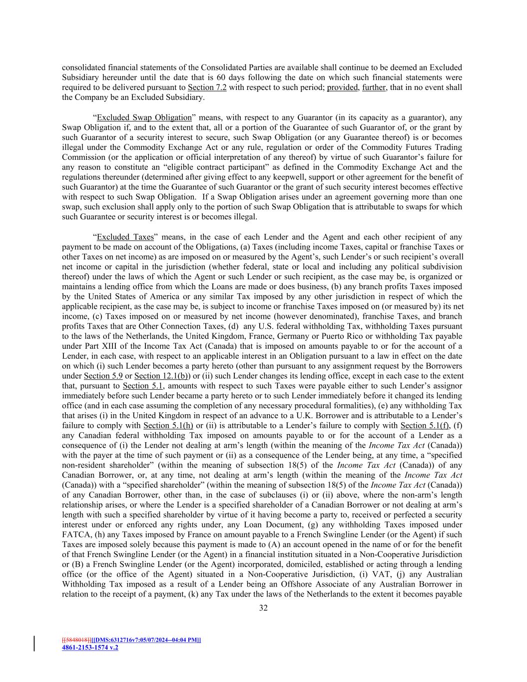 consolidated financial statements of the Consolidated Parties are available shall continue to be deemed an Excluded Subsidiary hereunder until the date that is 60 days following the date on which such financial statements were required to be delivered pursuant to Section 7.2 with respect to such period; provided, further, that in no event shall the Company be an Excluded Subsidiary. “Excluded Swap Obligation” means, with respect to any Guarantor (in its capacity as a guarantor), any Swap Obligation if, and to the extent that, all or a portion of the Guarantee of such Guarantor of, or the grant by such Guarantor of a security interest to secure, such Swap Obligation (or any Guarantee thereof) is or becomes illegal under the Commodity Exchange Act or any rule, regulation or order of the Commodity Futures Trading Commission (or the application or official interpretation of any thereof) by virtue of such Guarantor’s failure for any reason to constitute an “eligible contract participant” as defined in the Commodity Exchange Act and the regulations thereunder (determined after giving effect to any keepwell, support or other agreement for the benefit of such Guarantor) at the time the Guarantee of such Guarantor or the grant of such security interest becomes effective with respect to such Swap Obligation. If a Swap Obligation arises under an agreement governing more than one swap, such exclusion shall apply only to the portion of such Swap Obligation that is attributable to swaps for which such Guarantee or security interest is or becomes illegal. “Excluded Taxes” means, in the case of each Lender and the Agent and each other recipient of any payment to be made on account of the Obligations, (a) Taxes (including income Taxes, capital or franchise Taxes or other Taxes on net income) as are imposed on or measured by the Agent’s, such Lender’s or such recipient’s overall net income or capital in the jurisdiction (whether federal, state or local and including any political subdivision thereof) under the laws of which the Agent or such Lender or such recipient, as the case may be, is organized or maintains a lending office from which the Loans are made or does business, (b) any branch profits Taxes imposed by the United States of America or any similar Tax imposed by any other jurisdiction in respect of which the applicable recipient, as the case may be, is subject to income or franchise Taxes imposed on (or measured by) its net income, (c) Taxes imposed on or measured by net income (however denominated), franchise Taxes, and branch profits Taxes that are Other Connection Taxes, (d) any U.S. federal withholding Tax, withholding Taxes pursuant to the laws of the Netherlands, the United Kingdom, France, Germany or Puerto Rico or withholding Tax payable under Part XIII of the Income Tax Act (Canada) that is imposed on amounts payable to or for the account of a Lender, in each case, with respect to an applicable interest in an Obligation pursuant to a law in effect on the date on which (i) such Lender becomes a party hereto (other than pursuant to any assignment request by the Borrowers under Section 5.9 or Section 12.1(b)) or (ii) such Lender changes its lending office, except in each case to the extent that, pursuant to Section 5.1, amounts with respect to such Taxes were payable either to such Lender’s assignor immediately before such Lender became a party hereto or to such Lender immediately before it changed its lending office (and in each case assuming the completion of any necessary procedural formalities), (e) any withholding Tax that arises (i) in the United Kingdom in respect of an advance to a U.K. Borrower and is attributable to a Lender’s failure to comply with Section 5.1(h) or (ii) is attributable to a Lender’s failure to comply with Section 5.1(f), (f) any Canadian federal withholding Tax imposed on amounts payable to or for the account of a Lender as a consequence of (i) the Lender not dealing at arm’s length (within the meaning of the Income Tax Act (Canada)) with the payer at the time of such payment or (ii) as a consequence of the Lender being, at any time, a “specified non-resident shareholder” (within the meaning of subsection 18(5) of the Income Tax Act (Canada)) of any Canadian Borrower, or, at any time, not dealing at arm’s length (within the meaning of the Income Tax Act (Canada)) with a “specified shareholder” (within the meaning of subsection 18(5) of the Income Tax Act (Canada)) of any Canadian Borrower, other than, in the case of subclauses (i) or (ii) above, where the non-arm’s length relationship arises, or where the Lender is a specified shareholder of a Canadian Borrower or not dealing at arm’s length with such a specified shareholder by virtue of it having become a party to, received or perfected a security interest under or enforced any rights under, any Loan Document, (g) any withholding Taxes imposed under FATCA, (h) any Taxes imposed by France on amount payable to a French Swingline Lender (or the Agent) if such Taxes are imposed solely because this payment is made to (A) an account opened in the name of or for the benefit of that French Swingline Lender (or the Agent) in a financial institution situated in a Non-Cooperative Jurisdiction or (B) a French Swingline Lender (or the Agent) incorporated, domiciled, established or acting through a lending office (or the office of the Agent) situated in a Non-Cooperative Jurisdiction, (i) VAT, (j) any Australian Withholding Tax imposed as a result of a Lender being an Offshore Associate of any Australian Borrower in relation to the receipt of a payment, (k) any Tax under the laws of the Netherlands to the extent it becomes payable 32 [[5848018]][[DMS:6312716v7:05/07/2024--04:04 PM]] 4861-2153-1574 v.2