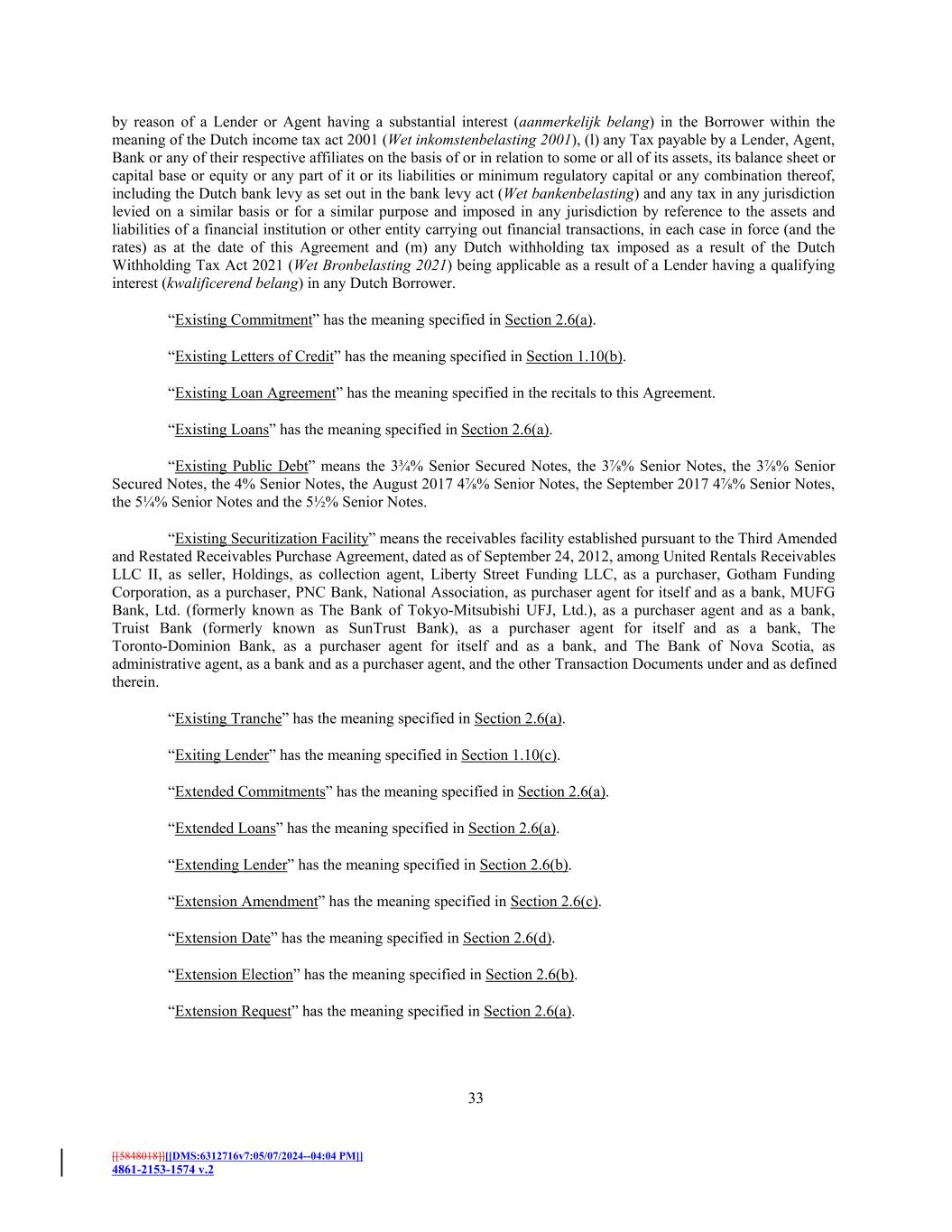 by reason of a Lender or Agent having a substantial interest (aanmerkelijk belang) in the Borrower within the meaning of the Dutch income tax act 2001 (Wet inkomstenbelasting 2001), (l) any Tax payable by a Lender, Agent, Bank or any of their respective affiliates on the basis of or in relation to some or all of its assets, its balance sheet or capital base or equity or any part of it or its liabilities or minimum regulatory capital or any combination thereof, including the Dutch bank levy as set out in the bank levy act (Wet bankenbelasting) and any tax in any jurisdiction levied on a similar basis or for a similar purpose and imposed in any jurisdiction by reference to the assets and liabilities of a financial institution or other entity carrying out financial transactions, in each case in force (and the rates) as at the date of this Agreement and (m) any Dutch withholding tax imposed as a result of the Dutch Withholding Tax Act 2021 (Wet Bronbelasting 2021) being applicable as a result of a Lender having a qualifying interest (kwalificerend belang) in any Dutch Borrower. “Existing Commitment” has the meaning specified in Section 2.6(a). “Existing Letters of Credit” has the meaning specified in Section 1.10(b). “Existing Loan Agreement” has the meaning specified in the recitals to this Agreement. “Existing Loans” has the meaning specified in Section 2.6(a). “Existing Public Debt” means the 3¾% Senior Secured Notes, the 3⅞% Senior Notes, the 3⅞% Senior Secured Notes, the 4% Senior Notes, the August 2017 4⅞% Senior Notes, the September 2017 4⅞% Senior Notes, the 5¼% Senior Notes and the 5½% Senior Notes. “Existing Securitization Facility” means the receivables facility established pursuant to the Third Amended and Restated Receivables Purchase Agreement, dated as of September 24, 2012, among United Rentals Receivables LLC II, as seller, Holdings, as collection agent, Liberty Street Funding LLC, as a purchaser, Gotham Funding Corporation, as a purchaser, PNC Bank, National Association, as purchaser agent for itself and as a bank, MUFG Bank, Ltd. (formerly known as The Bank of Tokyo-Mitsubishi UFJ, Ltd.), as a purchaser agent and as a bank, Truist Bank (formerly known as SunTrust Bank), as a purchaser agent for itself and as a bank, The Toronto-Dominion Bank, as a purchaser agent for itself and as a bank, and The Bank of Nova Scotia, as administrative agent, as a bank and as a purchaser agent, and the other Transaction Documents under and as defined therein. “Existing Tranche” has the meaning specified in Section 2.6(a). “Exiting Lender” has the meaning specified in Section 1.10(c). “Extended Commitments” has the meaning specified in Section 2.6(a). “Extended Loans” has the meaning specified in Section 2.6(a). “Extending Lender” has the meaning specified in Section 2.6(b). “Extension Amendment” has the meaning specified in Section 2.6(c). “Extension Date” has the meaning specified in Section 2.6(d). “Extension Election” has the meaning specified in Section 2.6(b). “Extension Request” has the meaning specified in Section 2.6(a). 33 [[5848018]][[DMS:6312716v7:05/07/2024--04:04 PM]] 4861-2153-1574 v.2