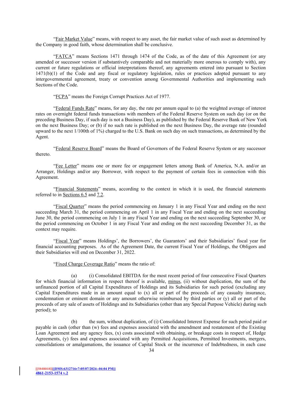 “Fair Market Value” means, with respect to any asset, the fair market value of such asset as determined by the Company in good faith, whose determination shall be conclusive. “FATCA” means Sections 1471 through 1474 of the Code, as of the date of this Agreement (or any amended or successor version if substantively comparable and not materially more onerous to comply with), any current or future regulations or official interpretations thereof, any agreements entered into pursuant to Section 1471(b)(1) of the Code and any fiscal or regulatory legislation, rules or practices adopted pursuant to any intergovernmental agreement, treaty or convention among Governmental Authorities and implementing such Sections of the Code. “FCPA” means the Foreign Corrupt Practices Act of 1977. “Federal Funds Rate” means, for any day, the rate per annum equal to (a) the weighted average of interest rates on overnight federal funds transactions with members of the Federal Reserve System on such day (or on the preceding Business Day, if such day is not a Business Day), as published by the Federal Reserve Bank of New York on the next Business Day; or (b) if no such rate is published on the next Business Day, the average rate (rounded upward to the next 1/100th of 1%) charged to the U.S. Bank on such day on such transactions, as determined by the Agent. “Federal Reserve Board” means the Board of Governors of the Federal Reserve System or any successor thereto. “Fee Letter” means one or more fee or engagement letters among Bank of America, N.A. and/or an Arranger, Holdings and/or any Borrower, with respect to the payment of certain fees in connection with this Agreement. “Financial Statements” means, according to the context in which it is used, the financial statements referred to in Sections 6.5 and 7.2. “Fiscal Quarter” means the period commencing on January 1 in any Fiscal Year and ending on the next succeeding March 31, the period commencing on April 1 in any Fiscal Year and ending on the next succeeding June 30, the period commencing on July 1 in any Fiscal Year and ending on the next succeeding September 30, or the period commencing on October 1 in any Fiscal Year and ending on the next succeeding December 31, as the context may require. “Fiscal Year” means Holdings’, the Borrowers’, the Guarantors’ and their Subsidiaries’ fiscal year for financial accounting purposes. As of the Agreement Date, the current Fiscal Year of Holdings, the Obligors and their Subsidiaries will end on December 31, 2022. “Fixed Charge Coverage Ratio” means the ratio of: (a) (i) Consolidated EBITDA for the most recent period of four consecutive Fiscal Quarters for which financial information in respect thereof is available, minus, (ii) without duplication, the sum of the unfinanced portion of all Capital Expenditures of Holdings and its Subsidiaries for such period (excluding any Capital Expenditures made in an amount equal to (x) all or part of the proceeds of any casualty insurance, condemnation or eminent domain or any amount otherwise reimbursed by third parties or (y) all or part of the proceeds of any sale of assets of Holdings and its Subsidiaries (other than any Special Purpose Vehicle) during such period); to (b) the sum, without duplication, of (i) Consolidated Interest Expense for such period paid or payable in cash (other than (w) fees and expenses associated with the amendment and restatement of the Existing Loan Agreement and any agency fees, (x) costs associated with obtaining, or breakage costs in respect of, Hedge Agreements, (y) fees and expenses associated with any Permitted Acquisitions, Permitted Investments, mergers, consolidations or amalgamations, the issuance of Capital Stock or the incurrence of Indebtedness, in each case 34 [[5848018]][[DMS:6312716v7:05/07/2024--04:04 PM]] 4861-2153-1574 v.2