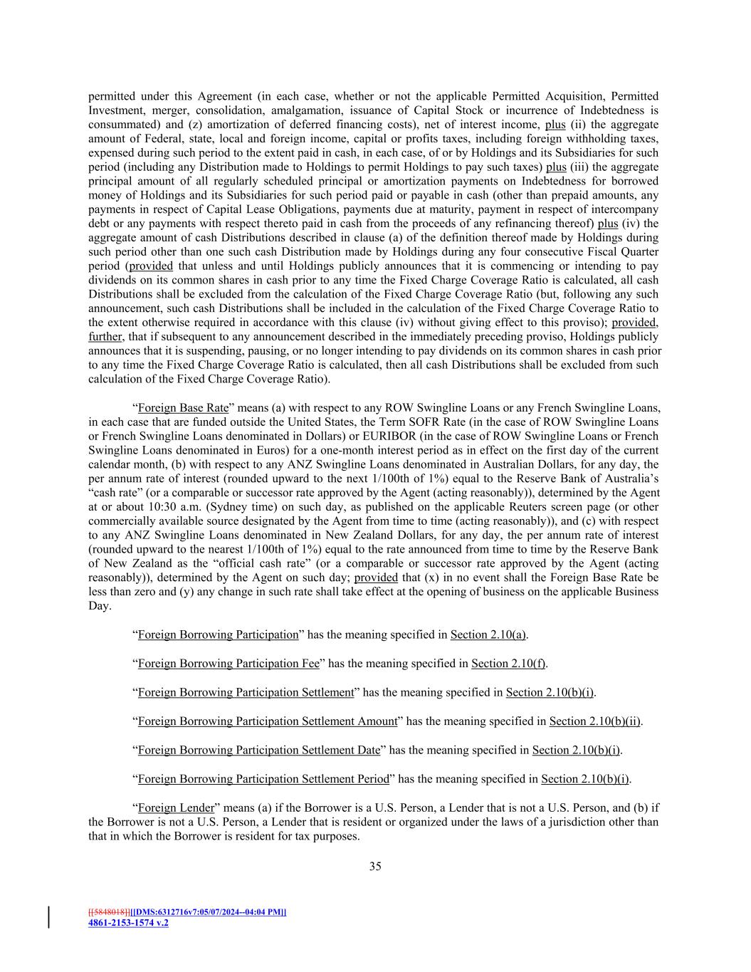 permitted under this Agreement (in each case, whether or not the applicable Permitted Acquisition, Permitted Investment, merger, consolidation, amalgamation, issuance of Capital Stock or incurrence of Indebtedness is consummated) and (z) amortization of deferred financing costs), net of interest income, plus (ii) the aggregate amount of Federal, state, local and foreign income, capital or profits taxes, including foreign withholding taxes, expensed during such period to the extent paid in cash, in each case, of or by Holdings and its Subsidiaries for such period (including any Distribution made to Holdings to permit Holdings to pay such taxes) plus (iii) the aggregate principal amount of all regularly scheduled principal or amortization payments on Indebtedness for borrowed money of Holdings and its Subsidiaries for such period paid or payable in cash (other than prepaid amounts, any payments in respect of Capital Lease Obligations, payments due at maturity, payment in respect of intercompany debt or any payments with respect thereto paid in cash from the proceeds of any refinancing thereof) plus (iv) the aggregate amount of cash Distributions described in clause (a) of the definition thereof made by Holdings during such period other than one such cash Distribution made by Holdings during any four consecutive Fiscal Quarter period (provided that unless and until Holdings publicly announces that it is commencing or intending to pay dividends on its common shares in cash prior to any time the Fixed Charge Coverage Ratio is calculated, all cash Distributions shall be excluded from the calculation of the Fixed Charge Coverage Ratio (but, following any such announcement, such cash Distributions shall be included in the calculation of the Fixed Charge Coverage Ratio to the extent otherwise required in accordance with this clause (iv) without giving effect to this proviso); provided, further, that if subsequent to any announcement described in the immediately preceding proviso, Holdings publicly announces that it is suspending, pausing, or no longer intending to pay dividends on its common shares in cash prior to any time the Fixed Charge Coverage Ratio is calculated, then all cash Distributions shall be excluded from such calculation of the Fixed Charge Coverage Ratio). “Foreign Base Rate” means (a) with respect to any ROW Swingline Loans or any French Swingline Loans, in each case that are funded outside the United States, the Term SOFR Rate (in the case of ROW Swingline Loans or French Swingline Loans denominated in Dollars) or EURIBOR (in the case of ROW Swingline Loans or French Swingline Loans denominated in Euros) for a one-month interest period as in effect on the first day of the current calendar month, (b) with respect to any ANZ Swingline Loans denominated in Australian Dollars, for any day, the per annum rate of interest (rounded upward to the next 1/100th of 1%) equal to the Reserve Bank of Australia’s “cash rate” (or a comparable or successor rate approved by the Agent (acting reasonably)), determined by the Agent at or about 10:30 a.m. (Sydney time) on such day, as published on the applicable Reuters screen page (or other commercially available source designated by the Agent from time to time (acting reasonably)), and (c) with respect to any ANZ Swingline Loans denominated in New Zealand Dollars, for any day, the per annum rate of interest (rounded upward to the nearest 1/100th of 1%) equal to the rate announced from time to time by the Reserve Bank of New Zealand as the “official cash rate” (or a comparable or successor rate approved by the Agent (acting reasonably)), determined by the Agent on such day; provided that (x) in no event shall the Foreign Base Rate be less than zero and (y) any change in such rate shall take effect at the opening of business on the applicable Business Day. “Foreign Borrowing Participation” has the meaning specified in Section 2.10(a). “Foreign Borrowing Participation Fee” has the meaning specified in Section 2.10(f). “Foreign Borrowing Participation Settlement” has the meaning specified in Section 2.10(b)(i). “Foreign Borrowing Participation Settlement Amount” has the meaning specified in Section 2.10(b)(ii). “Foreign Borrowing Participation Settlement Date” has the meaning specified in Section 2.10(b)(i). “Foreign Borrowing Participation Settlement Period” has the meaning specified in Section 2.10(b)(i). “Foreign Lender” means (a) if the Borrower is a U.S. Person, a Lender that is not a U.S. Person, and (b) if the Borrower is not a U.S. Person, a Lender that is resident or organized under the laws of a jurisdiction other than that in which the Borrower is resident for tax purposes. 35 [[5848018]][[DMS:6312716v7:05/07/2024--04:04 PM]] 4861-2153-1574 v.2