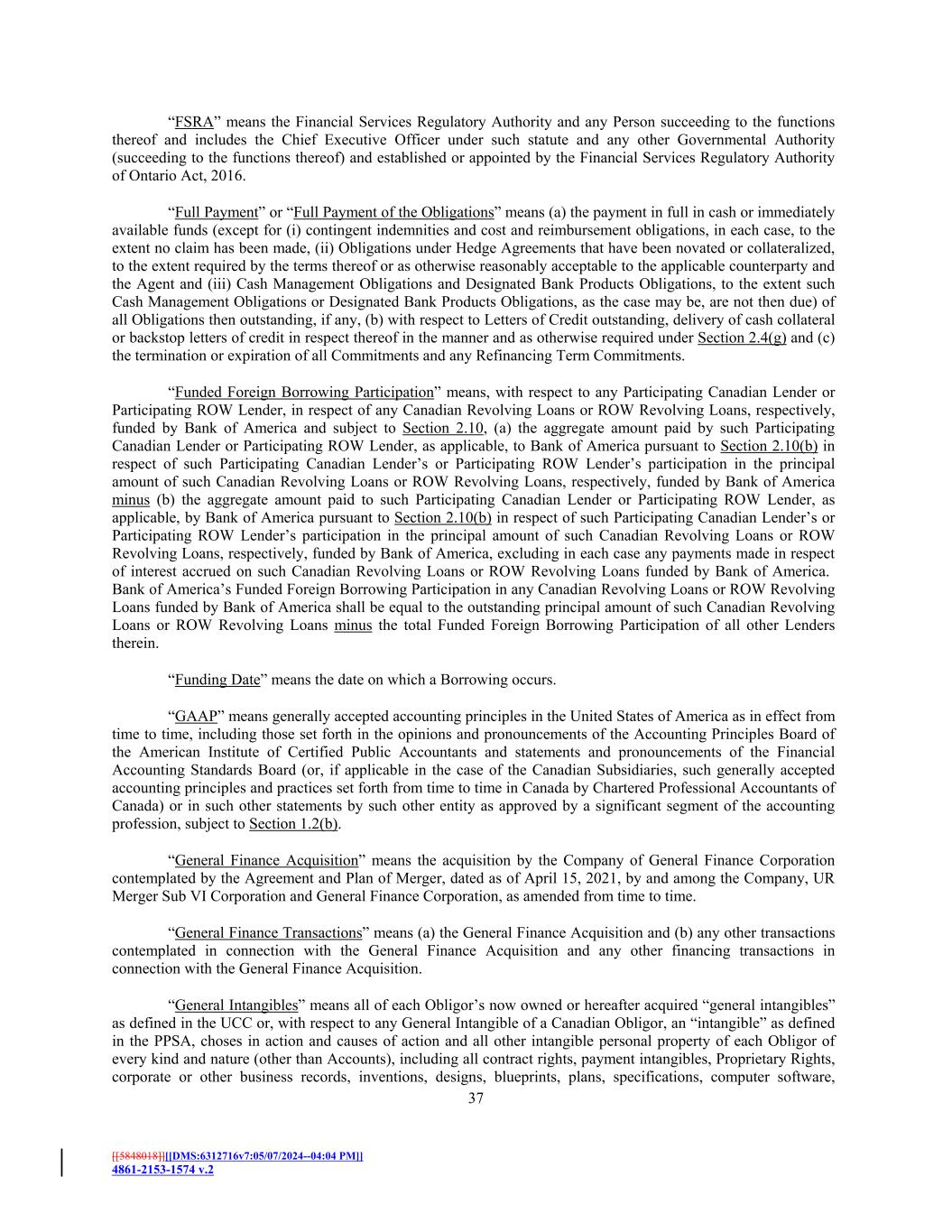 “FSRA” means the Financial Services Regulatory Authority and any Person succeeding to the functions thereof and includes the Chief Executive Officer under such statute and any other Governmental Authority (succeeding to the functions thereof) and established or appointed by the Financial Services Regulatory Authority of Ontario Act, 2016. “Full Payment” or “Full Payment of the Obligations” means (a) the payment in full in cash or immediately available funds (except for (i) contingent indemnities and cost and reimbursement obligations, in each case, to the extent no claim has been made, (ii) Obligations under Hedge Agreements that have been novated or collateralized, to the extent required by the terms thereof or as otherwise reasonably acceptable to the applicable counterparty and the Agent and (iii) Cash Management Obligations and Designated Bank Products Obligations, to the extent such Cash Management Obligations or Designated Bank Products Obligations, as the case may be, are not then due) of all Obligations then outstanding, if any, (b) with respect to Letters of Credit outstanding, delivery of cash collateral or backstop letters of credit in respect thereof in the manner and as otherwise required under Section 2.4(g) and (c) the termination or expiration of all Commitments and any Refinancing Term Commitments. “Funded Foreign Borrowing Participation” means, with respect to any Participating Canadian Lender or Participating ROW Lender, in respect of any Canadian Revolving Loans or ROW Revolving Loans, respectively, funded by Bank of America and subject to Section 2.10, (a) the aggregate amount paid by such Participating Canadian Lender or Participating ROW Lender, as applicable, to Bank of America pursuant to Section 2.10(b) in respect of such Participating Canadian Lender’s or Participating ROW Lender’s participation in the principal amount of such Canadian Revolving Loans or ROW Revolving Loans, respectively, funded by Bank of America minus (b) the aggregate amount paid to such Participating Canadian Lender or Participating ROW Lender, as applicable, by Bank of America pursuant to Section 2.10(b) in respect of such Participating Canadian Lender’s or Participating ROW Lender’s participation in the principal amount of such Canadian Revolving Loans or ROW Revolving Loans, respectively, funded by Bank of America, excluding in each case any payments made in respect of interest accrued on such Canadian Revolving Loans or ROW Revolving Loans funded by Bank of America. Bank of America’s Funded Foreign Borrowing Participation in any Canadian Revolving Loans or ROW Revolving Loans funded by Bank of America shall be equal to the outstanding principal amount of such Canadian Revolving Loans or ROW Revolving Loans minus the total Funded Foreign Borrowing Participation of all other Lenders therein. “Funding Date” means the date on which a Borrowing occurs. “GAAP” means generally accepted accounting principles in the United States of America as in effect from time to time, including those set forth in the opinions and pronouncements of the Accounting Principles Board of the American Institute of Certified Public Accountants and statements and pronouncements of the Financial Accounting Standards Board (or, if applicable in the case of the Canadian Subsidiaries, such generally accepted accounting principles and practices set forth from time to time in Canada by Chartered Professional Accountants of Canada) or in such other statements by such other entity as approved by a significant segment of the accounting profession, subject to Section 1.2(b). “General Finance Acquisition” means the acquisition by the Company of General Finance Corporation contemplated by the Agreement and Plan of Merger, dated as of April 15, 2021, by and among the Company, UR Merger Sub VI Corporation and General Finance Corporation, as amended from time to time. “General Finance Transactions” means (a) the General Finance Acquisition and (b) any other transactions contemplated in connection with the General Finance Acquisition and any other financing transactions in connection with the General Finance Acquisition. “General Intangibles” means all of each Obligor’s now owned or hereafter acquired “general intangibles” as defined in the UCC or, with respect to any General Intangible of a Canadian Obligor, an “intangible” as defined in the PPSA, choses in action and causes of action and all other intangible personal property of each Obligor of every kind and nature (other than Accounts), including all contract rights, payment intangibles, Proprietary Rights, corporate or other business records, inventions, designs, blueprints, plans, specifications, computer software, 37 [[5848018]][[DMS:6312716v7:05/07/2024--04:04 PM]] 4861-2153-1574 v.2
