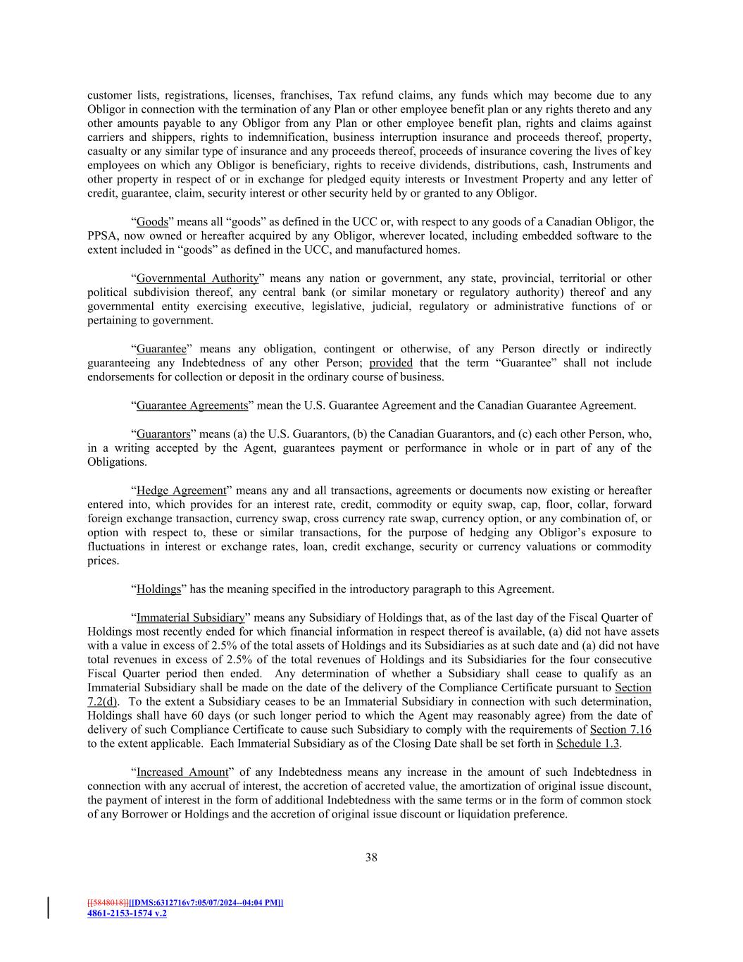 customer lists, registrations, licenses, franchises, Tax refund claims, any funds which may become due to any Obligor in connection with the termination of any Plan or other employee benefit plan or any rights thereto and any other amounts payable to any Obligor from any Plan or other employee benefit plan, rights and claims against carriers and shippers, rights to indemnification, business interruption insurance and proceeds thereof, property, casualty or any similar type of insurance and any proceeds thereof, proceeds of insurance covering the lives of key employees on which any Obligor is beneficiary, rights to receive dividends, distributions, cash, Instruments and other property in respect of or in exchange for pledged equity interests or Investment Property and any letter of credit, guarantee, claim, security interest or other security held by or granted to any Obligor. “Goods” means all “goods” as defined in the UCC or, with respect to any goods of a Canadian Obligor, the PPSA, now owned or hereafter acquired by any Obligor, wherever located, including embedded software to the extent included in “goods” as defined in the UCC, and manufactured homes. “Governmental Authority” means any nation or government, any state, provincial, territorial or other political subdivision thereof, any central bank (or similar monetary or regulatory authority) thereof and any governmental entity exercising executive, legislative, judicial, regulatory or administrative functions of or pertaining to government. “Guarantee” means any obligation, contingent or otherwise, of any Person directly or indirectly guaranteeing any Indebtedness of any other Person; provided that the term “Guarantee” shall not include endorsements for collection or deposit in the ordinary course of business. “Guarantee Agreements” mean the U.S. Guarantee Agreement and the Canadian Guarantee Agreement. “Guarantors” means (a) the U.S. Guarantors, (b) the Canadian Guarantors, and (c) each other Person, who, in a writing accepted by the Agent, guarantees payment or performance in whole or in part of any of the Obligations. “Hedge Agreement” means any and all transactions, agreements or documents now existing or hereafter entered into, which provides for an interest rate, credit, commodity or equity swap, cap, floor, collar, forward foreign exchange transaction, currency swap, cross currency rate swap, currency option, or any combination of, or option with respect to, these or similar transactions, for the purpose of hedging any Obligor’s exposure to fluctuations in interest or exchange rates, loan, credit exchange, security or currency valuations or commodity prices. “Holdings” has the meaning specified in the introductory paragraph to this Agreement. “Immaterial Subsidiary” means any Subsidiary of Holdings that, as of the last day of the Fiscal Quarter of Holdings most recently ended for which financial information in respect thereof is available, (a) did not have assets with a value in excess of 2.5% of the total assets of Holdings and its Subsidiaries as at such date and (a) did not have total revenues in excess of 2.5% of the total revenues of Holdings and its Subsidiaries for the four consecutive Fiscal Quarter period then ended. Any determination of whether a Subsidiary shall cease to qualify as an Immaterial Subsidiary shall be made on the date of the delivery of the Compliance Certificate pursuant to Section 7.2(d). To the extent a Subsidiary ceases to be an Immaterial Subsidiary in connection with such determination, Holdings shall have 60 days (or such longer period to which the Agent may reasonably agree) from the date of delivery of such Compliance Certificate to cause such Subsidiary to comply with the requirements of Section 7.16 to the extent applicable. Each Immaterial Subsidiary as of the Closing Date shall be set forth in Schedule 1.3. “Increased Amount” of any Indebtedness means any increase in the amount of such Indebtedness in connection with any accrual of interest, the accretion of accreted value, the amortization of original issue discount, the payment of interest in the form of additional Indebtedness with the same terms or in the form of common stock of any Borrower or Holdings and the accretion of original issue discount or liquidation preference. 38 [[5848018]][[DMS:6312716v7:05/07/2024--04:04 PM]] 4861-2153-1574 v.2