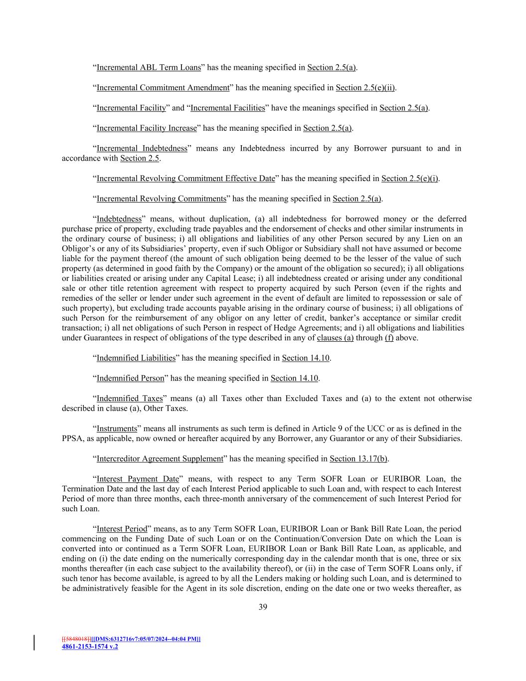 “Incremental ABL Term Loans” has the meaning specified in Section 2.5(a). “Incremental Commitment Amendment” has the meaning specified in Section 2.5(e)(ii). “Incremental Facility” and “Incremental Facilities” have the meanings specified in Section 2.5(a). “Incremental Facility Increase” has the meaning specified in Section 2.5(a). “Incremental Indebtedness” means any Indebtedness incurred by any Borrower pursuant to and in accordance with Section 2.5. “Incremental Revolving Commitment Effective Date” has the meaning specified in Section 2.5(e)(i). “Incremental Revolving Commitments” has the meaning specified in Section 2.5(a). “Indebtedness” means, without duplication, (a) all indebtedness for borrowed money or the deferred purchase price of property, excluding trade payables and the endorsement of checks and other similar instruments in the ordinary course of business; i) all obligations and liabilities of any other Person secured by any Lien on an Obligor’s or any of its Subsidiaries’ property, even if such Obligor or Subsidiary shall not have assumed or become liable for the payment thereof (the amount of such obligation being deemed to be the lesser of the value of such property (as determined in good faith by the Company) or the amount of the obligation so secured); i) all obligations or liabilities created or arising under any Capital Lease; i) all indebtedness created or arising under any conditional sale or other title retention agreement with respect to property acquired by such Person (even if the rights and remedies of the seller or lender under such agreement in the event of default are limited to repossession or sale of such property), but excluding trade accounts payable arising in the ordinary course of business; i) all obligations of such Person for the reimbursement of any obligor on any letter of credit, banker’s acceptance or similar credit transaction; i) all net obligations of such Person in respect of Hedge Agreements; and i) all obligations and liabilities under Guarantees in respect of obligations of the type described in any of clauses (a) through (f) above. “Indemnified Liabilities” has the meaning specified in Section 14.10. “Indemnified Person” has the meaning specified in Section 14.10. “Indemnified Taxes” means (a) all Taxes other than Excluded Taxes and (a) to the extent not otherwise described in clause (a), Other Taxes. “Instruments” means all instruments as such term is defined in Article 9 of the UCC or as is defined in the PPSA, as applicable, now owned or hereafter acquired by any Borrower, any Guarantor or any of their Subsidiaries. “Intercreditor Agreement Supplement” has the meaning specified in Section 13.17(b). “Interest Payment Date” means, with respect to any Term SOFR Loan or EURIBOR Loan, the Termination Date and the last day of each Interest Period applicable to such Loan and, with respect to each Interest Period of more than three months, each three-month anniversary of the commencement of such Interest Period for such Loan. “Interest Period” means, as to any Term SOFR Loan, EURIBOR Loan or Bank Bill Rate Loan, the period commencing on the Funding Date of such Loan or on the Continuation/Conversion Date on which the Loan is converted into or continued as a Term SOFR Loan, EURIBOR Loan or Bank Bill Rate Loan, as applicable, and ending on (i) the date ending on the numerically corresponding day in the calendar month that is one, three or six months thereafter (in each case subject to the availability thereof), or (ii) in the case of Term SOFR Loans only, if such tenor has become available, is agreed to by all the Lenders making or holding such Loan, and is determined to be administratively feasible for the Agent in its sole discretion, ending on the date one or two weeks thereafter, as 39 [[5848018]][[DMS:6312716v7:05/07/2024--04:04 PM]] 4861-2153-1574 v.2
