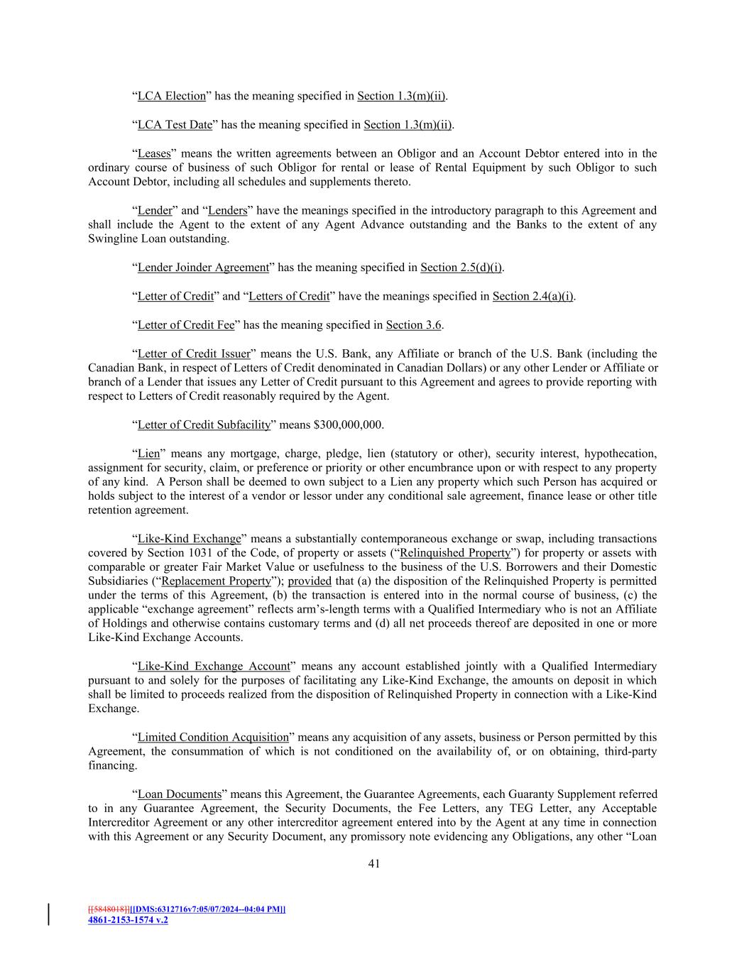 “LCA Election” has the meaning specified in Section 1.3(m)(ii). “LCA Test Date” has the meaning specified in Section 1.3(m)(ii). “Leases” means the written agreements between an Obligor and an Account Debtor entered into in the ordinary course of business of such Obligor for rental or lease of Rental Equipment by such Obligor to such Account Debtor, including all schedules and supplements thereto. “Lender” and “Lenders” have the meanings specified in the introductory paragraph to this Agreement and shall include the Agent to the extent of any Agent Advance outstanding and the Banks to the extent of any Swingline Loan outstanding. “Lender Joinder Agreement” has the meaning specified in Section 2.5(d)(i). “Letter of Credit” and “Letters of Credit” have the meanings specified in Section 2.4(a)(i). “Letter of Credit Fee” has the meaning specified in Section 3.6. “Letter of Credit Issuer” means the U.S. Bank, any Affiliate or branch of the U.S. Bank (including the Canadian Bank, in respect of Letters of Credit denominated in Canadian Dollars) or any other Lender or Affiliate or branch of a Lender that issues any Letter of Credit pursuant to this Agreement and agrees to provide reporting with respect to Letters of Credit reasonably required by the Agent. “Letter of Credit Subfacility” means $300,000,000. “Lien” means any mortgage, charge, pledge, lien (statutory or other), security interest, hypothecation, assignment for security, claim, or preference or priority or other encumbrance upon or with respect to any property of any kind. A Person shall be deemed to own subject to a Lien any property which such Person has acquired or holds subject to the interest of a vendor or lessor under any conditional sale agreement, finance lease or other title retention agreement. “Like-Kind Exchange” means a substantially contemporaneous exchange or swap, including transactions covered by Section 1031 of the Code, of property or assets (“Relinquished Property”) for property or assets with comparable or greater Fair Market Value or usefulness to the business of the U.S. Borrowers and their Domestic Subsidiaries (“Replacement Property”); provided that (a) the disposition of the Relinquished Property is permitted under the terms of this Agreement, (b) the transaction is entered into in the normal course of business, (c) the applicable “exchange agreement” reflects arm’s-length terms with a Qualified Intermediary who is not an Affiliate of Holdings and otherwise contains customary terms and (d) all net proceeds thereof are deposited in one or more Like-Kind Exchange Accounts. “Like-Kind Exchange Account” means any account established jointly with a Qualified Intermediary pursuant to and solely for the purposes of facilitating any Like-Kind Exchange, the amounts on deposit in which shall be limited to proceeds realized from the disposition of Relinquished Property in connection with a Like-Kind Exchange. “Limited Condition Acquisition” means any acquisition of any assets, business or Person permitted by this Agreement, the consummation of which is not conditioned on the availability of, or on obtaining, third-party financing. “Loan Documents” means this Agreement, the Guarantee Agreements, each Guaranty Supplement referred to in any Guarantee Agreement, the Security Documents, the Fee Letters, any TEG Letter, any Acceptable Intercreditor Agreement or any other intercreditor agreement entered into by the Agent at any time in connection with this Agreement or any Security Document, any promissory note evidencing any Obligations, any other “Loan 41 [[5848018]][[DMS:6312716v7:05/07/2024--04:04 PM]] 4861-2153-1574 v.2