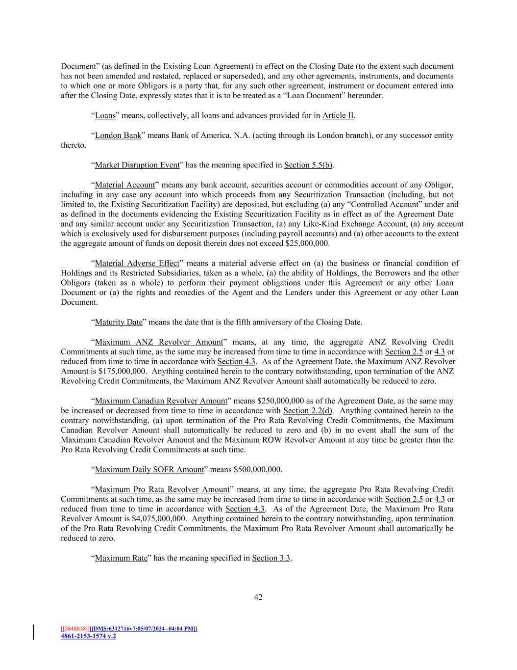 Document” (as defined in the Existing Loan Agreement) in effect on the Closing Date (to the extent such document has not been amended and restated, replaced or superseded), and any other agreements, instruments, and documents to which one or more Obligors is a party that, for any such other agreement, instrument or document entered into after the Closing Date, expressly states that it is to be treated as a “Loan Document” hereunder. “Loans” means, collectively, all loans and advances provided for in Article II. “London Bank” means Bank of America, N.A. (acting through its London branch), or any successor entity thereto. “Market Disruption Event” has the meaning specified in Section 5.5(b). “Material Account” means any bank account, securities account or commodities account of any Obligor, including in any case any account into which proceeds from any Securitization Transaction (including, but not limited to, the Existing Securitization Facility) are deposited, but excluding (a) any “Controlled Account” under and as defined in the documents evidencing the Existing Securitization Facility as in effect as of the Agreement Date and any similar account under any Securitization Transaction, (a) any Like-Kind Exchange Account, (a) any account which is exclusively used for disbursement purposes (including payroll accounts) and (a) other accounts to the extent the aggregate amount of funds on deposit therein does not exceed $25,000,000. “Material Adverse Effect” means a material adverse effect on (a) the business or financial condition of Holdings and its Restricted Subsidiaries, taken as a whole, (a) the ability of Holdings, the Borrowers and the other Obligors (taken as a whole) to perform their payment obligations under this Agreement or any other Loan Document or (a) the rights and remedies of the Agent and the Lenders under this Agreement or any other Loan Document. “Maturity Date” means the date that is the fifth anniversary of the Closing Date. “Maximum ANZ Revolver Amount” means, at any time, the aggregate ANZ Revolving Credit Commitments at such time, as the same may be increased from time to time in accordance with Section 2.5 or 4.3 or reduced from time to time in accordance with Section 4.3. As of the Agreement Date, the Maximum ANZ Revolver Amount is $175,000,000. Anything contained herein to the contrary notwithstanding, upon termination of the ANZ Revolving Credit Commitments, the Maximum ANZ Revolver Amount shall automatically be reduced to zero. “Maximum Canadian Revolver Amount” means $250,000,000 as of the Agreement Date, as the same may be increased or decreased from time to time in accordance with Section 2.2(d). Anything contained herein to the contrary notwithstanding, (a) upon termination of the Pro Rata Revolving Credit Commitments, the Maximum Canadian Revolver Amount shall automatically be reduced to zero and (b) in no event shall the sum of the Maximum Canadian Revolver Amount and the Maximum ROW Revolver Amount at any time be greater than the Pro Rata Revolving Credit Commitments at such time. “Maximum Daily SOFR Amount” means $500,000,000. “Maximum Pro Rata Revolver Amount” means, at any time, the aggregate Pro Rata Revolving Credit Commitments at such time, as the same may be increased from time to time in accordance with Section 2.5 or 4.3 or reduced from time to time in accordance with Section 4.3. As of the Agreement Date, the Maximum Pro Rata Revolver Amount is $4,075,000,000. Anything contained herein to the contrary notwithstanding, upon termination of the Pro Rata Revolving Credit Commitments, the Maximum Pro Rata Revolver Amount shall automatically be reduced to zero. “Maximum Rate” has the meaning specified in Section 3.3. 42 [[5848018]][[DMS:6312716v7:05/07/2024--04:04 PM]] 4861-2153-1574 v.2