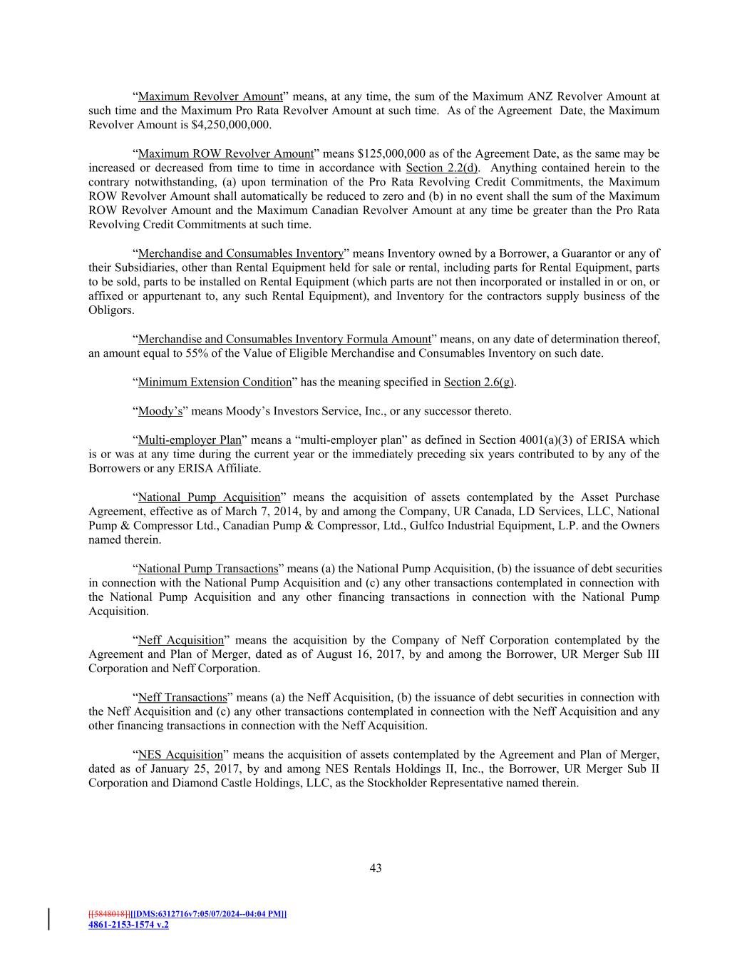 “Maximum Revolver Amount” means, at any time, the sum of the Maximum ANZ Revolver Amount at such time and the Maximum Pro Rata Revolver Amount at such time. As of the Agreement Date, the Maximum Revolver Amount is $4,250,000,000. “Maximum ROW Revolver Amount” means $125,000,000 as of the Agreement Date, as the same may be increased or decreased from time to time in accordance with Section 2.2(d). Anything contained herein to the contrary notwithstanding, (a) upon termination of the Pro Rata Revolving Credit Commitments, the Maximum ROW Revolver Amount shall automatically be reduced to zero and (b) in no event shall the sum of the Maximum ROW Revolver Amount and the Maximum Canadian Revolver Amount at any time be greater than the Pro Rata Revolving Credit Commitments at such time. “Merchandise and Consumables Inventory” means Inventory owned by a Borrower, a Guarantor or any of their Subsidiaries, other than Rental Equipment held for sale or rental, including parts for Rental Equipment, parts to be sold, parts to be installed on Rental Equipment (which parts are not then incorporated or installed in or on, or affixed or appurtenant to, any such Rental Equipment), and Inventory for the contractors supply business of the Obligors. “Merchandise and Consumables Inventory Formula Amount” means, on any date of determination thereof, an amount equal to 55% of the Value of Eligible Merchandise and Consumables Inventory on such date. “Minimum Extension Condition” has the meaning specified in Section 2.6(g). “Moody’s” means Moody’s Investors Service, Inc., or any successor thereto. “Multi-employer Plan” means a “multi-employer plan” as defined in Section 4001(a)(3) of ERISA which is or was at any time during the current year or the immediately preceding six years contributed to by any of the Borrowers or any ERISA Affiliate. “National Pump Acquisition” means the acquisition of assets contemplated by the Asset Purchase Agreement, effective as of March 7, 2014, by and among the Company, UR Canada, LD Services, LLC, National Pump & Compressor Ltd., Canadian Pump & Compressor, Ltd., Gulfco Industrial Equipment, L.P. and the Owners named therein. “National Pump Transactions” means (a) the National Pump Acquisition, (b) the issuance of debt securities in connection with the National Pump Acquisition and (c) any other transactions contemplated in connection with the National Pump Acquisition and any other financing transactions in connection with the National Pump Acquisition. “Neff Acquisition” means the acquisition by the Company of Neff Corporation contemplated by the Agreement and Plan of Merger, dated as of August 16, 2017, by and among the Borrower, UR Merger Sub III Corporation and Neff Corporation. “Neff Transactions” means (a) the Neff Acquisition, (b) the issuance of debt securities in connection with the Neff Acquisition and (c) any other transactions contemplated in connection with the Neff Acquisition and any other financing transactions in connection with the Neff Acquisition. “NES Acquisition” means the acquisition of assets contemplated by the Agreement and Plan of Merger, dated as of January 25, 2017, by and among NES Rentals Holdings II, Inc., the Borrower, UR Merger Sub II Corporation and Diamond Castle Holdings, LLC, as the Stockholder Representative named therein. 43 [[5848018]][[DMS:6312716v7:05/07/2024--04:04 PM]] 4861-2153-1574 v.2