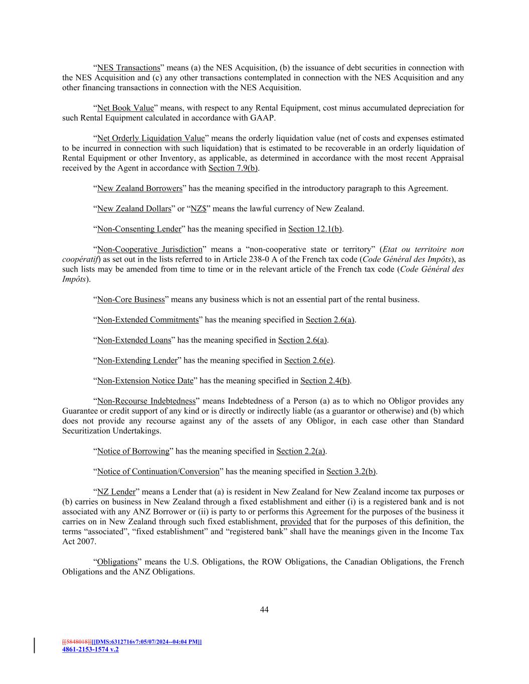 “NES Transactions” means (a) the NES Acquisition, (b) the issuance of debt securities in connection with the NES Acquisition and (c) any other transactions contemplated in connection with the NES Acquisition and any other financing transactions in connection with the NES Acquisition. “Net Book Value” means, with respect to any Rental Equipment, cost minus accumulated depreciation for such Rental Equipment calculated in accordance with GAAP. “Net Orderly Liquidation Value” means the orderly liquidation value (net of costs and expenses estimated to be incurred in connection with such liquidation) that is estimated to be recoverable in an orderly liquidation of Rental Equipment or other Inventory, as applicable, as determined in accordance with the most recent Appraisal received by the Agent in accordance with Section 7.9(b). “New Zealand Borrowers” has the meaning specified in the introductory paragraph to this Agreement. “New Zealand Dollars” or “NZ$” means the lawful currency of New Zealand. “Non-Consenting Lender” has the meaning specified in Section 12.1(b). “Non-Cooperative Jurisdiction” means a “non-cooperative state or territory” (Etat ou territoire non coopératif) as set out in the lists referred to in Article 238-0 A of the French tax code (Code Général des Impôts), as such lists may be amended from time to time or in the relevant article of the French tax code (Code Général des Impôts). “Non-Core Business” means any business which is not an essential part of the rental business. “Non-Extended Commitments” has the meaning specified in Section 2.6(a). “Non-Extended Loans” has the meaning specified in Section 2.6(a). “Non-Extending Lender” has the meaning specified in Section 2.6(e). “Non-Extension Notice Date” has the meaning specified in Section 2.4(b). “Non-Recourse Indebtedness” means Indebtedness of a Person (a) as to which no Obligor provides any Guarantee or credit support of any kind or is directly or indirectly liable (as a guarantor or otherwise) and (b) which does not provide any recourse against any of the assets of any Obligor, in each case other than Standard Securitization Undertakings. “Notice of Borrowing” has the meaning specified in Section 2.2(a). “Notice of Continuation/Conversion” has the meaning specified in Section 3.2(b). “NZ Lender” means a Lender that (a) is resident in New Zealand for New Zealand income tax purposes or (b) carries on business in New Zealand through a fixed establishment and either (i) is a registered bank and is not associated with any ANZ Borrower or (ii) is party to or performs this Agreement for the purposes of the business it carries on in New Zealand through such fixed establishment, provided that for the purposes of this definition, the terms “associated”, “fixed establishment” and “registered bank” shall have the meanings given in the Income Tax Act 2007. “Obligations” means the U.S. Obligations, the ROW Obligations, the Canadian Obligations, the French Obligations and the ANZ Obligations. 44 [[5848018]][[DMS:6312716v7:05/07/2024--04:04 PM]] 4861-2153-1574 v.2