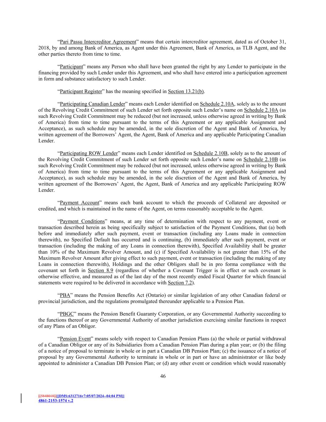 “Pari Passu Intercreditor Agreement” means that certain intercreditor agreement, dated as of October 31, 2018, by and among Bank of America, as Agent under this Agreement, Bank of America, as TLB Agent, and the other parties thereto from time to time. “Participant” means any Person who shall have been granted the right by any Lender to participate in the financing provided by such Lender under this Agreement, and who shall have entered into a participation agreement in form and substance satisfactory to such Lender. “Participant Register” has the meaning specified in Section 13.21(b). “Participating Canadian Lender” means each Lender identified on Schedule 2.10A, solely as to the amount of the Revolving Credit Commitment of such Lender set forth opposite such Lender’s name on Schedule 2.10A (as such Revolving Credit Commitment may be reduced (but not increased, unless otherwise agreed in writing by Bank of America) from time to time pursuant to the terms of this Agreement or any applicable Assignment and Acceptance), as such schedule may be amended, in the sole discretion of the Agent and Bank of America, by written agreement of the Borrowers’ Agent, the Agent, Bank of America and any applicable Participating Canadian Lender. “Participating ROW Lender” means each Lender identified on Schedule 2.10B, solely as to the amount of the Revolving Credit Commitment of such Lender set forth opposite such Lender’s name on Schedule 2.10B (as such Revolving Credit Commitment may be reduced (but not increased, unless otherwise agreed in writing by Bank of America) from time to time pursuant to the terms of this Agreement or any applicable Assignment and Acceptance), as such schedule may be amended, in the sole discretion of the Agent and Bank of America, by written agreement of the Borrowers’ Agent, the Agent, Bank of America and any applicable Participating ROW Lender. “Payment Account” means each bank account to which the proceeds of Collateral are deposited or credited, and which is maintained in the name of the Agent, on terms reasonably acceptable to the Agent. “Payment Conditions” means, at any time of determination with respect to any payment, event or transaction described herein as being specifically subject to satisfaction of the Payment Conditions, that (a) both before and immediately after such payment, event or transaction (including any Loans made in connection therewith), no Specified Default has occurred and is continuing, (b) immediately after such payment, event or transaction (including the making of any Loans in connection therewith), Specified Availability shall be greater than 10% of the Maximum Revolver Amount, and (c) if Specified Availability is not greater than 15% of the Maximum Revolver Amount after giving effect to such payment, event or transaction (including the making of any Loans in connection therewith), Holdings and the other Obligors shall be in pro forma compliance with the covenant set forth in Section 8.9 (regardless of whether a Covenant Trigger is in effect or such covenant is otherwise effective, and measured as of the last day of the most recently ended Fiscal Quarter for which financial statements were required to be delivered in accordance with Section 7.2). “PBA” means the Pension Benefits Act (Ontario) or similar legislation of any other Canadian federal or provincial jurisdiction, and the regulations promulgated thereunder applicable to a Pension Plan. “PBGC” means the Pension Benefit Guaranty Corporation, or any Governmental Authority succeeding to the functions thereof or any Governmental Authority of another jurisdiction exercising similar functions in respect of any Plans of an Obligor. “Pension Event” means solely with respect to Canadian Pension Plans (a) the whole or partial withdrawal of a Canadian Obligor or any of its Subsidiaries from a Canadian Pension Plan during a plan year; or (b) the filing of a notice of proposal to terminate in whole or in part a Canadian DB Pension Plan; (c) the issuance of a notice of proposal by any Governmental Authority to terminate in whole or in part or have an administrator or like body appointed to administer a Canadian DB Pension Plan; or (d) any other event or condition which would reasonably 46 [[5848018]][[DMS:6312716v7:05/07/2024--04:04 PM]] 4861-2153-1574 v.2