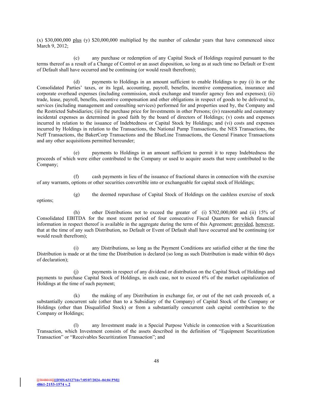(x) $30,000,000 plus (y) $20,000,000 multiplied by the number of calendar years that have commenced since March 9, 2012; (c) any purchase or redemption of any Capital Stock of Holdings required pursuant to the terms thereof as a result of a Change of Control or an asset disposition, so long as at such time no Default or Event of Default shall have occurred and be continuing (or would result therefrom); (d) payments to Holdings in an amount sufficient to enable Holdings to pay (i) its or the Consolidated Parties’ taxes, or its legal, accounting, payroll, benefits, incentive compensation, insurance and corporate overhead expenses (including commission, stock exchange and transfer agency fees and expenses); (ii) trade, lease, payroll, benefits, incentive compensation and other obligations in respect of goods to be delivered to, services (including management and consulting services) performed for and properties used by, the Company and the Restricted Subsidiaries; (iii) the purchase price for Investments in other Persons; (iv) reasonable and customary incidental expenses as determined in good faith by the board of directors of Holdings; (v) costs and expenses incurred in relation to the issuance of Indebtedness or Capital Stock by Holdings; and (vi) costs and expenses incurred by Holdings in relation to the Transactions, the National Pump Transactions, the NES Transactions, the Neff Transactions, the BakerCorp Transactions and the BlueLine Transactions, the General Finance Transactions and any other acquisitions permitted hereunder; (e) payments to Holdings in an amount sufficient to permit it to repay Indebtedness the proceeds of which were either contributed to the Company or used to acquire assets that were contributed to the Company; (f) cash payments in lieu of the issuance of fractional shares in connection with the exercise of any warrants, options or other securities convertible into or exchangeable for capital stock of Holdings; (g) the deemed repurchase of Capital Stock of Holdings on the cashless exercise of stock options; (h) other Distributions not to exceed the greater of (i) $702,000,000 and (ii) 15% of Consolidated EBITDA for the most recent period of four consecutive Fiscal Quarters for which financial information in respect thereof is available in the aggregate during the term of this Agreement; provided, however, that at the time of any such Distribution, no Default or Event of Default shall have occurred and be continuing (or would result therefrom); (i) any Distributions, so long as the Payment Conditions are satisfied either at the time the Distribution is made or at the time the Distribution is declared (so long as such Distribution is made within 60 days of declaration); (j) payments in respect of any dividend or distribution on the Capital Stock of Holdings and payments to purchase Capital Stock of Holdings, in each case, not to exceed 6% of the market capitalization of Holdings at the time of such payment; (k) the making of any Distribution in exchange for, or out of the net cash proceeds of, a substantially concurrent sale (other than to a Subsidiary of the Company) of Capital Stock of the Company or Holdings (other than Disqualified Stock) or from a substantially concurrent cash capital contribution to the Company or Holdings; (l) any Investment made in a Special Purpose Vehicle in connection with a Securitization Transaction, which Investment consists of the assets described in the definition of “Equipment Securitization Transaction” or “Receivables Securitization Transaction”; and 48 [[5848018]][[DMS:6312716v7:05/07/2024--04:04 PM]] 4861-2153-1574 v.2