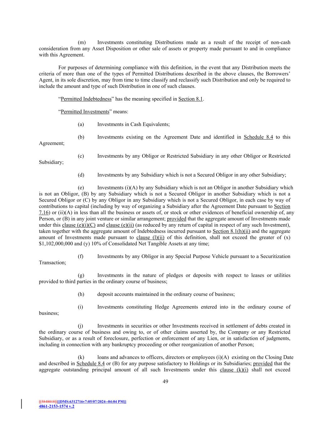 (m) Investments constituting Distributions made as a result of the receipt of non-cash consideration from any Asset Disposition or other sale of assets or property made pursuant to and in compliance with this Agreement. For purposes of determining compliance with this definition, in the event that any Distribution meets the criteria of more than one of the types of Permitted Distributions described in the above clauses, the Borrowers’ Agent, in its sole discretion, may from time to time classify and reclassify such Distribution and only be required to include the amount and type of such Distribution in one of such clauses. “Permitted Indebtedness” has the meaning specified in Section 8.1. “Permitted Investments” means: (a) Investments in Cash Equivalents; (b) Investments existing on the Agreement Date and identified in Schedule 8.4 to this Agreement; (c) Investments by any Obligor or Restricted Subsidiary in any other Obligor or Restricted Subsidiary; (d) Investments by any Subsidiary which is not a Secured Obligor in any other Subsidiary; (e) Investments (i)(A) by any Subsidiary which is not an Obligor in another Subsidiary which is not an Obligor, (B) by any Subsidiary which is not a Secured Obligor in another Subsidiary which is not a Secured Obligor or (C) by any Obligor in any Subsidiary which is not a Secured Obligor, in each case by way of contributions to capital (including by way of organizing a Subsidiary after the Agreement Date pursuant to Section 7.16) or (ii)(A) in less than all the business or assets of, or stock or other evidences of beneficial ownership of, any Person, or (B) in any joint venture or similar arrangement; provided that the aggregate amount of Investments made under this clause (e)(i)(C) and clause (e)(ii) (as reduced by any return of capital in respect of any such Investment), taken together with the aggregate amount of Indebtedness incurred pursuant to Section 8.1(h)(ii) and the aggregate amount of Investments made pursuant to clause (l)(ii) of this definition, shall not exceed the greater of (x) $1,102,000,000 and (y) 10% of Consolidated Net Tangible Assets at any time; (f) Investments by any Obligor in any Special Purpose Vehicle pursuant to a Securitization Transaction; (g) Investments in the nature of pledges or deposits with respect to leases or utilities provided to third parties in the ordinary course of business; (h) deposit accounts maintained in the ordinary course of business; (i) Investments constituting Hedge Agreements entered into in the ordinary course of business; (j) Investments in securities or other Investments received in settlement of debts created in the ordinary course of business and owing to, or of other claims asserted by, the Company or any Restricted Subsidiary, or as a result of foreclosure, perfection or enforcement of any Lien, or in satisfaction of judgments, including in connection with any bankruptcy proceeding or other reorganization of another Person; (k) loans and advances to officers, directors or employees (i)(A) existing on the Closing Date and described in Schedule 8.4 or (B) for any purpose satisfactory to Holdings or its Subsidiaries; provided that the aggregate outstanding principal amount of all such Investments under this clause (k)(i) shall not exceed 49 [[5848018]][[DMS:6312716v7:05/07/2024--04:04 PM]] 4861-2153-1574 v.2