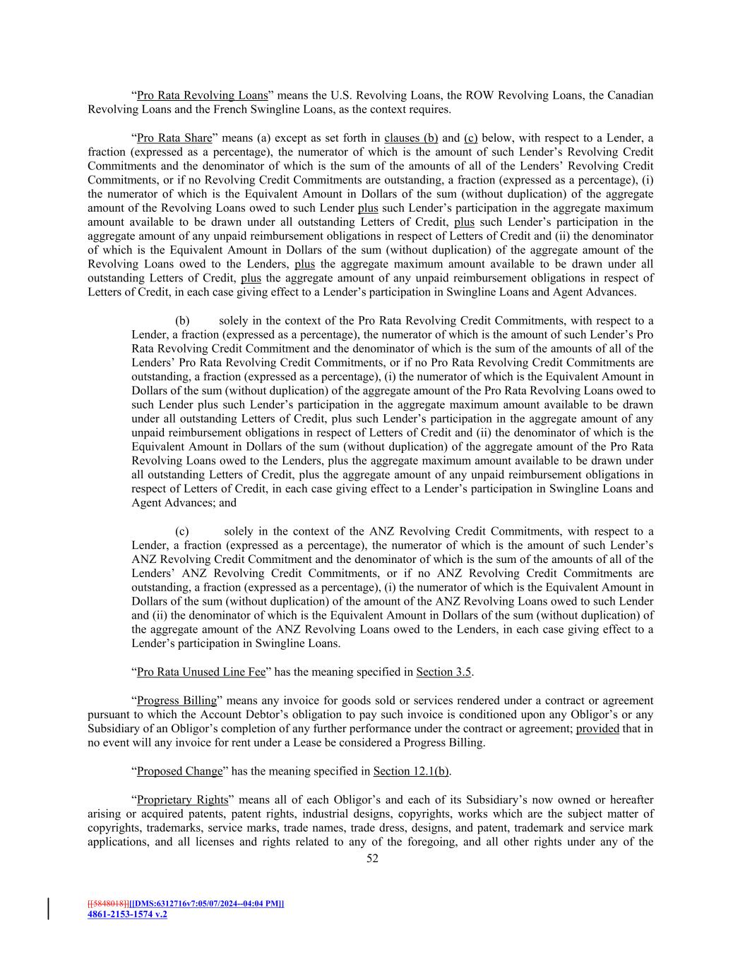 “Pro Rata Revolving Loans” means the U.S. Revolving Loans, the ROW Revolving Loans, the Canadian Revolving Loans and the French Swingline Loans, as the context requires. “Pro Rata Share” means (a) except as set forth in clauses (b) and (c) below, with respect to a Lender, a fraction (expressed as a percentage), the numerator of which is the amount of such Lender’s Revolving Credit Commitments and the denominator of which is the sum of the amounts of all of the Lenders’ Revolving Credit Commitments, or if no Revolving Credit Commitments are outstanding, a fraction (expressed as a percentage), (i) the numerator of which is the Equivalent Amount in Dollars of the sum (without duplication) of the aggregate amount of the Revolving Loans owed to such Lender plus such Lender’s participation in the aggregate maximum amount available to be drawn under all outstanding Letters of Credit, plus such Lender’s participation in the aggregate amount of any unpaid reimbursement obligations in respect of Letters of Credit and (ii) the denominator of which is the Equivalent Amount in Dollars of the sum (without duplication) of the aggregate amount of the Revolving Loans owed to the Lenders, plus the aggregate maximum amount available to be drawn under all outstanding Letters of Credit, plus the aggregate amount of any unpaid reimbursement obligations in respect of Letters of Credit, in each case giving effect to a Lender’s participation in Swingline Loans and Agent Advances. (b) solely in the context of the Pro Rata Revolving Credit Commitments, with respect to a Lender, a fraction (expressed as a percentage), the numerator of which is the amount of such Lender’s Pro Rata Revolving Credit Commitment and the denominator of which is the sum of the amounts of all of the Lenders’ Pro Rata Revolving Credit Commitments, or if no Pro Rata Revolving Credit Commitments are outstanding, a fraction (expressed as a percentage), (i) the numerator of which is the Equivalent Amount in Dollars of the sum (without duplication) of the aggregate amount of the Pro Rata Revolving Loans owed to such Lender plus such Lender’s participation in the aggregate maximum amount available to be drawn under all outstanding Letters of Credit, plus such Lender’s participation in the aggregate amount of any unpaid reimbursement obligations in respect of Letters of Credit and (ii) the denominator of which is the Equivalent Amount in Dollars of the sum (without duplication) of the aggregate amount of the Pro Rata Revolving Loans owed to the Lenders, plus the aggregate maximum amount available to be drawn under all outstanding Letters of Credit, plus the aggregate amount of any unpaid reimbursement obligations in respect of Letters of Credit, in each case giving effect to a Lender’s participation in Swingline Loans and Agent Advances; and (c) solely in the context of the ANZ Revolving Credit Commitments, with respect to a Lender, a fraction (expressed as a percentage), the numerator of which is the amount of such Lender’s ANZ Revolving Credit Commitment and the denominator of which is the sum of the amounts of all of the Lenders’ ANZ Revolving Credit Commitments, or if no ANZ Revolving Credit Commitments are outstanding, a fraction (expressed as a percentage), (i) the numerator of which is the Equivalent Amount in Dollars of the sum (without duplication) of the amount of the ANZ Revolving Loans owed to such Lender and (ii) the denominator of which is the Equivalent Amount in Dollars of the sum (without duplication) of the aggregate amount of the ANZ Revolving Loans owed to the Lenders, in each case giving effect to a Lender’s participation in Swingline Loans. “Pro Rata Unused Line Fee” has the meaning specified in Section 3.5. “Progress Billing” means any invoice for goods sold or services rendered under a contract or agreement pursuant to which the Account Debtor’s obligation to pay such invoice is conditioned upon any Obligor’s or any Subsidiary of an Obligor’s completion of any further performance under the contract or agreement; provided that in no event will any invoice for rent under a Lease be considered a Progress Billing. “Proposed Change” has the meaning specified in Section 12.1(b). “Proprietary Rights” means all of each Obligor’s and each of its Subsidiary’s now owned or hereafter arising or acquired patents, patent rights, industrial designs, copyrights, works which are the subject matter of copyrights, trademarks, service marks, trade names, trade dress, designs, and patent, trademark and service mark applications, and all licenses and rights related to any of the foregoing, and all other rights under any of the 52 [[5848018]][[DMS:6312716v7:05/07/2024--04:04 PM]] 4861-2153-1574 v.2
