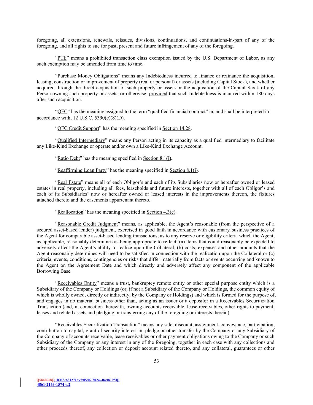 foregoing, all extensions, renewals, reissues, divisions, continuations, and continuations-in-part of any of the foregoing, and all rights to sue for past, present and future infringement of any of the foregoing. “PTE” means a prohibited transaction class exemption issued by the U.S. Department of Labor, as any such exemption may be amended from time to time. “Purchase Money Obligations” means any Indebtedness incurred to finance or refinance the acquisition, leasing, construction or improvement of property (real or personal) or assets (including Capital Stock), and whether acquired through the direct acquisition of such property or assets or the acquisition of the Capital Stock of any Person owning such property or assets, or otherwise; provided that such Indebtedness is incurred within 180 days after such acquisition. “QFC” has the meaning assigned to the term “qualified financial contract” in, and shall be interpreted in accordance with, 12 U.S.C. 5390(c)(8)(D). “QFC Credit Support” has the meaning specified in Section 14.28. “Qualified Intermediary” means any Person acting in its capacity as a qualified intermediary to facilitate any Like-Kind Exchange or operate and/or own a Like-Kind Exchange Account. “Ratio Debt” has the meaning specified in Section 8.1(j). “Reaffirming Loan Party” has the meaning specified in Section 8.1(j). “Real Estate” means all of each Obligor’s and each of its Subsidiaries now or hereafter owned or leased estates in real property, including all fees, leaseholds and future interests, together with all of each Obligor’s and each of its Subsidiaries’ now or hereafter owned or leased interests in the improvements thereon, the fixtures attached thereto and the easements appurtenant thereto. “Reallocation” has the meaning specified in Section 4.3(c). “Reasonable Credit Judgment” means, as applicable, the Agent’s reasonable (from the perspective of a secured asset-based lender) judgment, exercised in good faith in accordance with customary business practices of the Agent for comparable asset-based lending transactions, as to any reserve or eligibility criteria which the Agent, as applicable, reasonably determines as being appropriate to reflect: (a) items that could reasonably be expected to adversely affect the Agent’s ability to realize upon the Collateral, (b) costs, expenses and other amounts that the Agent reasonably determines will need to be satisfied in connection with the realization upon the Collateral or (c) criteria, events, conditions, contingencies or risks that differ materially from facts or events occurring and known to the Agent on the Agreement Date and which directly and adversely affect any component of the applicable Borrowing Base. “Receivables Entity” means a trust, bankruptcy remote entity or other special purpose entity which is a Subsidiary of the Company or Holdings (or, if not a Subsidiary of the Company or Holdings, the common equity of which is wholly owned, directly or indirectly, by the Company or Holdings) and which is formed for the purpose of, and engages in no material business other than, acting as an issuer or a depositor in a Receivables Securitization Transaction (and, in connection therewith, owning accounts receivable, lease receivables, other rights to payment, leases and related assets and pledging or transferring any of the foregoing or interests therein). “Receivables Securitization Transaction” means any sale, discount, assignment, conveyance, participation, contribution to capital, grant of security interest in, pledge or other transfer by the Company or any Subsidiary of the Company of accounts receivable, lease receivables or other payment obligations owing to the Company or such Subsidiary of the Company or any interest in any of the foregoing, together in each case with any collections and other proceeds thereof, any collection or deposit account related thereto, and any collateral, guarantees or other 53 [[5848018]][[DMS:6312716v7:05/07/2024--04:04 PM]] 4861-2153-1574 v.2