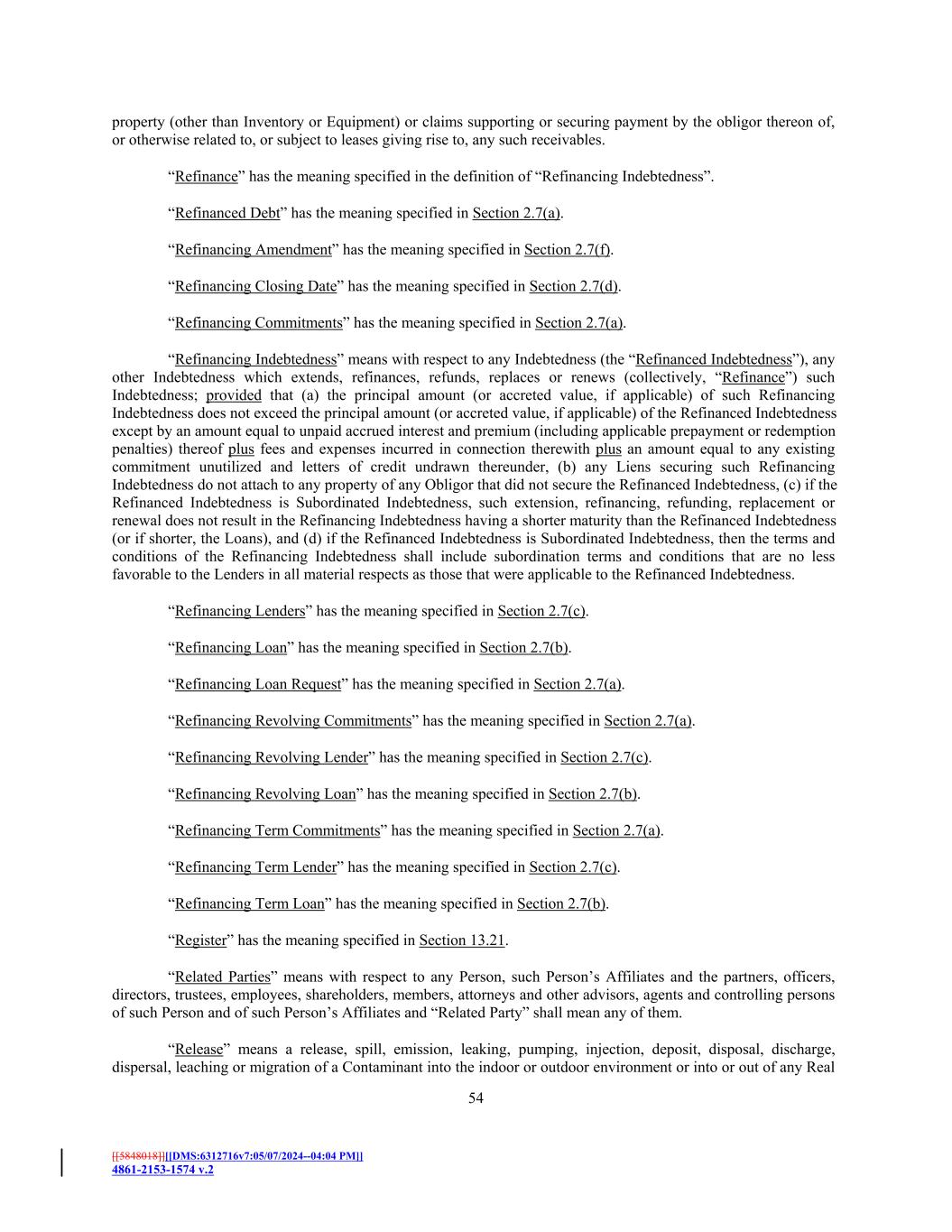 property (other than Inventory or Equipment) or claims supporting or securing payment by the obligor thereon of, or otherwise related to, or subject to leases giving rise to, any such receivables. “Refinance” has the meaning specified in the definition of “Refinancing Indebtedness”. “Refinanced Debt” has the meaning specified in Section 2.7(a). “Refinancing Amendment” has the meaning specified in Section 2.7(f). “Refinancing Closing Date” has the meaning specified in Section 2.7(d). “Refinancing Commitments” has the meaning specified in Section 2.7(a). “Refinancing Indebtedness” means with respect to any Indebtedness (the “Refinanced Indebtedness”), any other Indebtedness which extends, refinances, refunds, replaces or renews (collectively, “Refinance”) such Indebtedness; provided that (a) the principal amount (or accreted value, if applicable) of such Refinancing Indebtedness does not exceed the principal amount (or accreted value, if applicable) of the Refinanced Indebtedness except by an amount equal to unpaid accrued interest and premium (including applicable prepayment or redemption penalties) thereof plus fees and expenses incurred in connection therewith plus an amount equal to any existing commitment unutilized and letters of credit undrawn thereunder, (b) any Liens securing such Refinancing Indebtedness do not attach to any property of any Obligor that did not secure the Refinanced Indebtedness, (c) if the Refinanced Indebtedness is Subordinated Indebtedness, such extension, refinancing, refunding, replacement or renewal does not result in the Refinancing Indebtedness having a shorter maturity than the Refinanced Indebtedness (or if shorter, the Loans), and (d) if the Refinanced Indebtedness is Subordinated Indebtedness, then the terms and conditions of the Refinancing Indebtedness shall include subordination terms and conditions that are no less favorable to the Lenders in all material respects as those that were applicable to the Refinanced Indebtedness. “Refinancing Lenders” has the meaning specified in Section 2.7(c). “Refinancing Loan” has the meaning specified in Section 2.7(b). “Refinancing Loan Request” has the meaning specified in Section 2.7(a). “Refinancing Revolving Commitments” has the meaning specified in Section 2.7(a). “Refinancing Revolving Lender” has the meaning specified in Section 2.7(c). “Refinancing Revolving Loan” has the meaning specified in Section 2.7(b). “Refinancing Term Commitments” has the meaning specified in Section 2.7(a). “Refinancing Term Lender” has the meaning specified in Section 2.7(c). “Refinancing Term Loan” has the meaning specified in Section 2.7(b). “Register” has the meaning specified in Section 13.21. “Related Parties” means with respect to any Person, such Person’s Affiliates and the partners, officers, directors, trustees, employees, shareholders, members, attorneys and other advisors, agents and controlling persons of such Person and of such Person’s Affiliates and “Related Party” shall mean any of them. “Release” means a release, spill, emission, leaking, pumping, injection, deposit, disposal, discharge, dispersal, leaching or migration of a Contaminant into the indoor or outdoor environment or into or out of any Real 54 [[5848018]][[DMS:6312716v7:05/07/2024--04:04 PM]] 4861-2153-1574 v.2