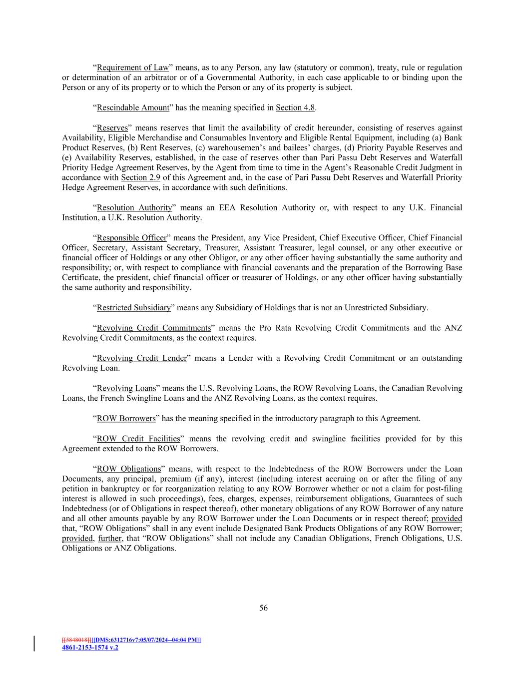 “Requirement of Law” means, as to any Person, any law (statutory or common), treaty, rule or regulation or determination of an arbitrator or of a Governmental Authority, in each case applicable to or binding upon the Person or any of its property or to which the Person or any of its property is subject. “Rescindable Amount” has the meaning specified in Section 4.8. “Reserves” means reserves that limit the availability of credit hereunder, consisting of reserves against Availability, Eligible Merchandise and Consumables Inventory and Eligible Rental Equipment, including (a) Bank Product Reserves, (b) Rent Reserves, (c) warehousemen’s and bailees’ charges, (d) Priority Payable Reserves and (e) Availability Reserves, established, in the case of reserves other than Pari Passu Debt Reserves and Waterfall Priority Hedge Agreement Reserves, by the Agent from time to time in the Agent’s Reasonable Credit Judgment in accordance with Section 2.9 of this Agreement and, in the case of Pari Passu Debt Reserves and Waterfall Priority Hedge Agreement Reserves, in accordance with such definitions. “Resolution Authority” means an EEA Resolution Authority or, with respect to any U.K. Financial Institution, a U.K. Resolution Authority. “Responsible Officer” means the President, any Vice President, Chief Executive Officer, Chief Financial Officer, Secretary, Assistant Secretary, Treasurer, Assistant Treasurer, legal counsel, or any other executive or financial officer of Holdings or any other Obligor, or any other officer having substantially the same authority and responsibility; or, with respect to compliance with financial covenants and the preparation of the Borrowing Base Certificate, the president, chief financial officer or treasurer of Holdings, or any other officer having substantially the same authority and responsibility. “Restricted Subsidiary” means any Subsidiary of Holdings that is not an Unrestricted Subsidiary. “Revolving Credit Commitments” means the Pro Rata Revolving Credit Commitments and the ANZ Revolving Credit Commitments, as the context requires. “Revolving Credit Lender” means a Lender with a Revolving Credit Commitment or an outstanding Revolving Loan. “Revolving Loans” means the U.S. Revolving Loans, the ROW Revolving Loans, the Canadian Revolving Loans, the French Swingline Loans and the ANZ Revolving Loans, as the context requires. “ROW Borrowers” has the meaning specified in the introductory paragraph to this Agreement. “ROW Credit Facilities” means the revolving credit and swingline facilities provided for by this Agreement extended to the ROW Borrowers. “ROW Obligations” means, with respect to the Indebtedness of the ROW Borrowers under the Loan Documents, any principal, premium (if any), interest (including interest accruing on or after the filing of any petition in bankruptcy or for reorganization relating to any ROW Borrower whether or not a claim for post-filing interest is allowed in such proceedings), fees, charges, expenses, reimbursement obligations, Guarantees of such Indebtedness (or of Obligations in respect thereof), other monetary obligations of any ROW Borrower of any nature and all other amounts payable by any ROW Borrower under the Loan Documents or in respect thereof; provided that, “ROW Obligations” shall in any event include Designated Bank Products Obligations of any ROW Borrower; provided, further, that “ROW Obligations” shall not include any Canadian Obligations, French Obligations, U.S. Obligations or ANZ Obligations. 56 [[5848018]][[DMS:6312716v7:05/07/2024--04:04 PM]] 4861-2153-1574 v.2
